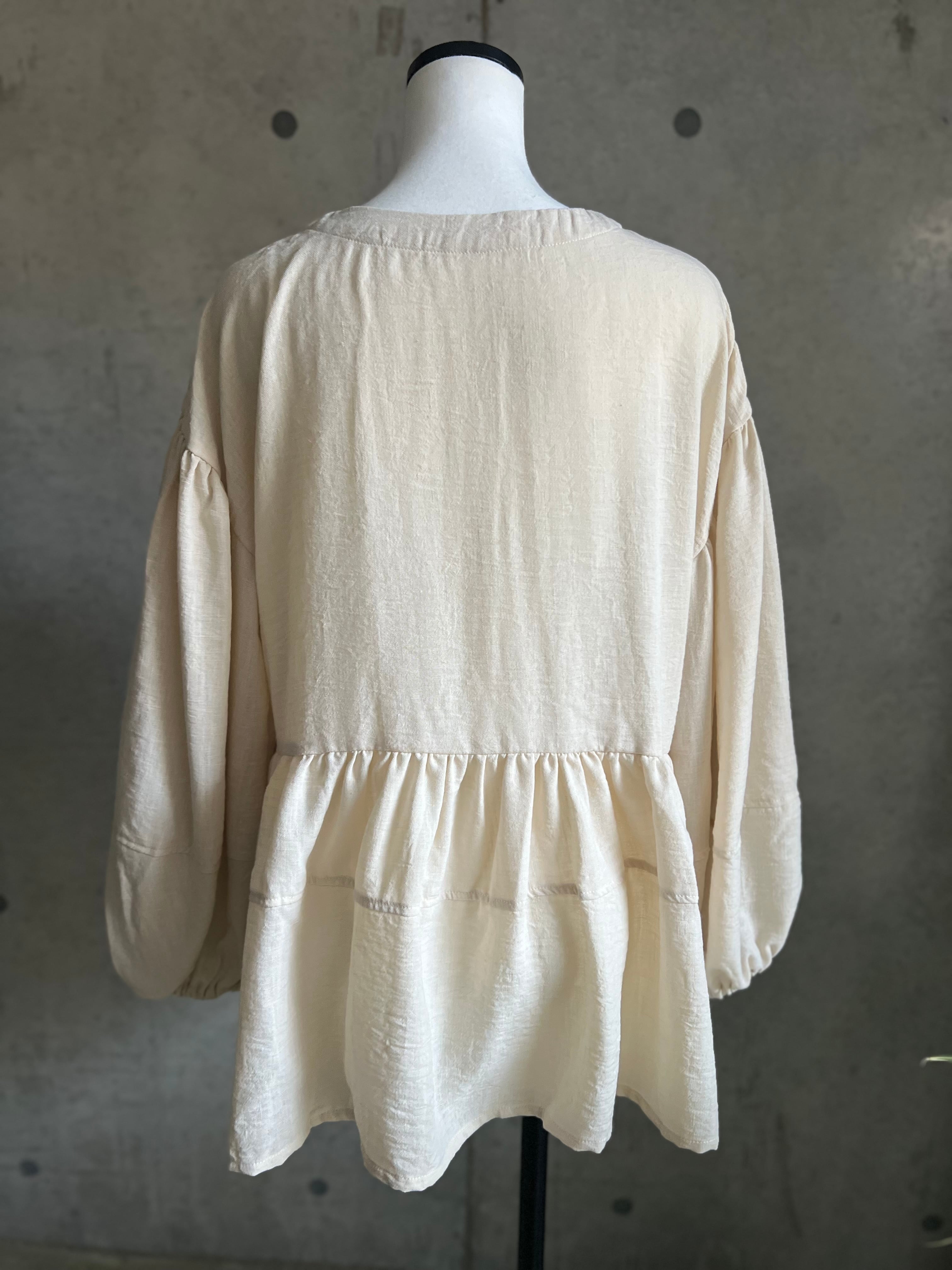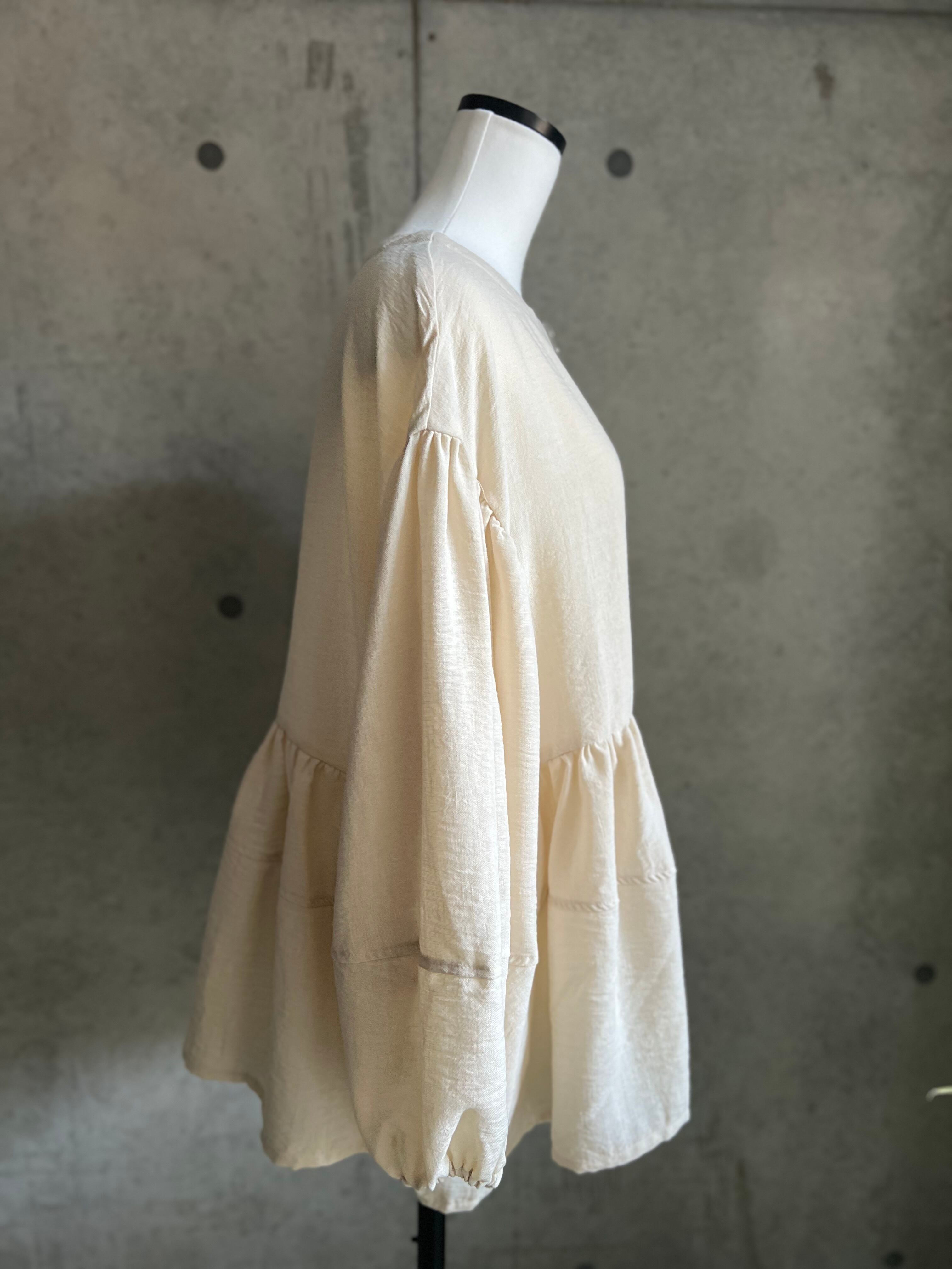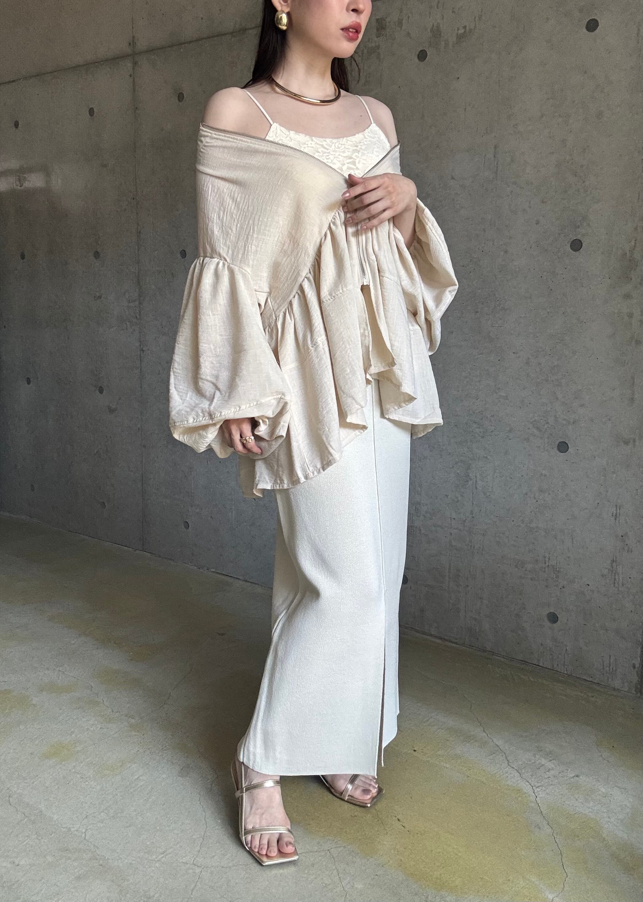ノーカラーデザインで首元はすっきりと、ボリューム感のある袖と裾のフレア感がバランスの良い1着✨