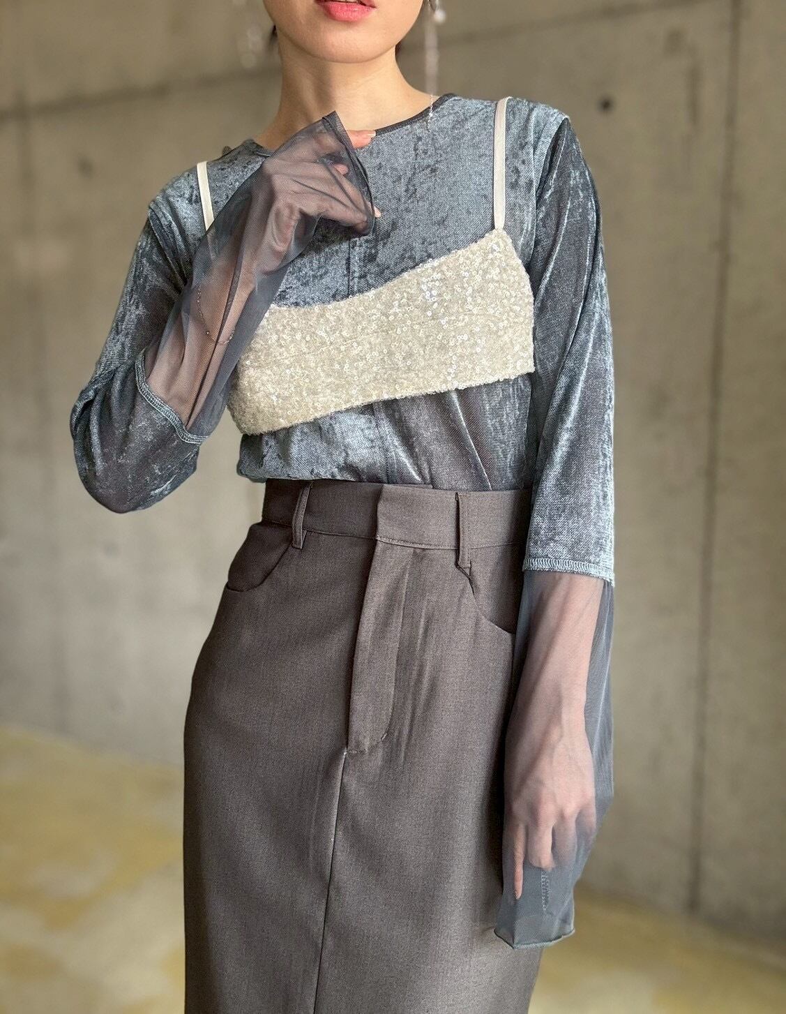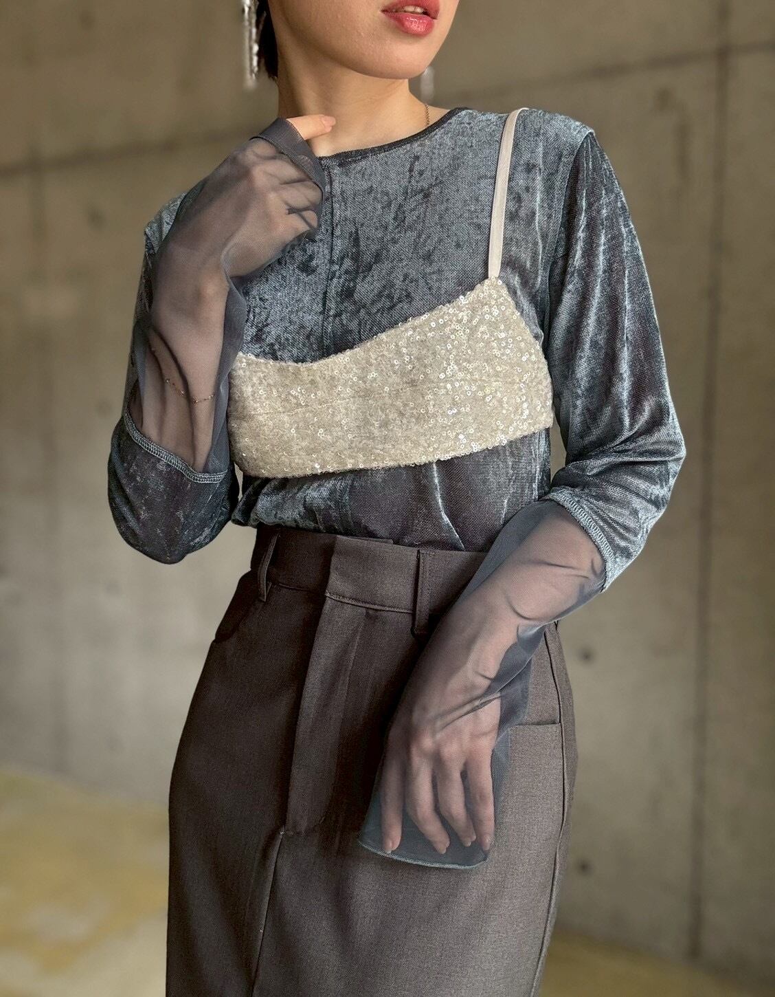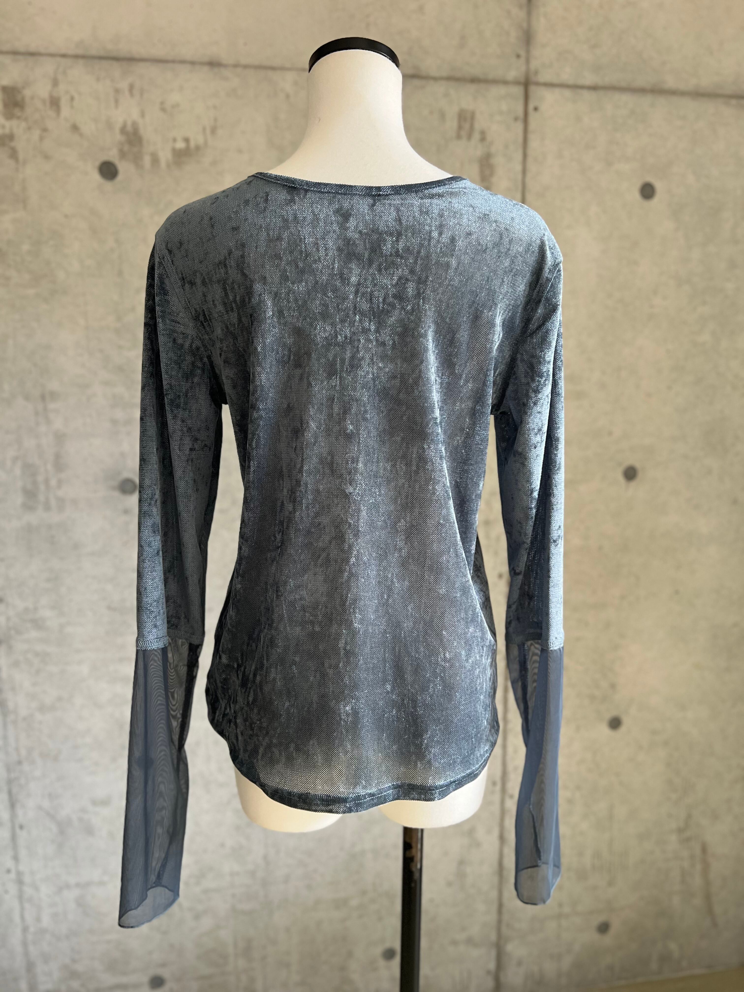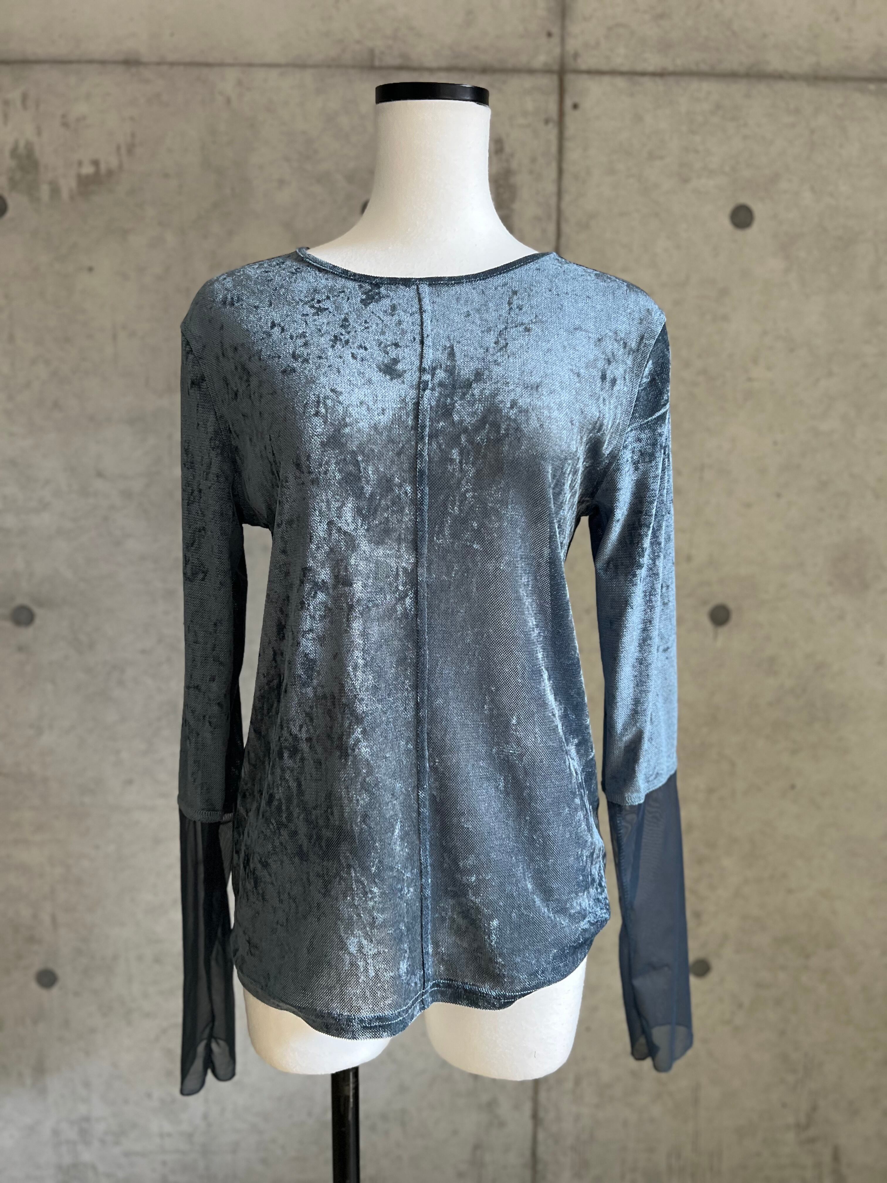 シアー感のあるベロア生地にメッシュのスリーブをドッキングさせた主役級トップス。