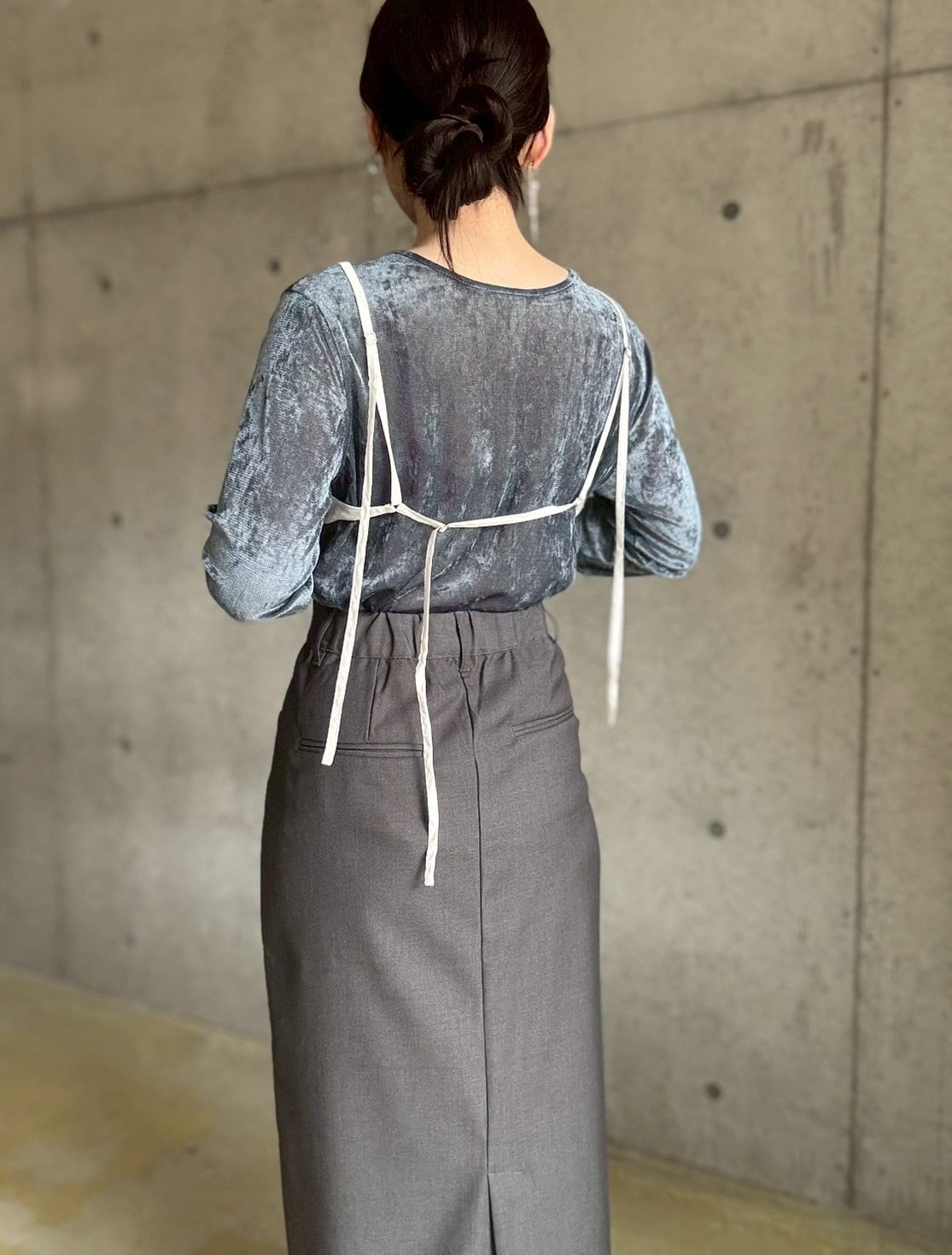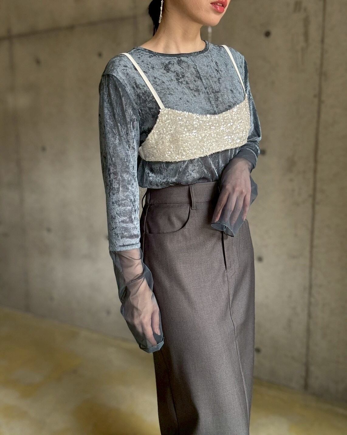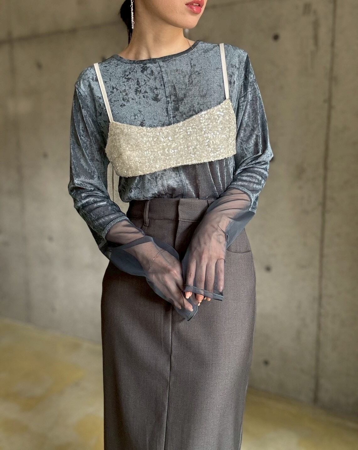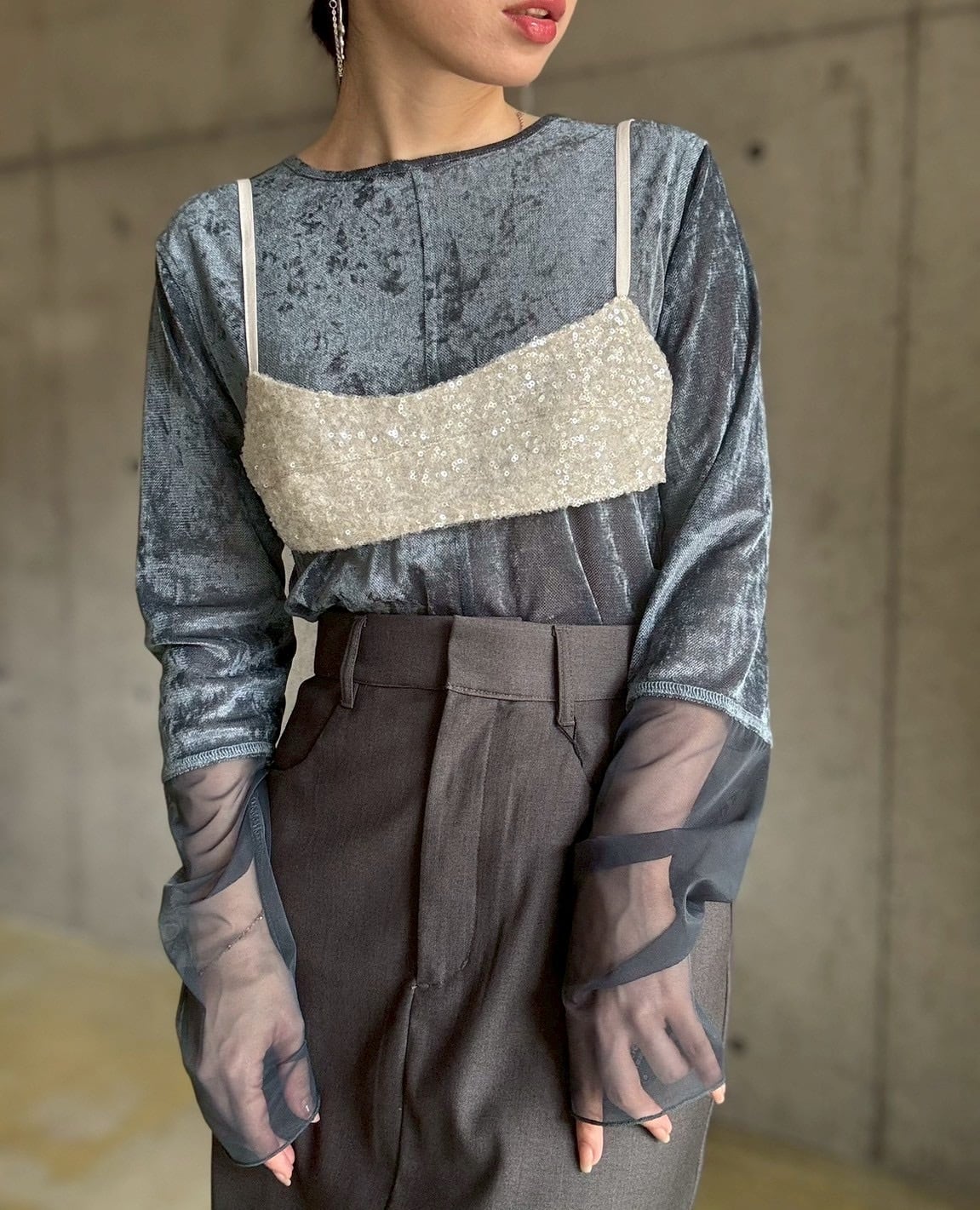 シアー感のあるベロア生地にメッシュのスリーブをドッキングさせた主役級トップス。