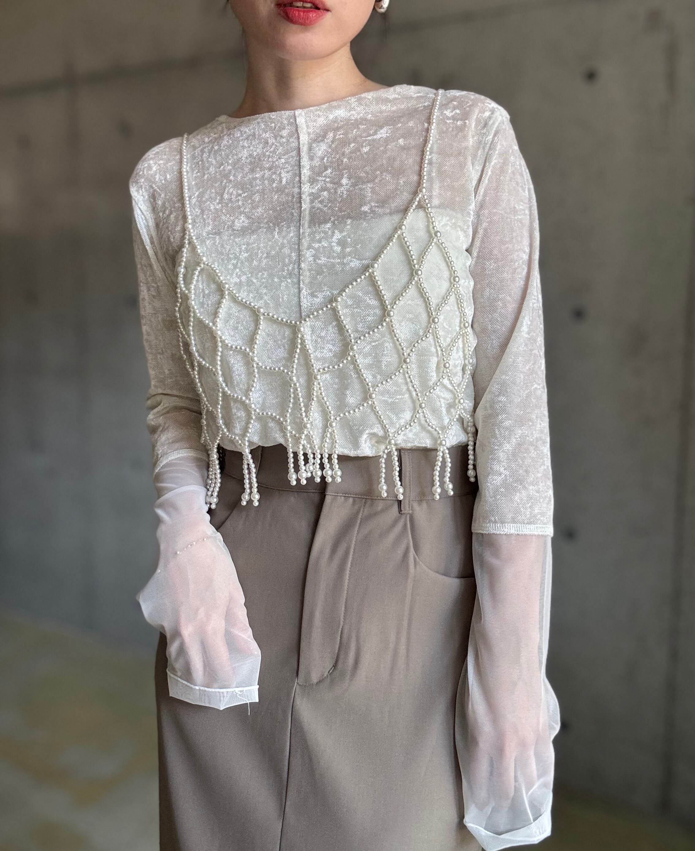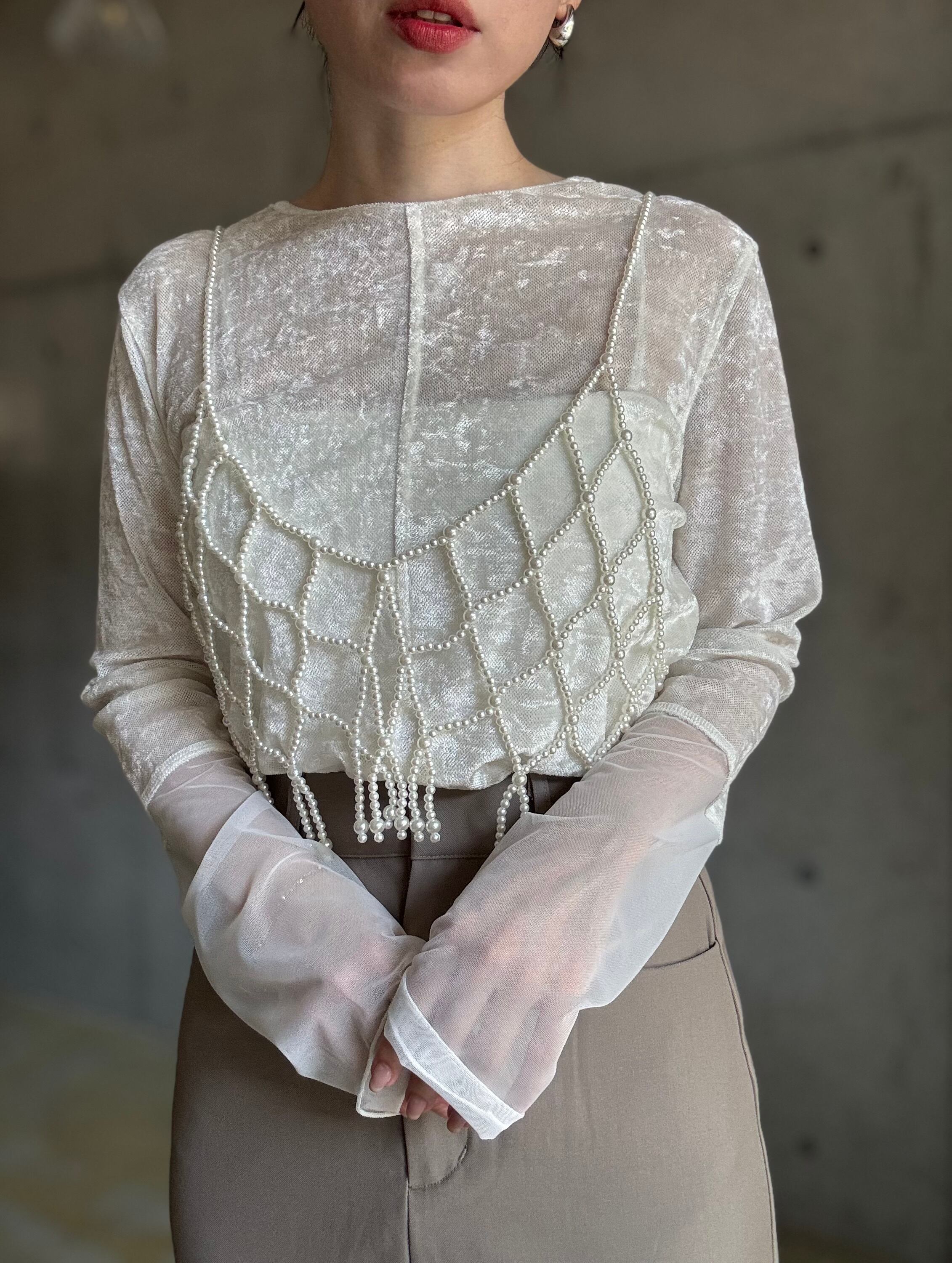 シアー感のあるベロア生地にメッシュのスリーブをドッキングさせた主役級トップス。