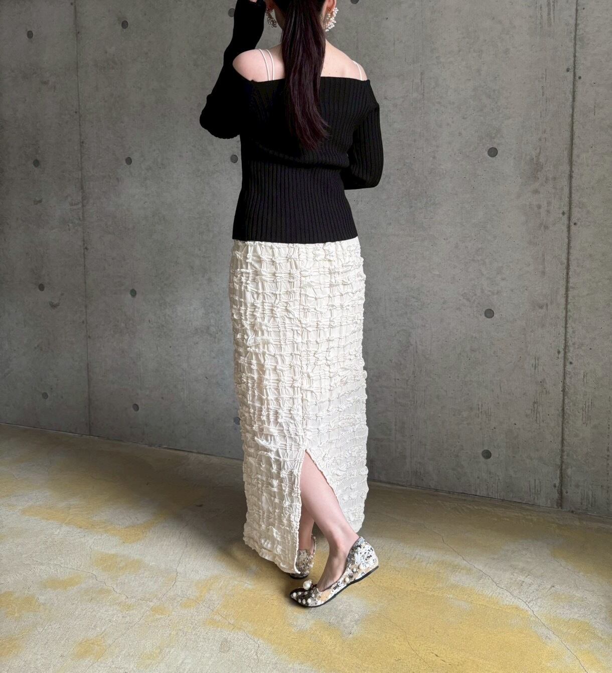 太めのリブニットは締め付け感もなく、オフショルが上がる心配もなくストレスフリーに着用していただけます✨