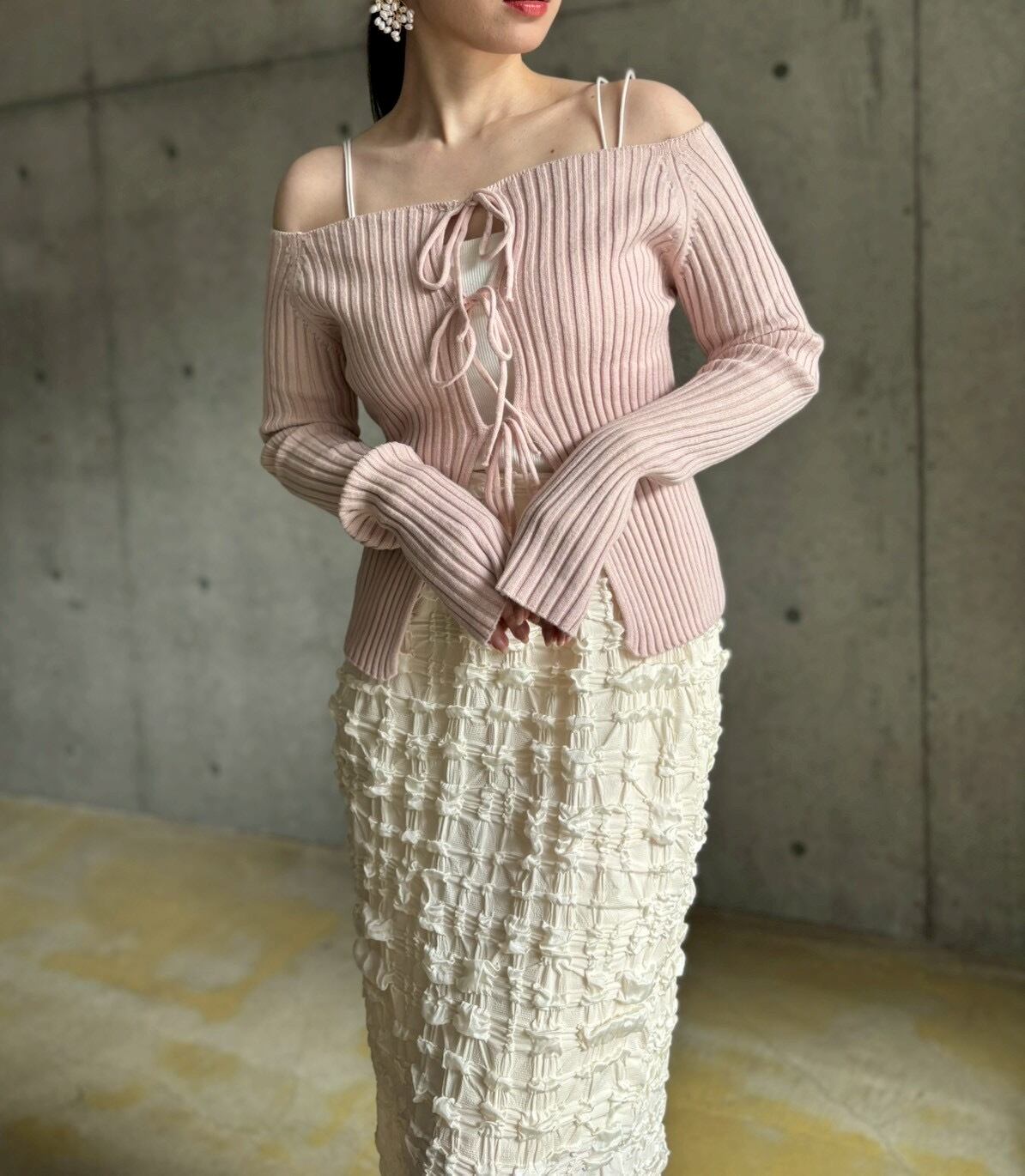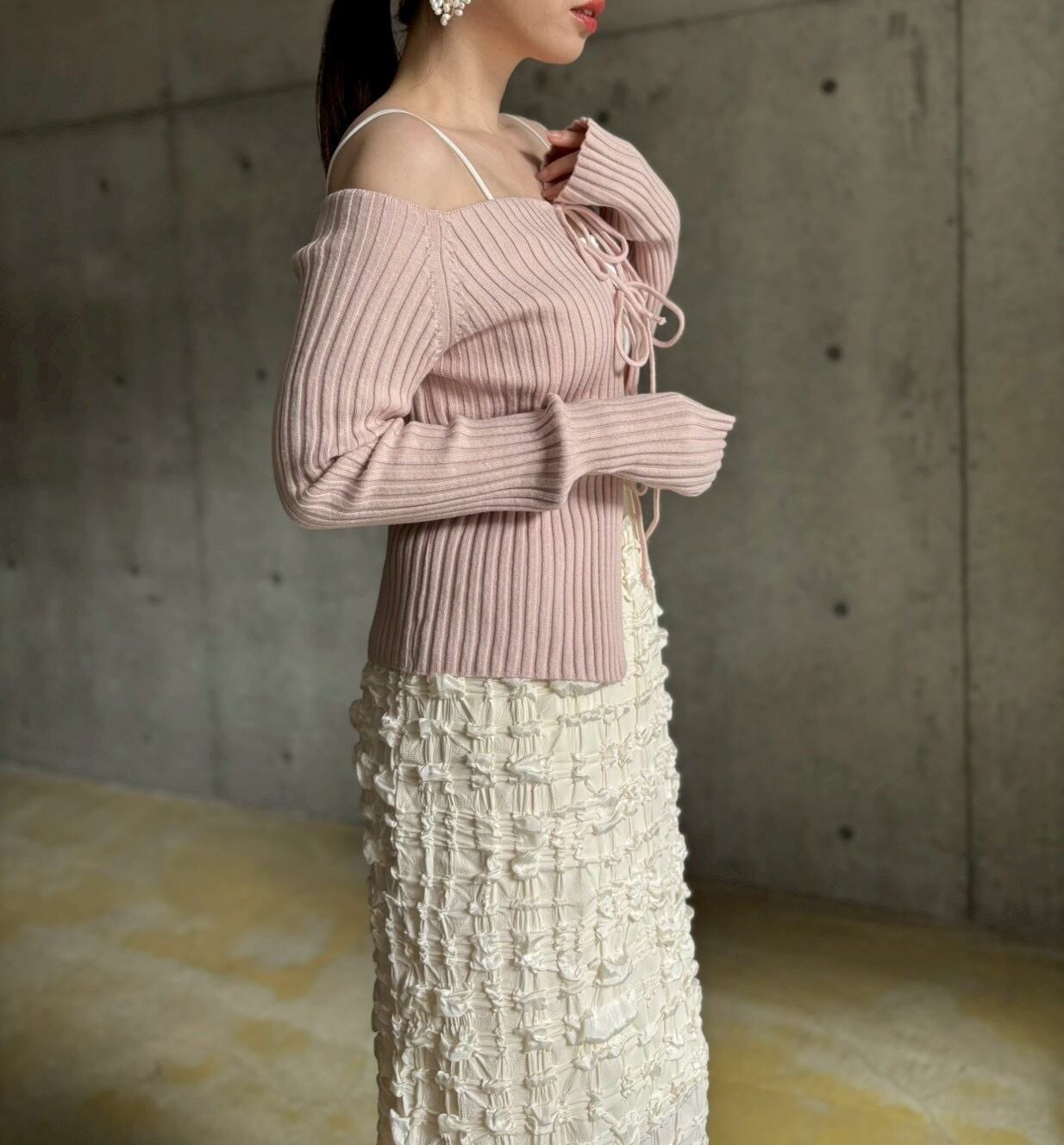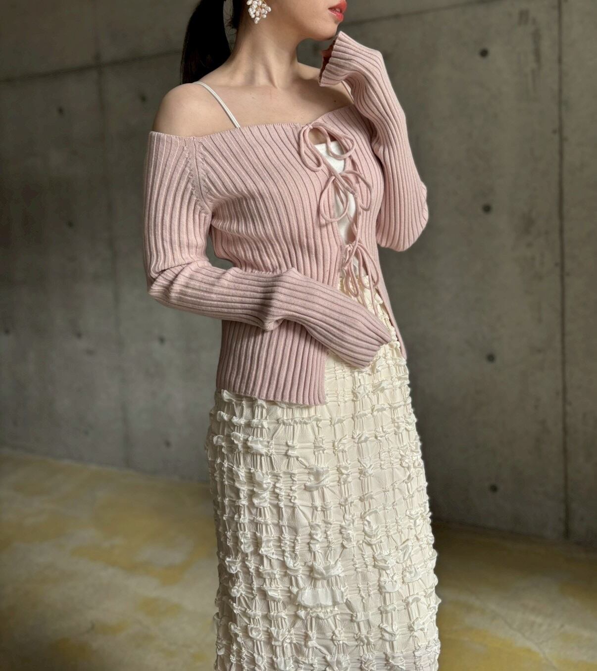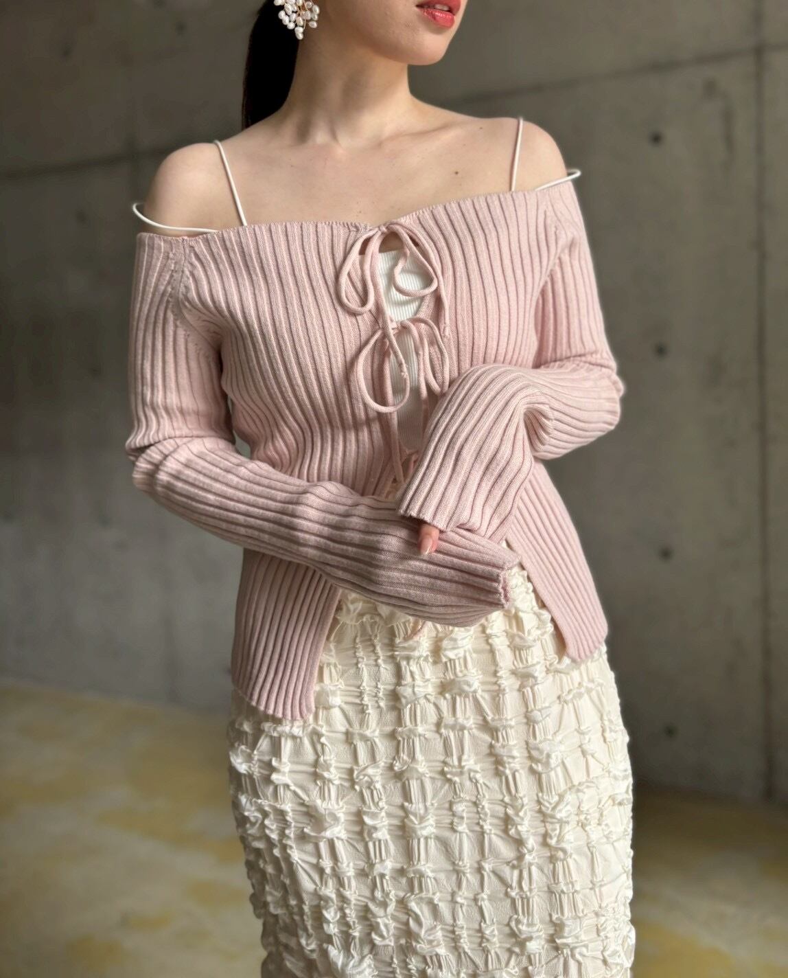 オフショル&リボンデザインが女性らしい印象のリブニットトップス✨