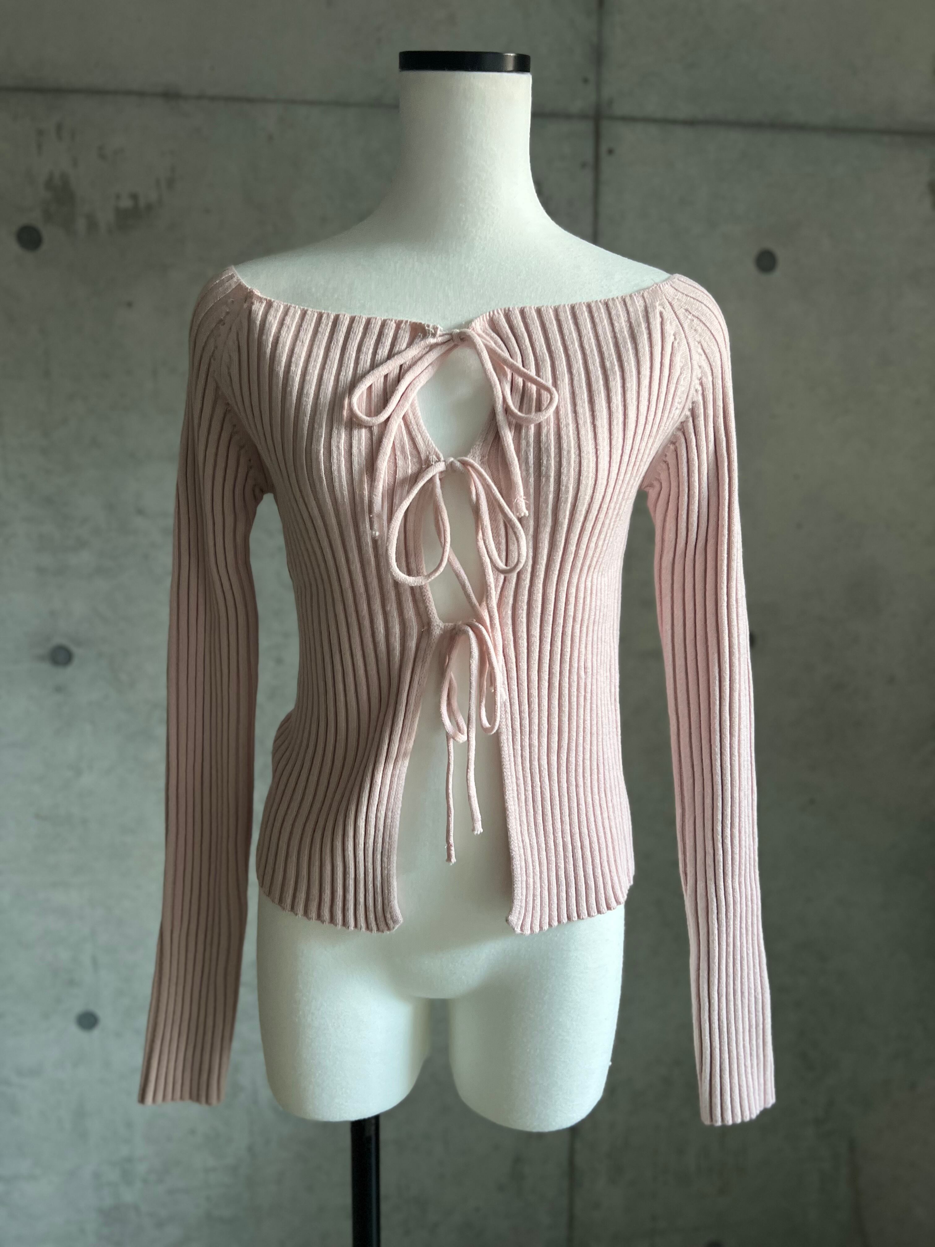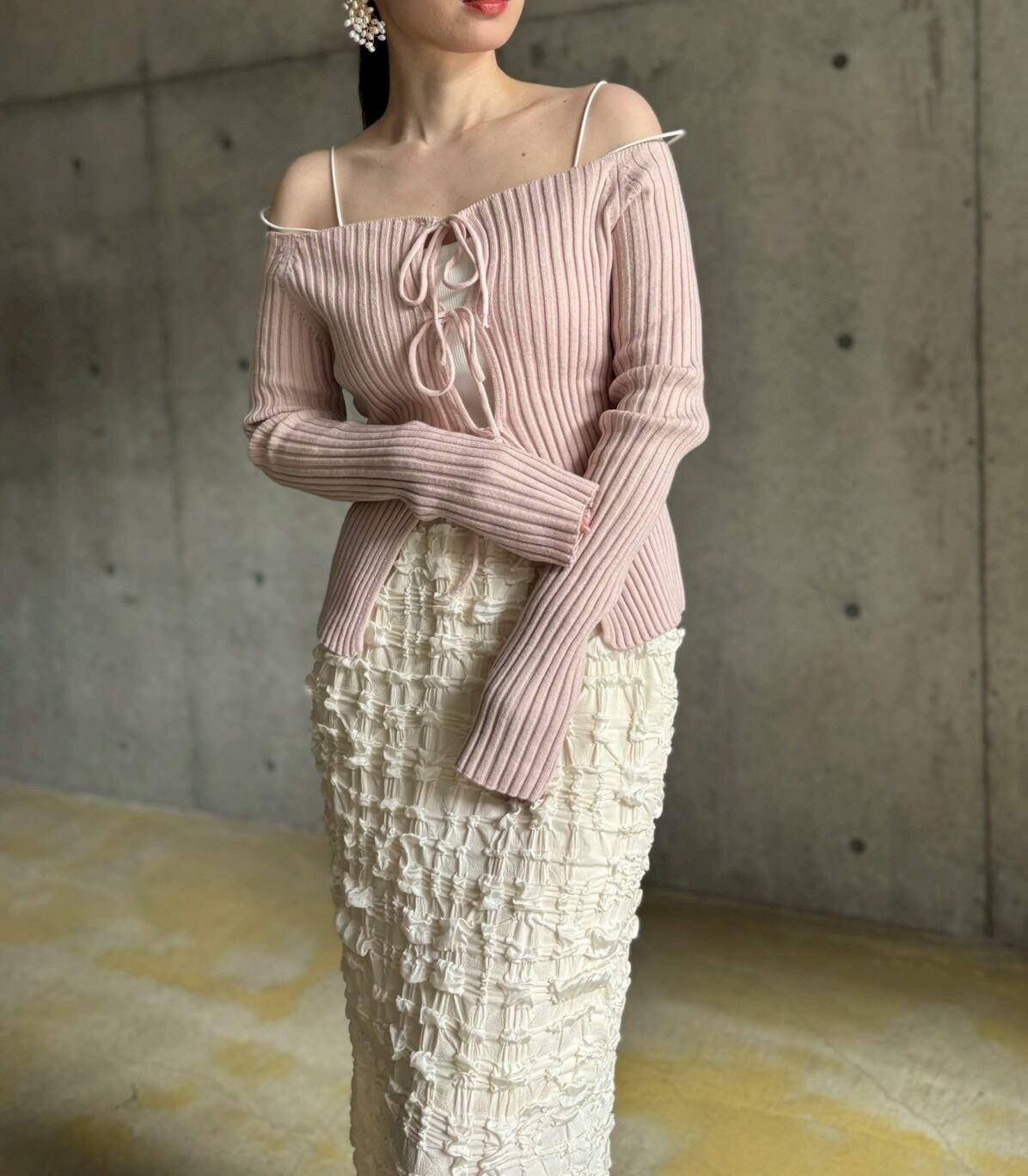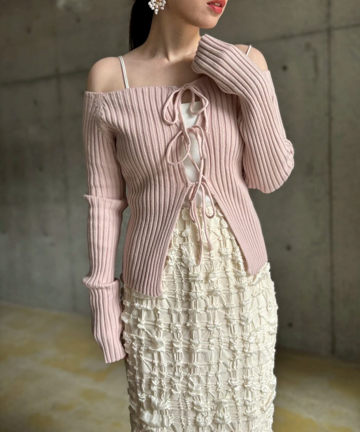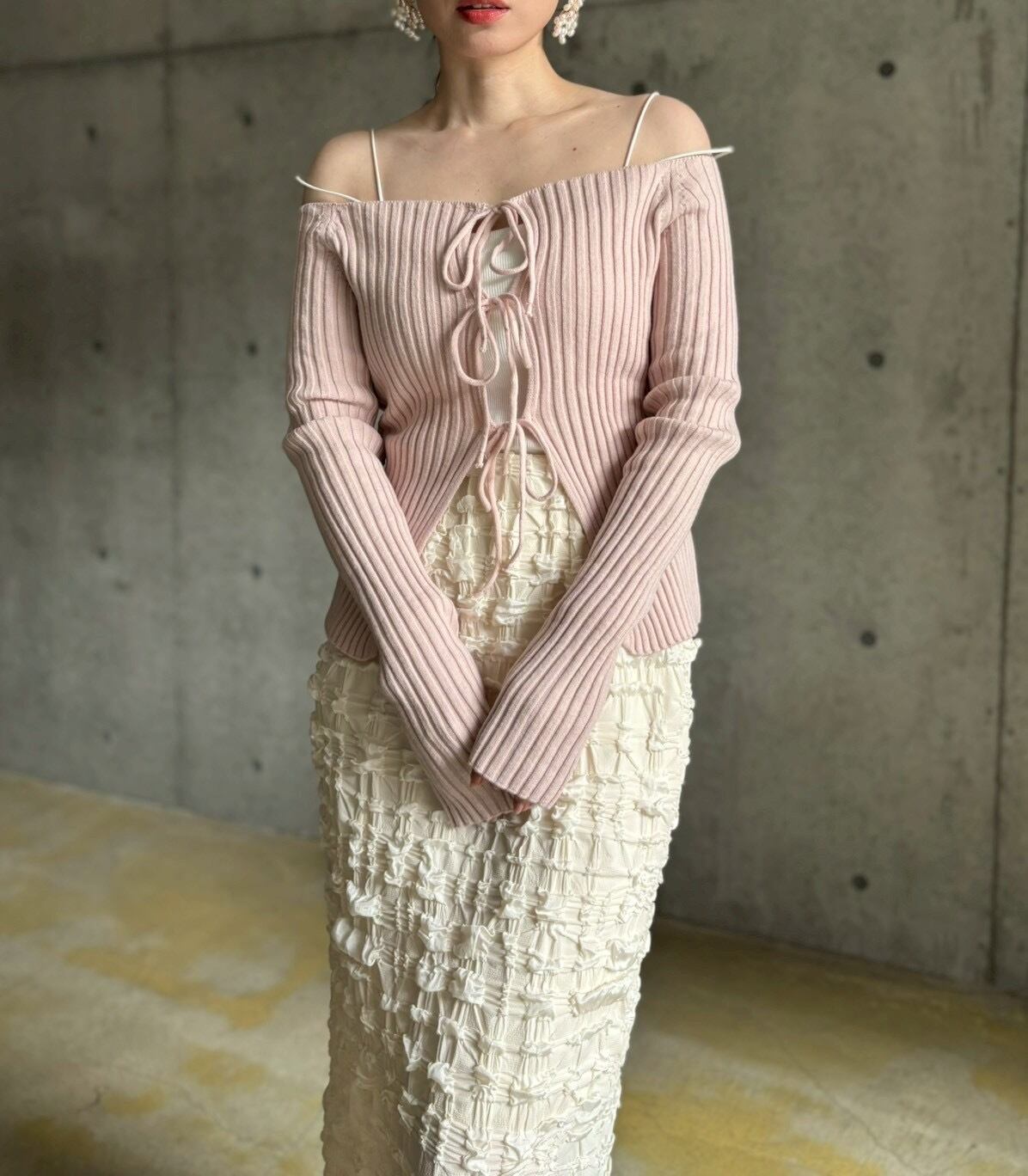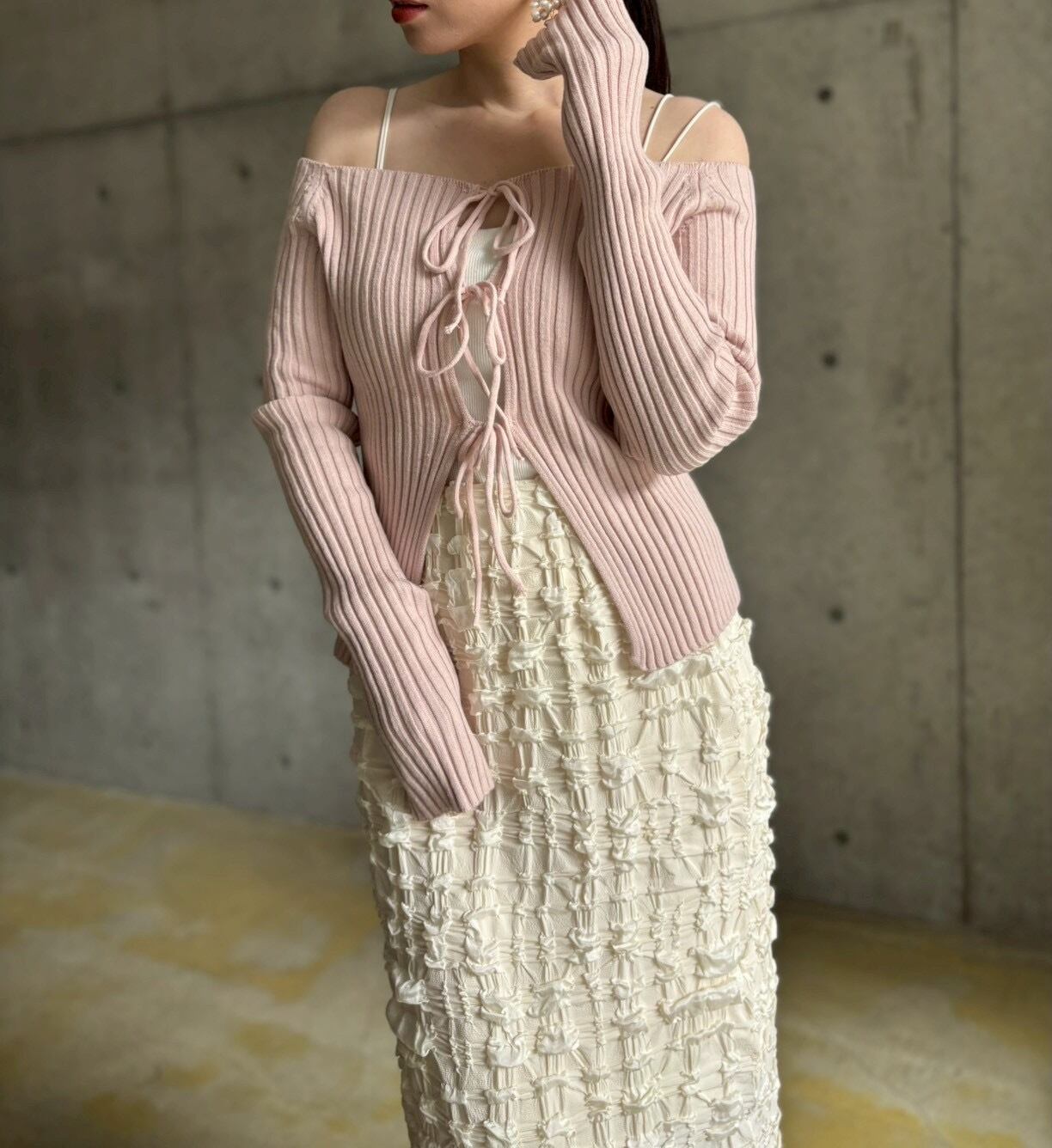 オフショル&リボンデザインが女性らしい印象のリブニットトップス✨