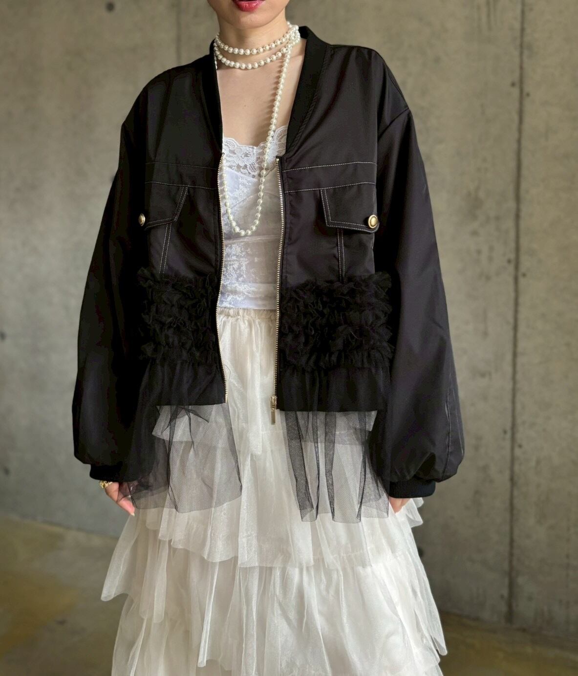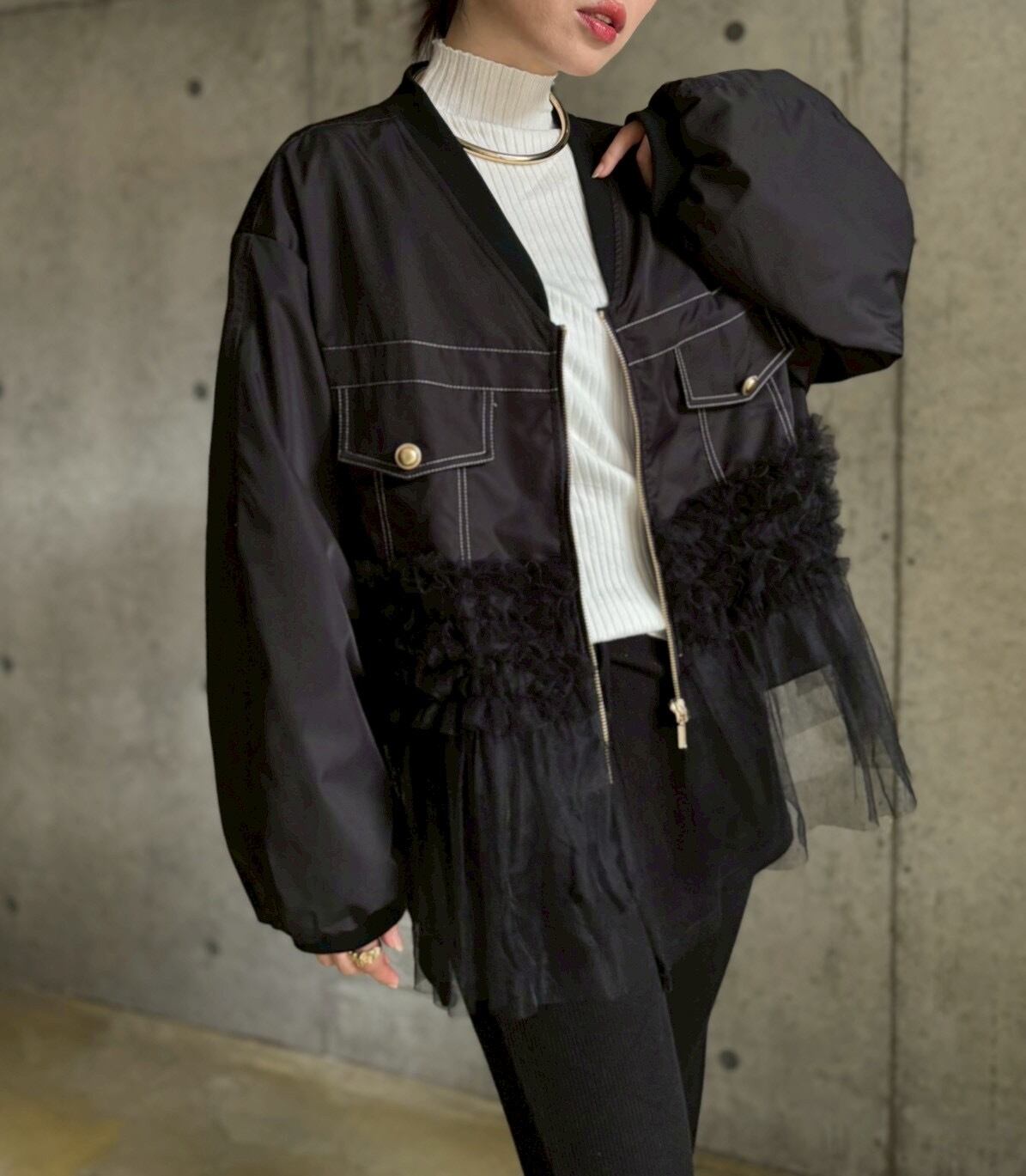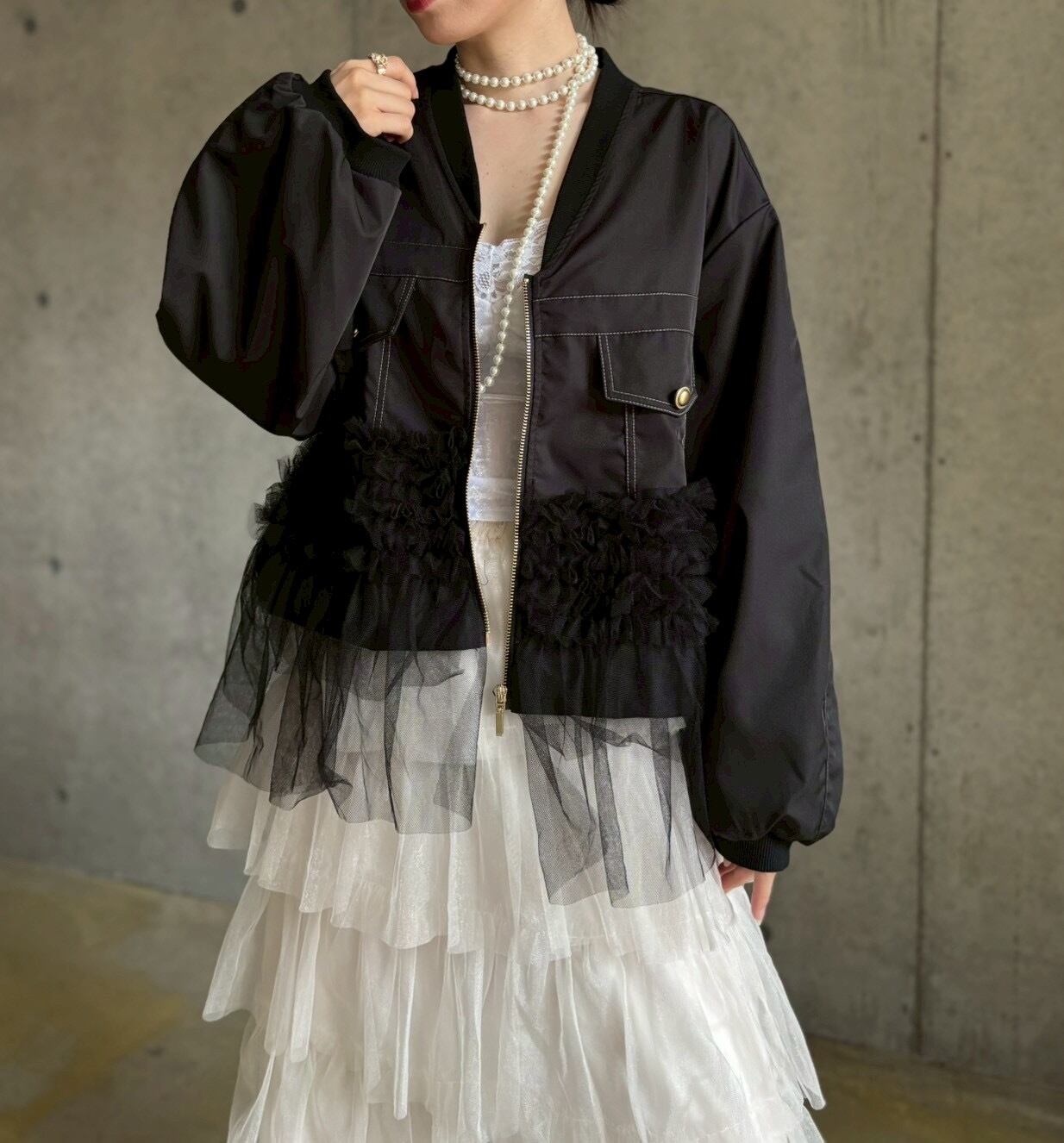 カジュアルな印象のMA-1にチュールフリルをドッキングした甘辛MIXブルゾン✨