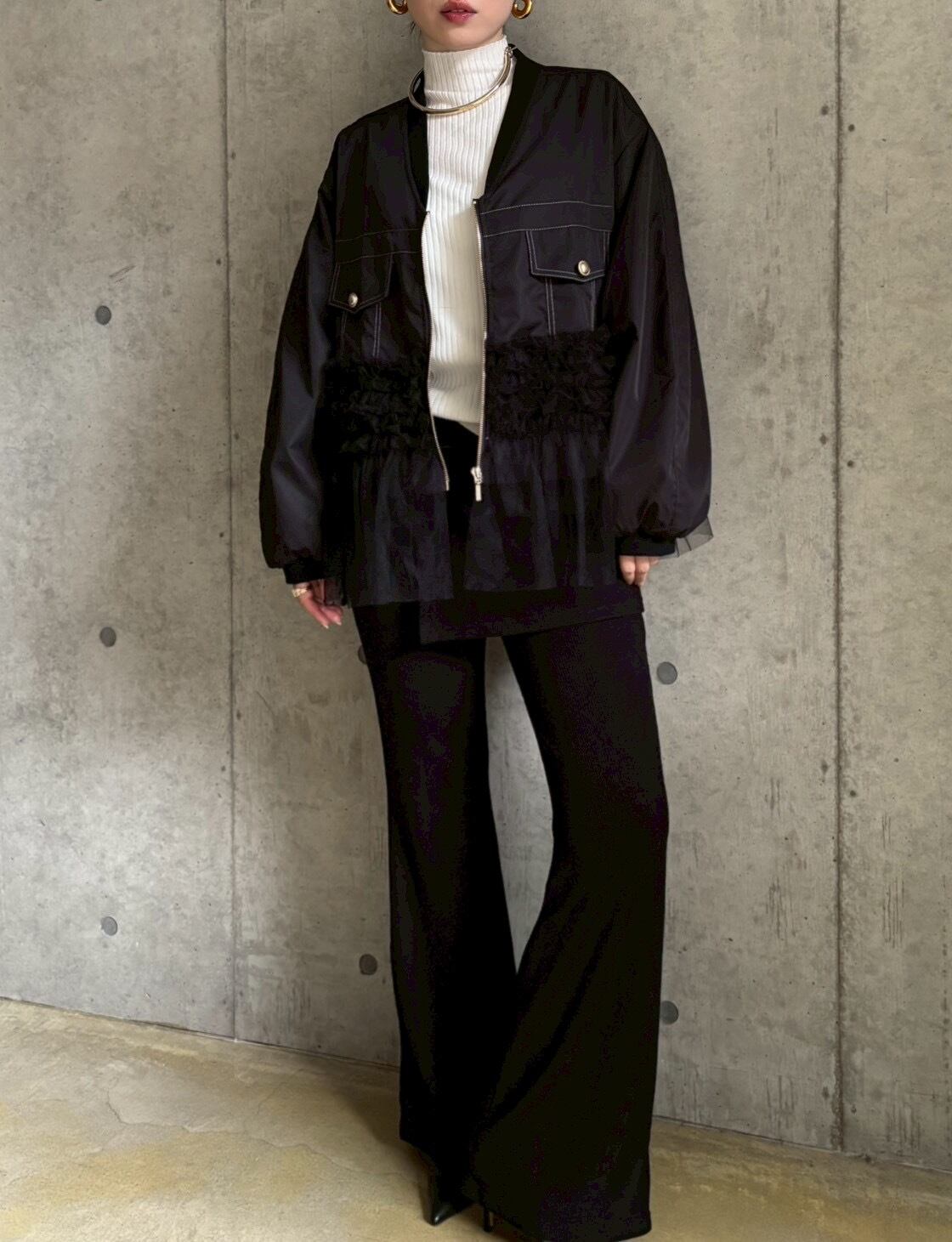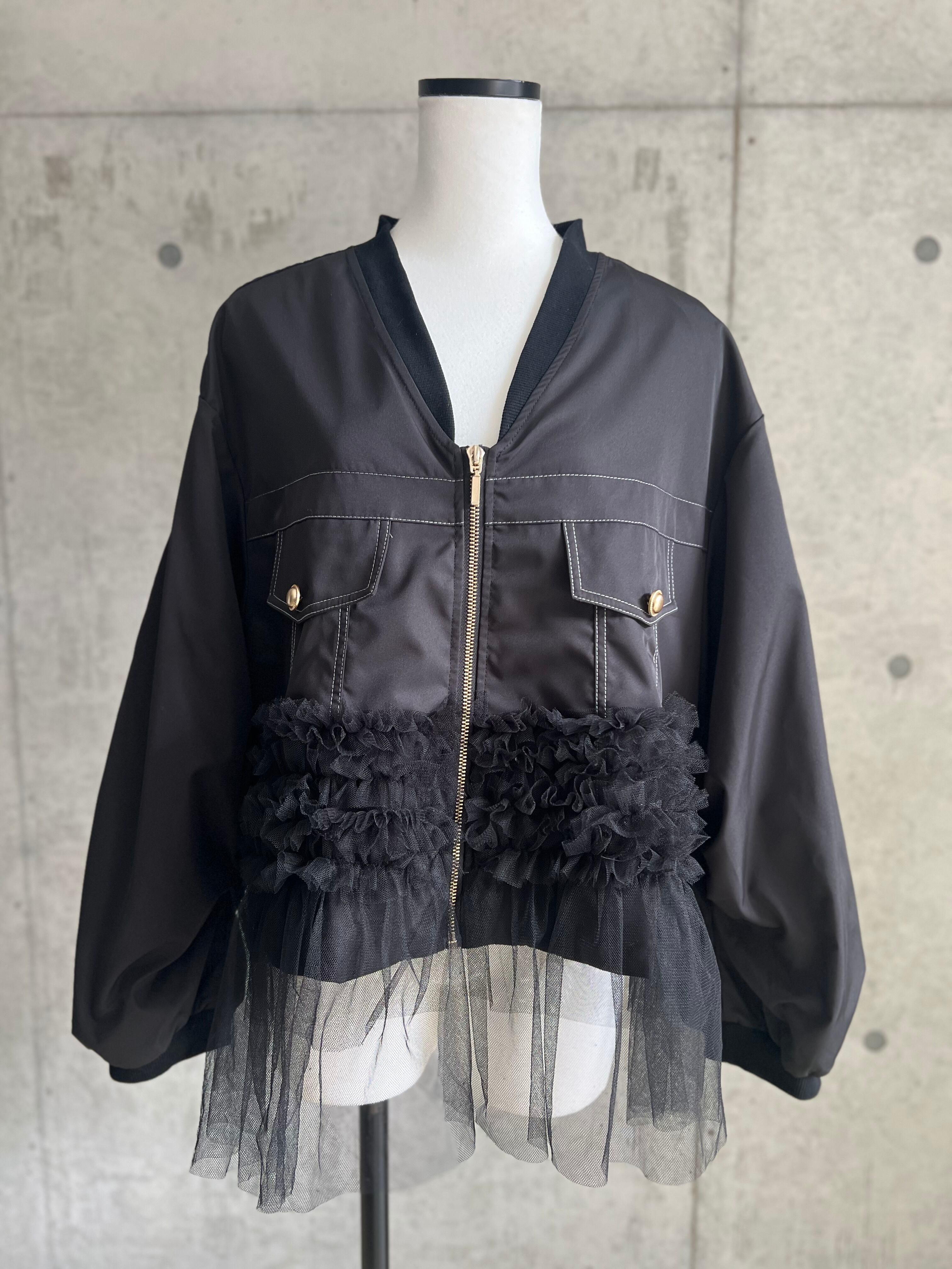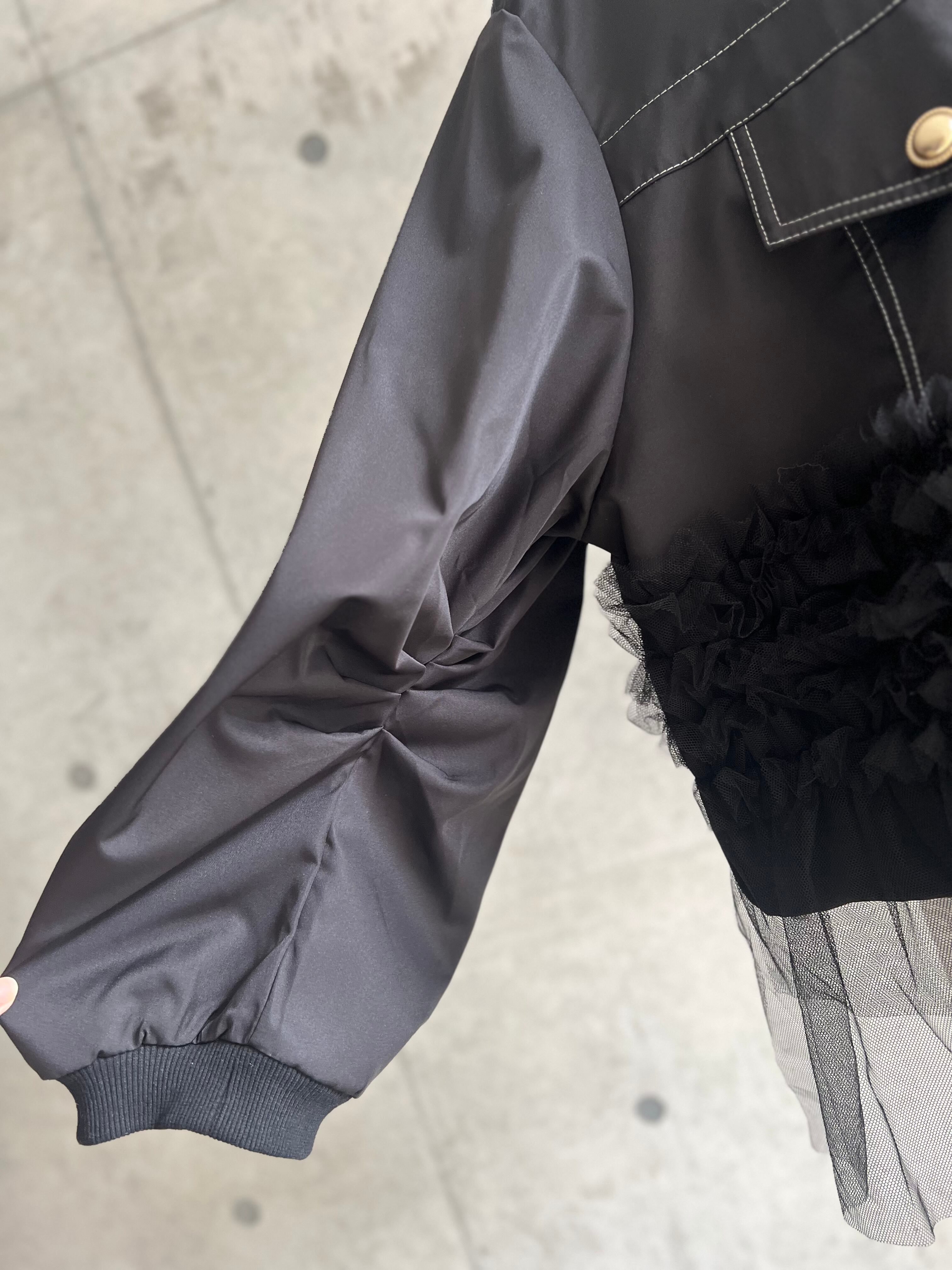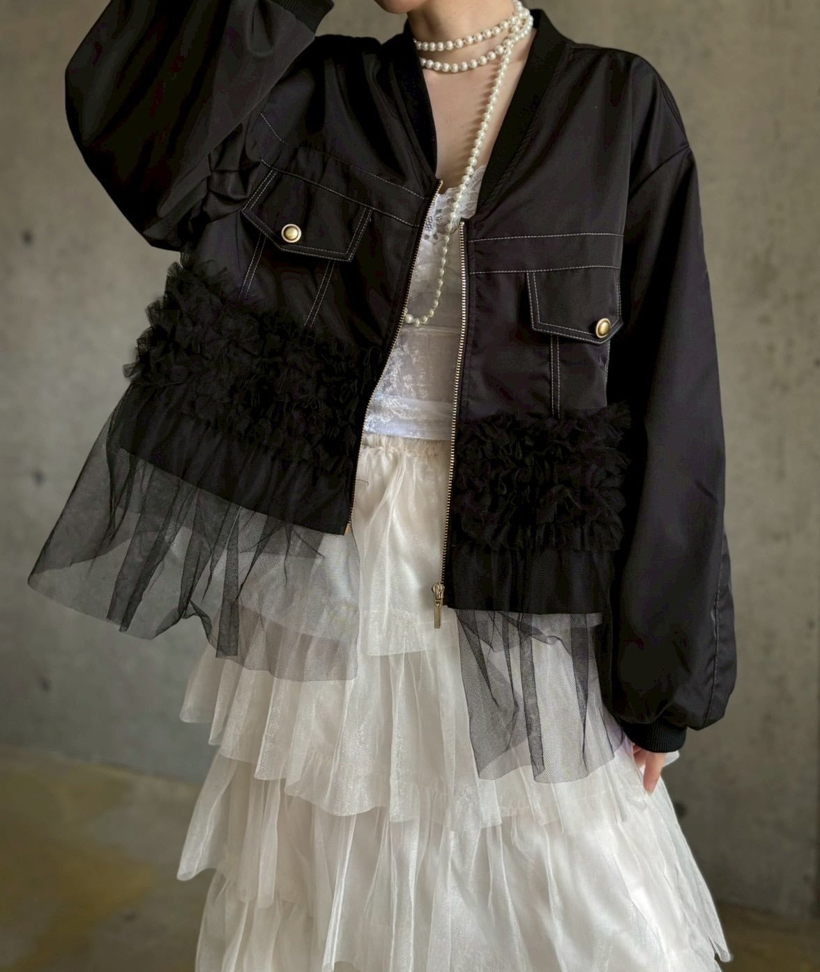カジュアルな印象のMA-1にチュールフリルをドッキングした甘辛MIXブルゾン✨