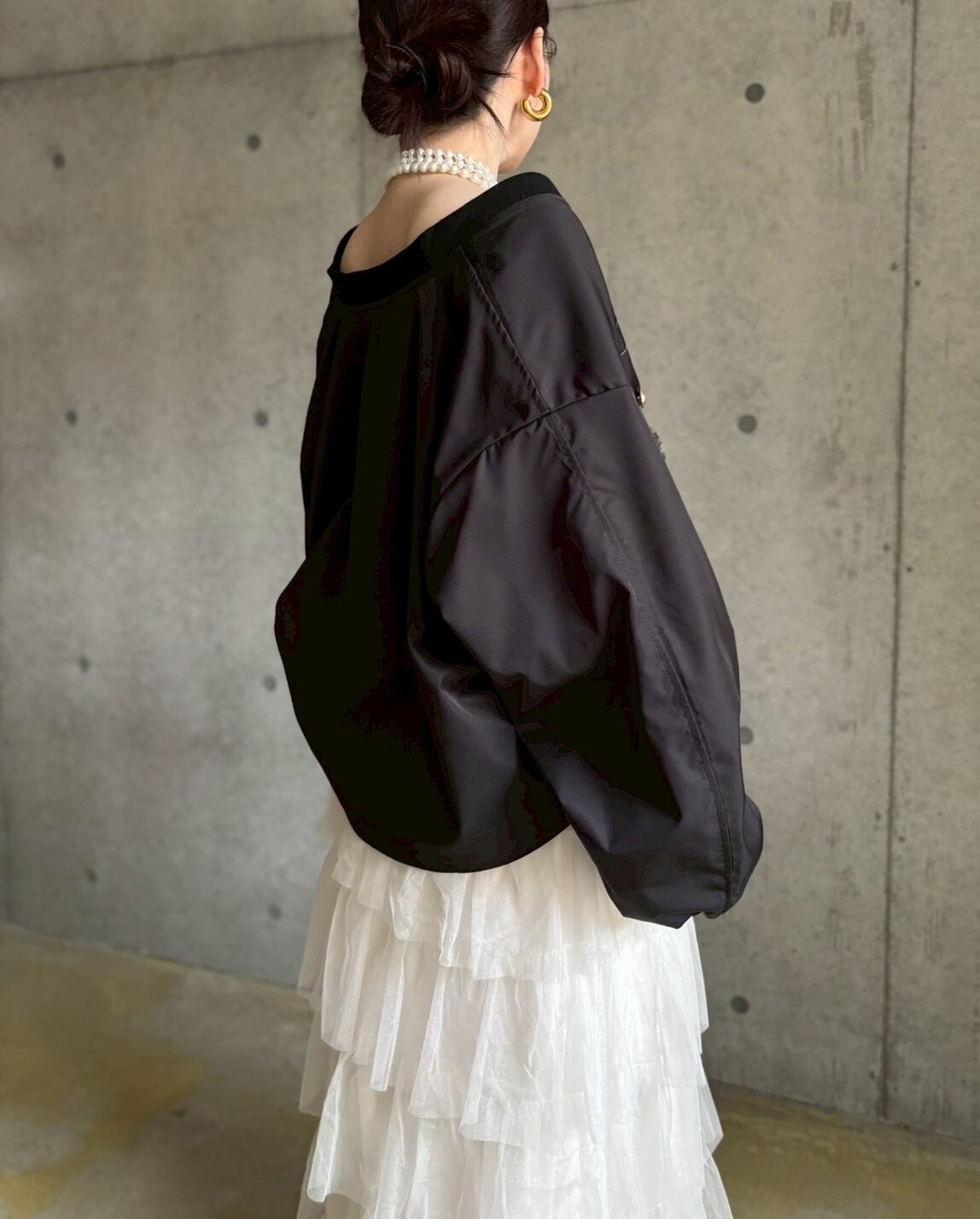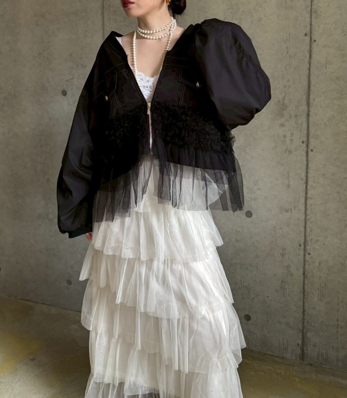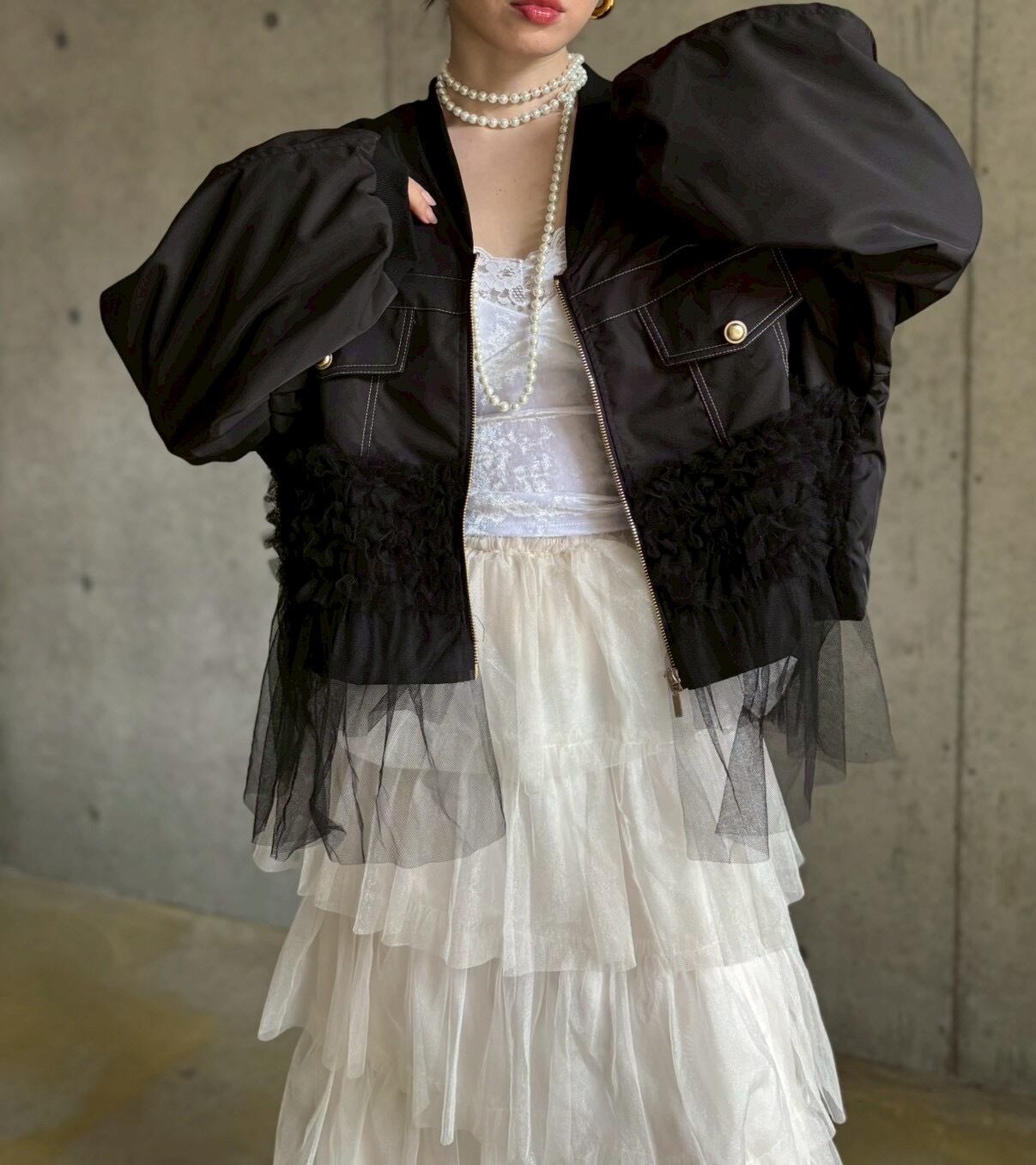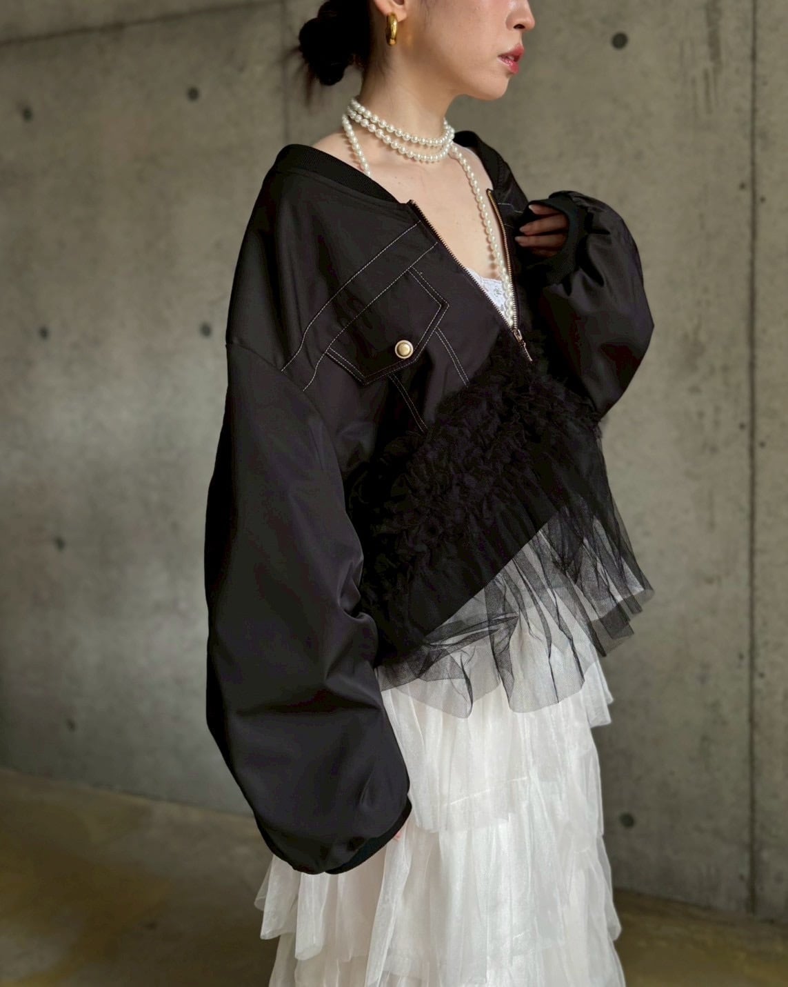 アウターの定番、MA-1にふんわりチュールを施して女性らしさをプラス✨