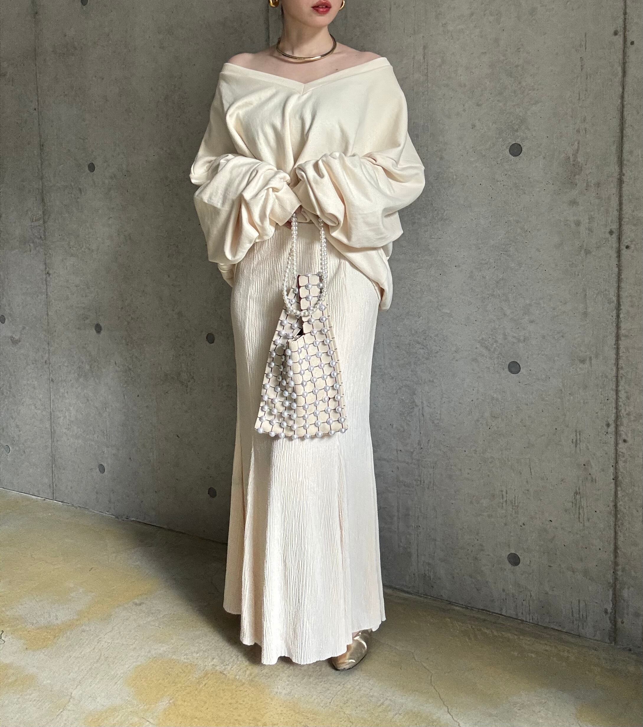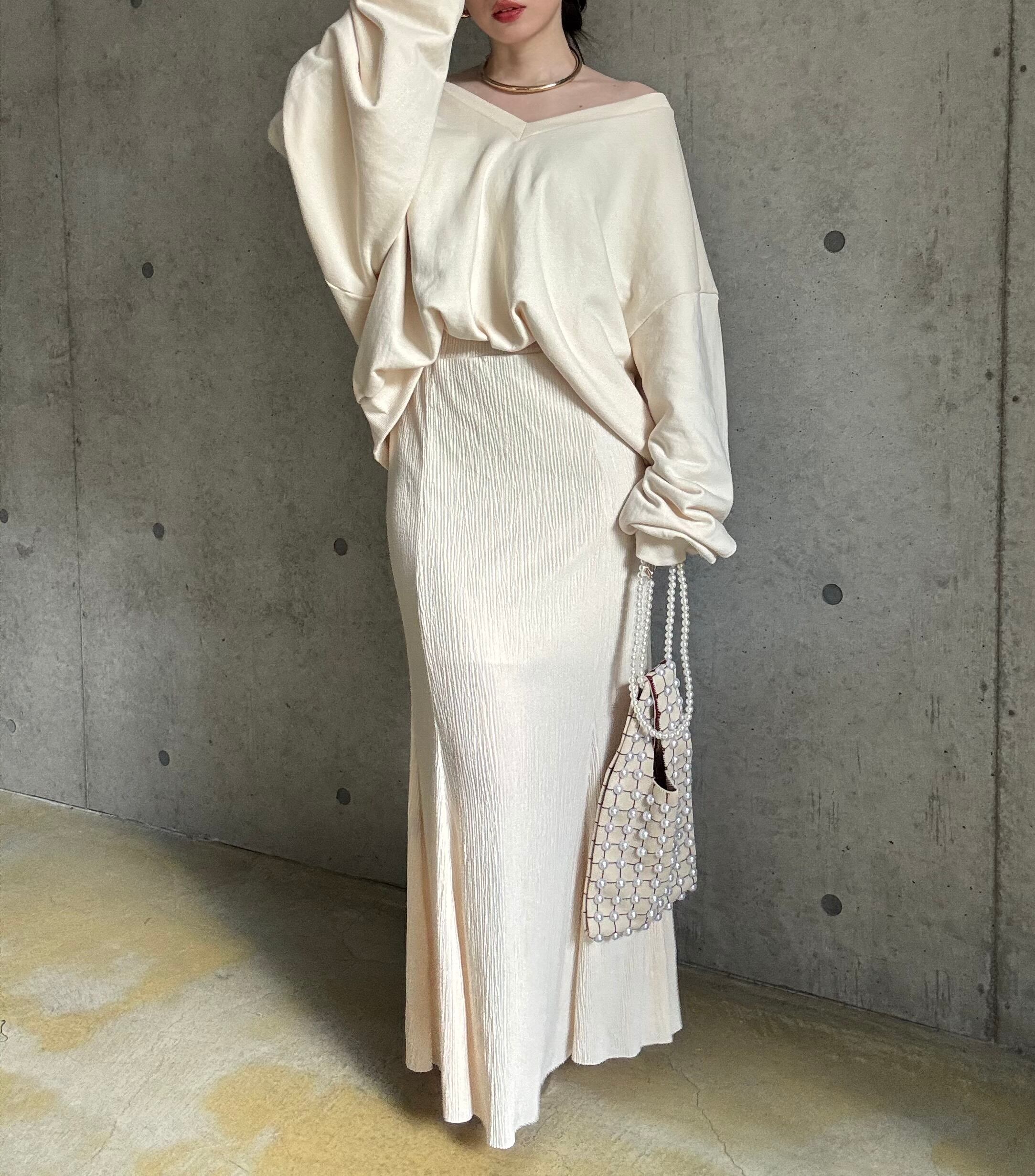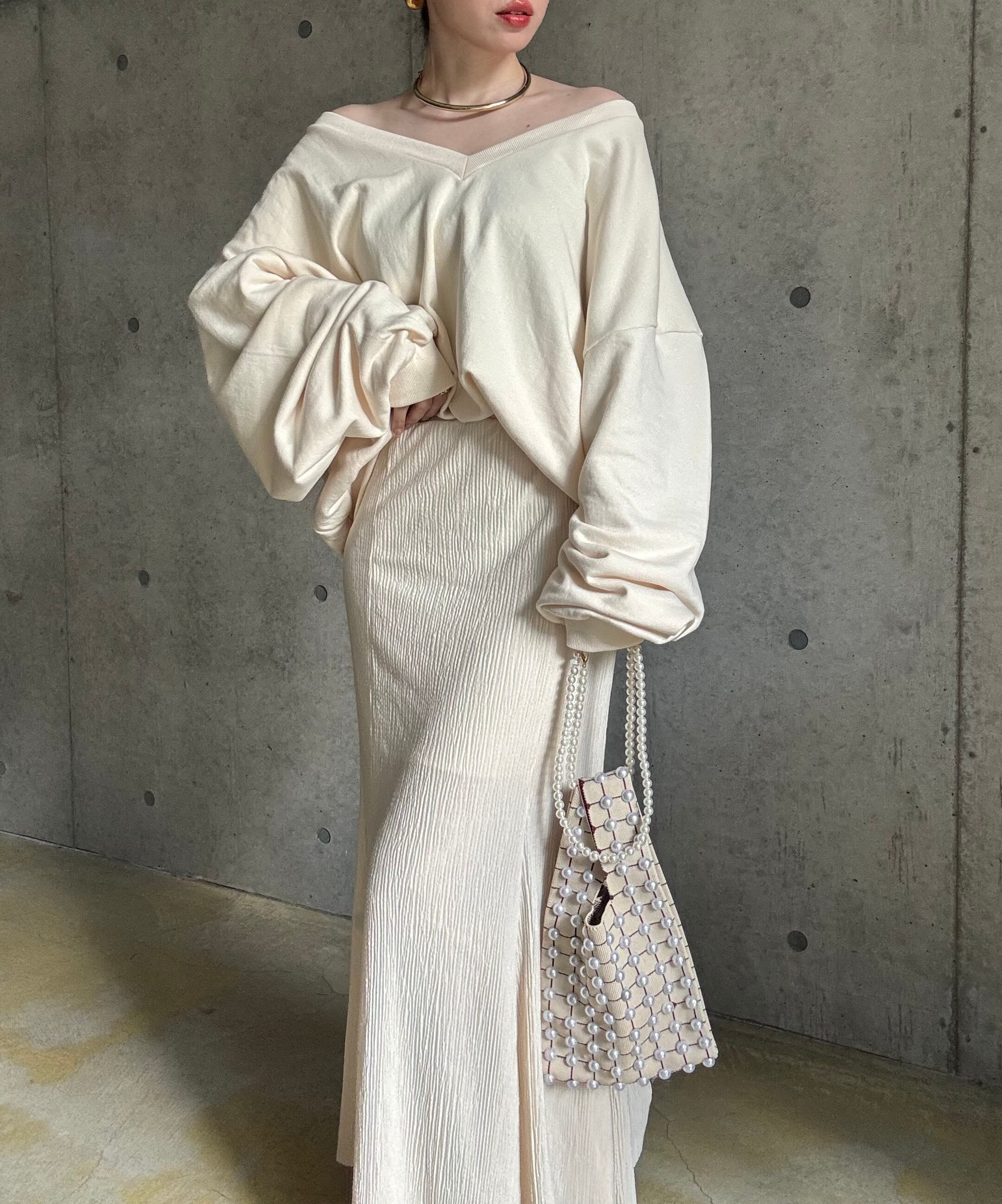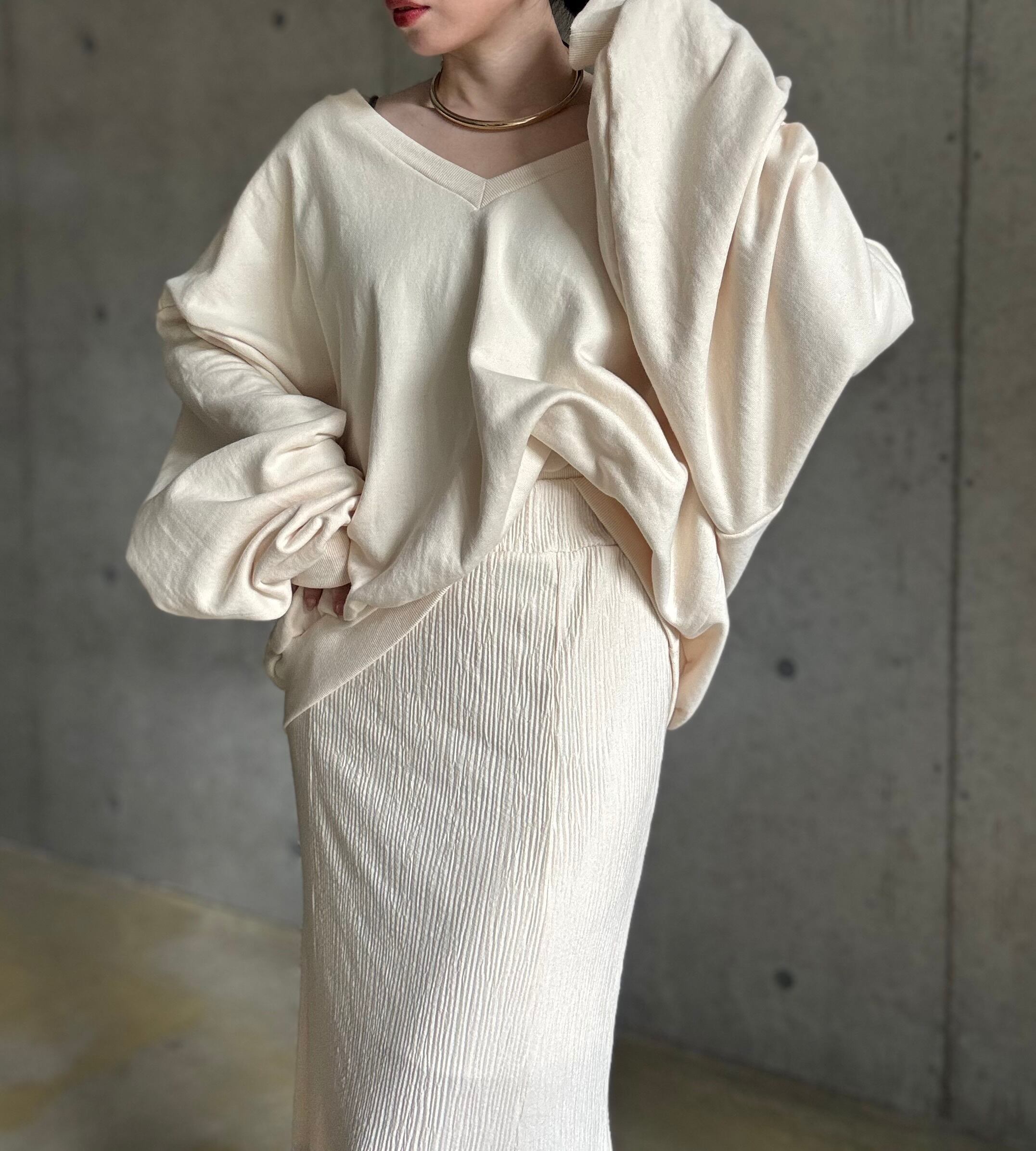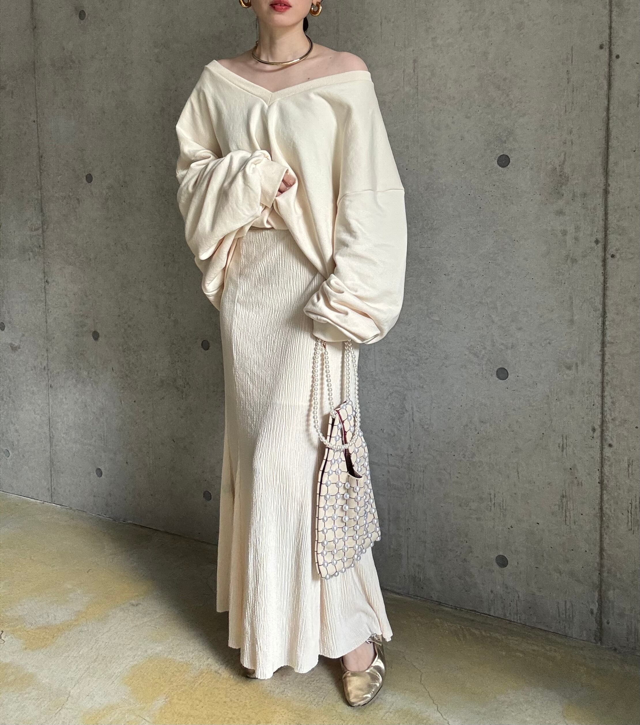 首元は深めのVネックにすることで女性らしさをプラス✨