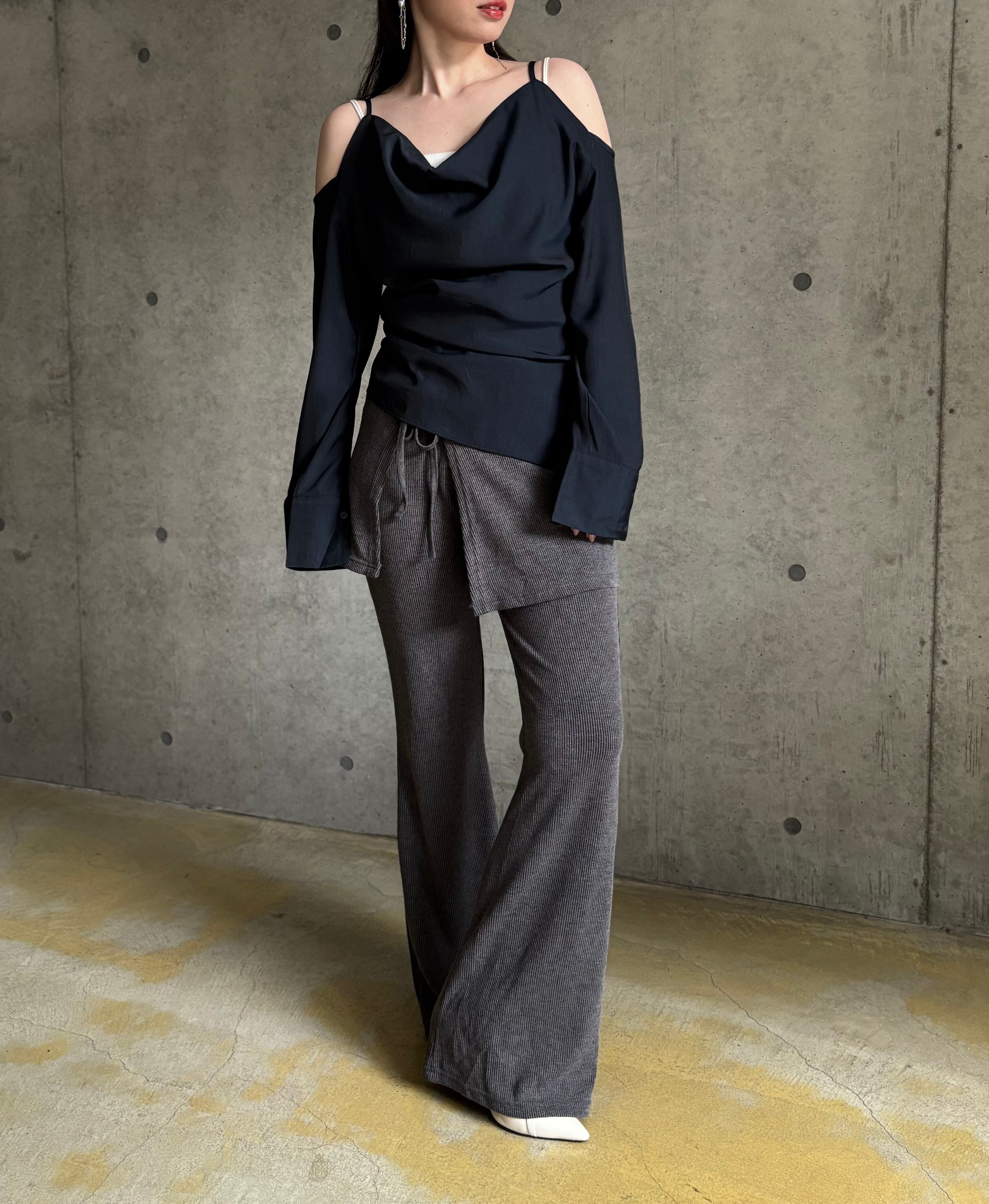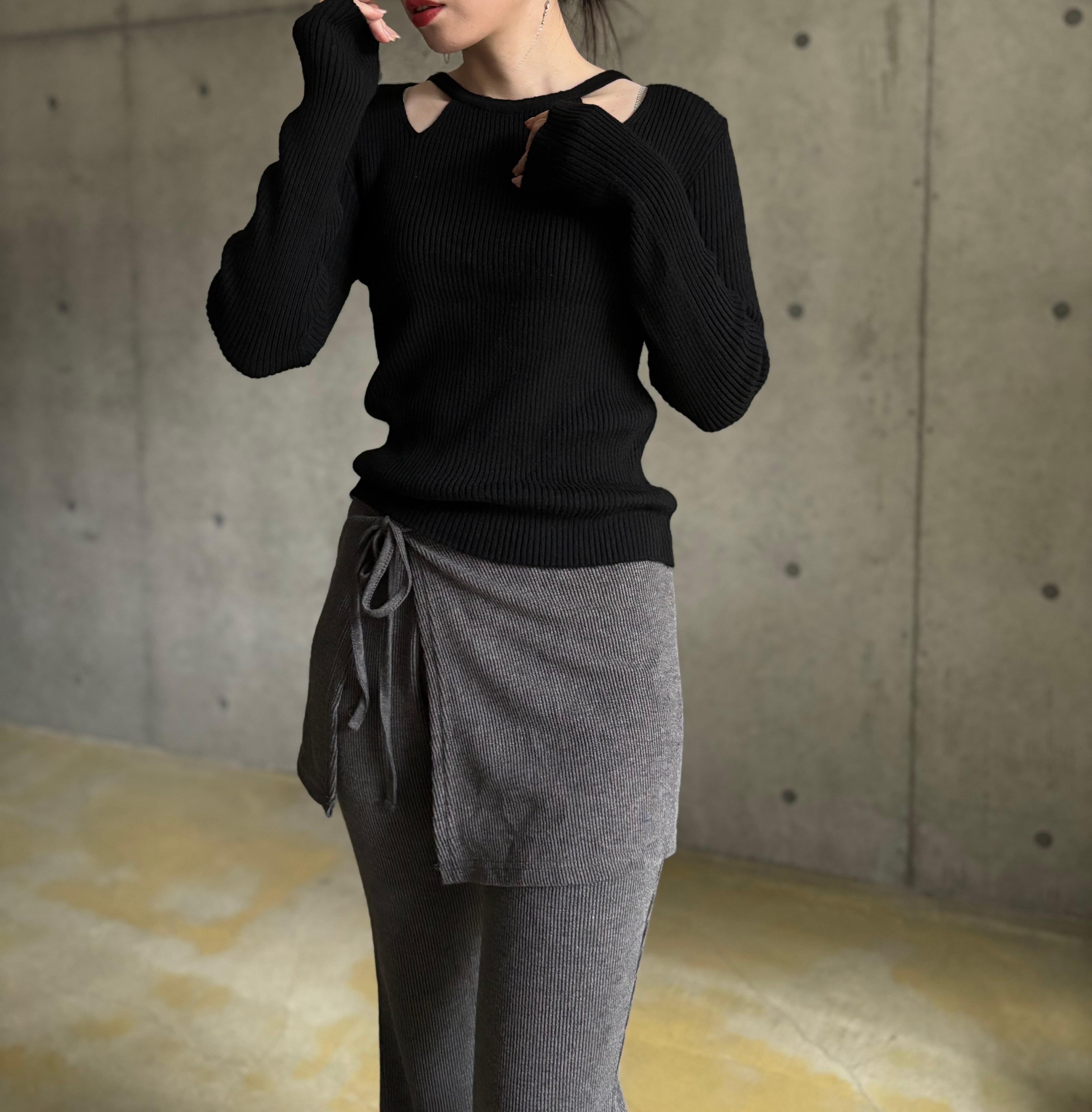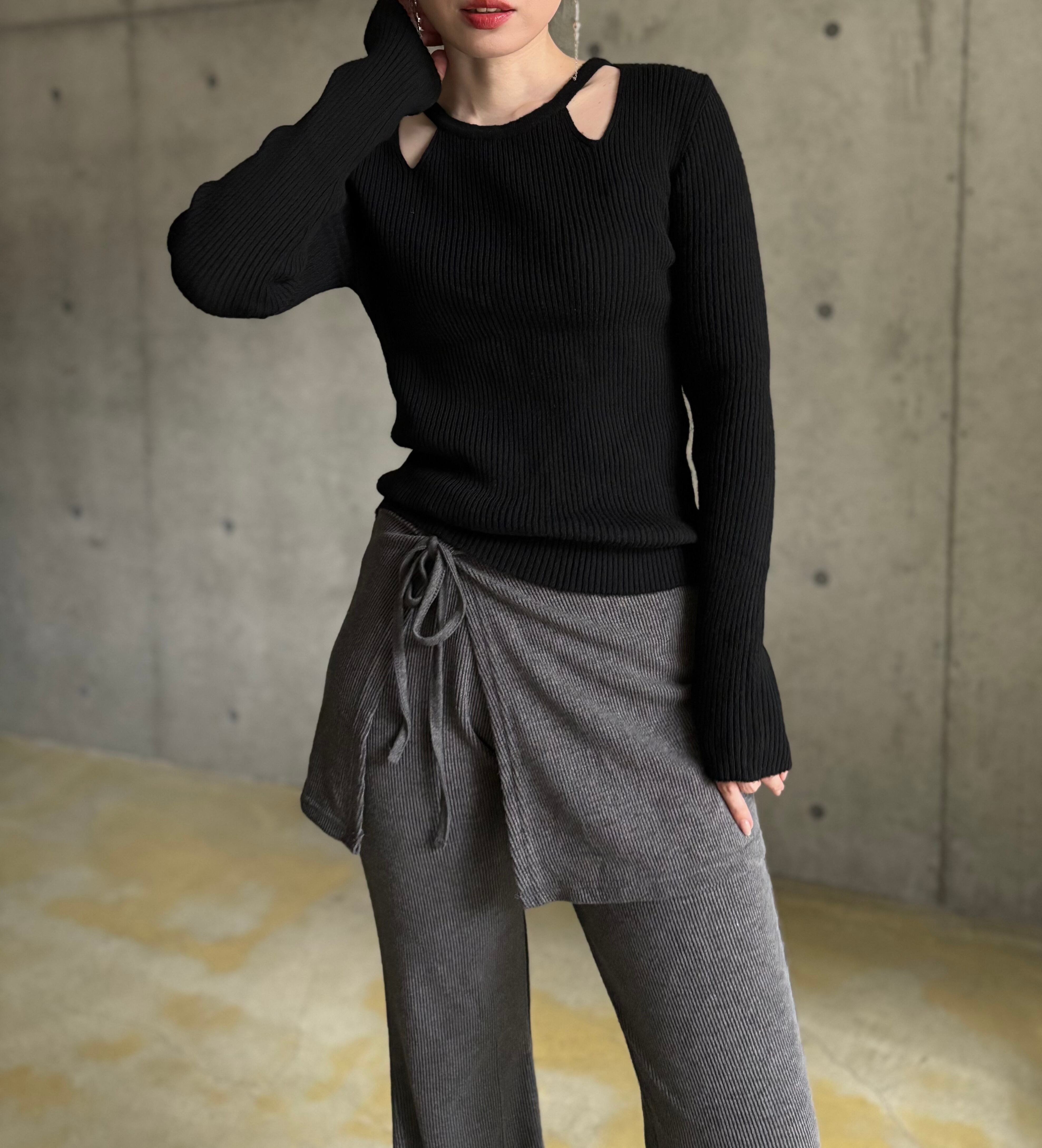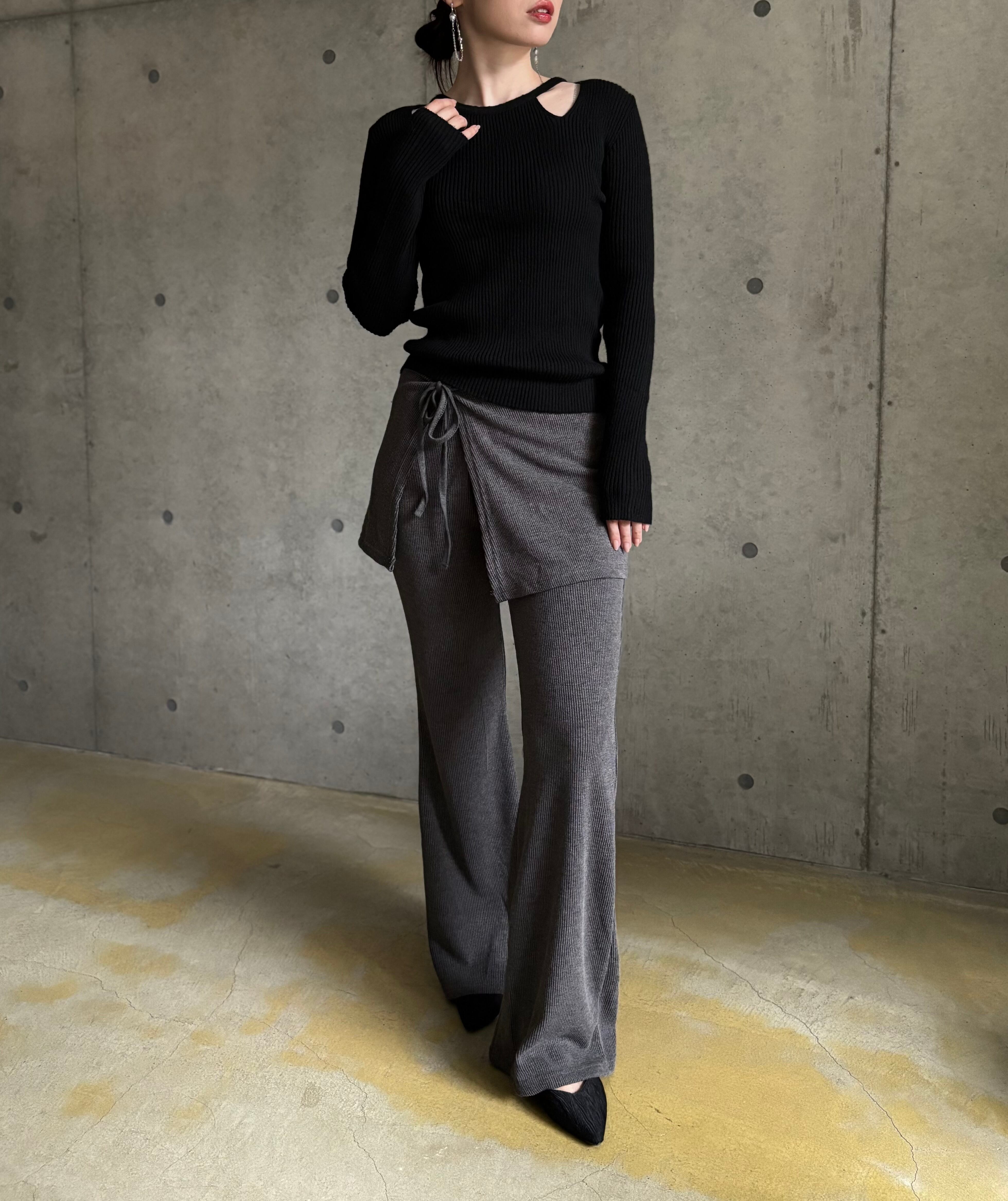 伸縮性のあるリブカット素材で履き心地&着痩せ効果バツグンなラップスカート付きパンツ✨