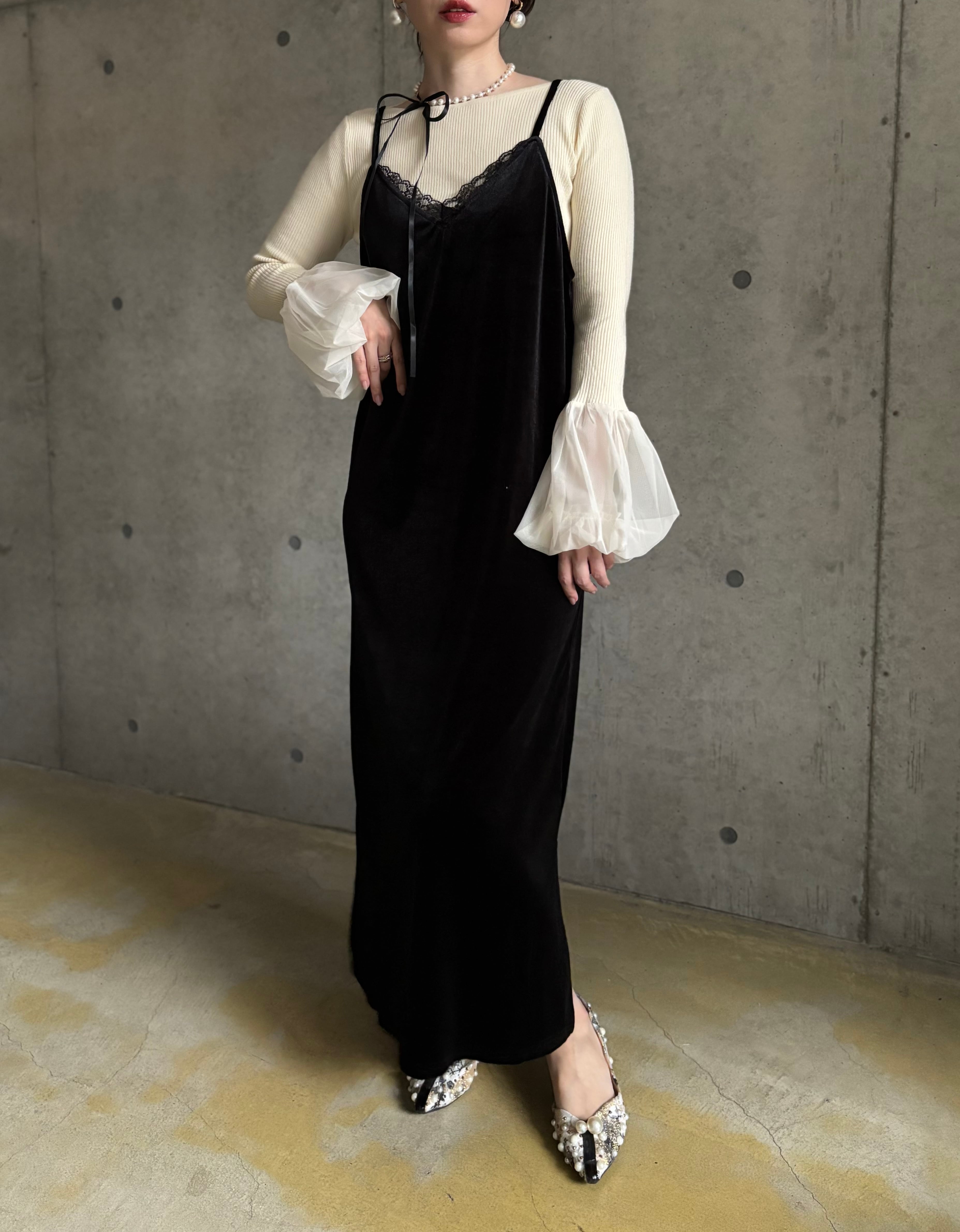 首元のレースがポイントの上品&フェミニンなベロアキャミワンピース✨