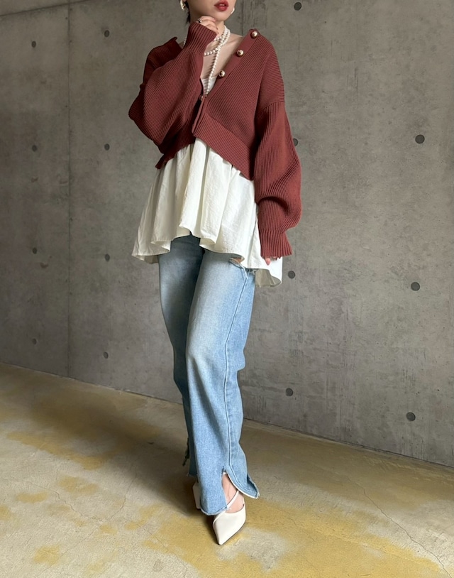 ゴールドボタンがアクセントに♪ニットとシャツをドッキングした異素材MIXカーディガン✨
