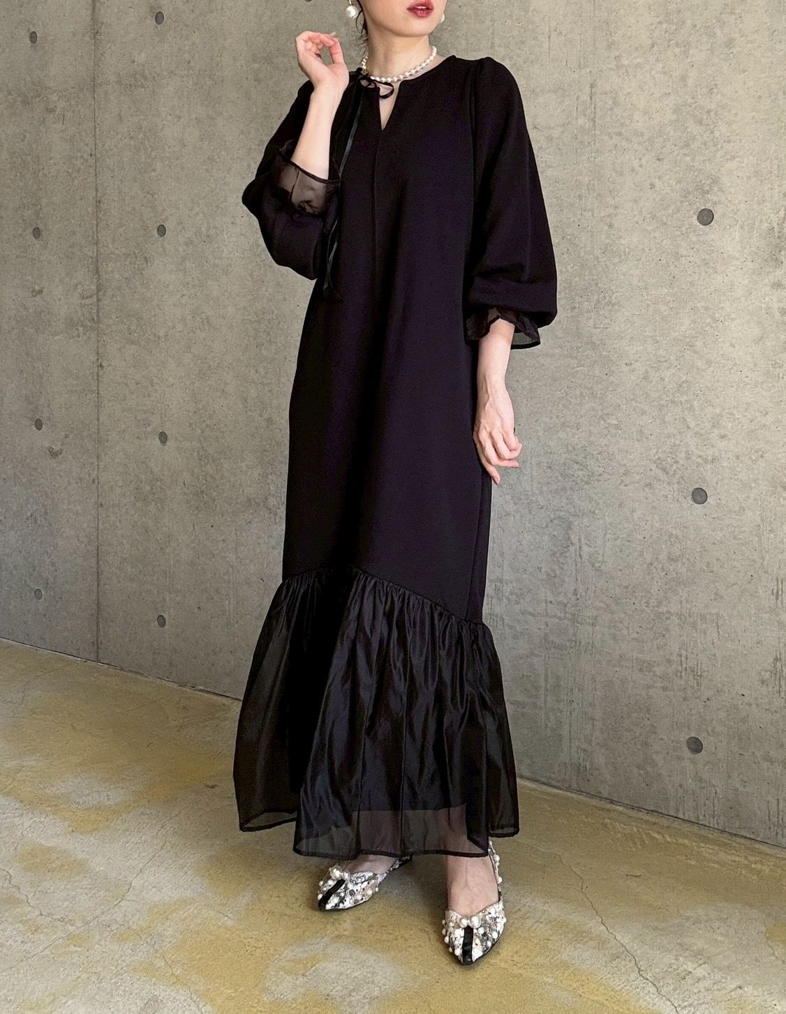 【10/10 21:00〜】オーガンジー切替ロングワンピース【ブラック】
