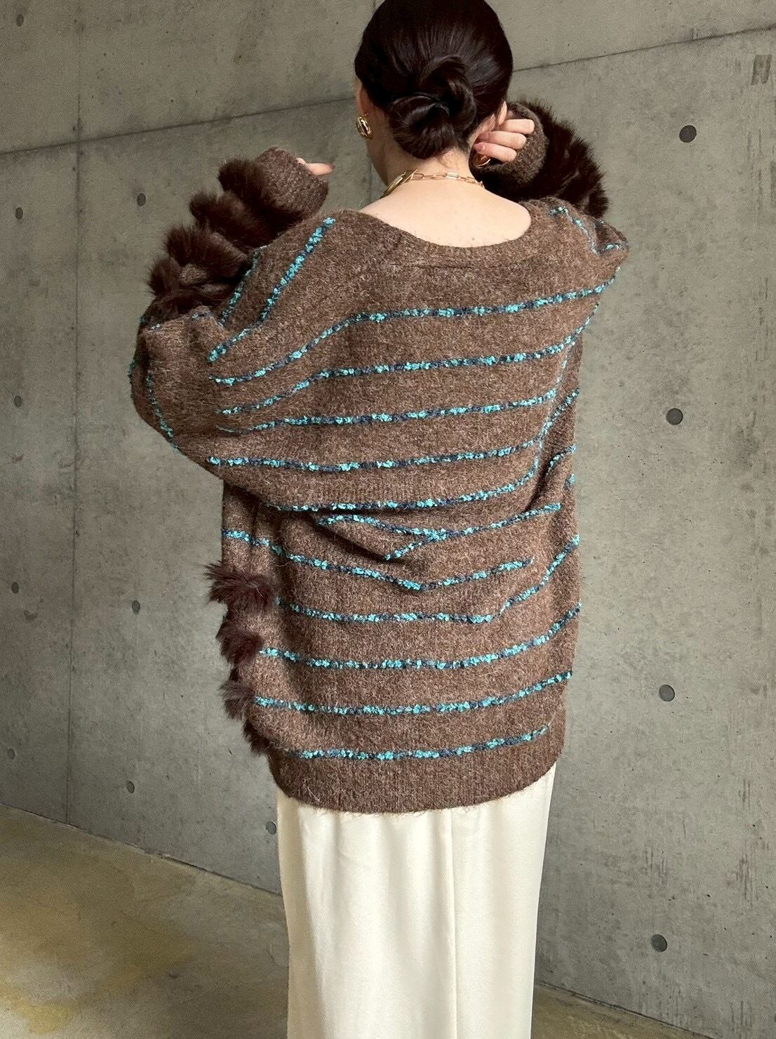 深めのVネックやたっぷりとしたボリューム感のある袖が、ゆったりめながらも女性らしい印象に✨