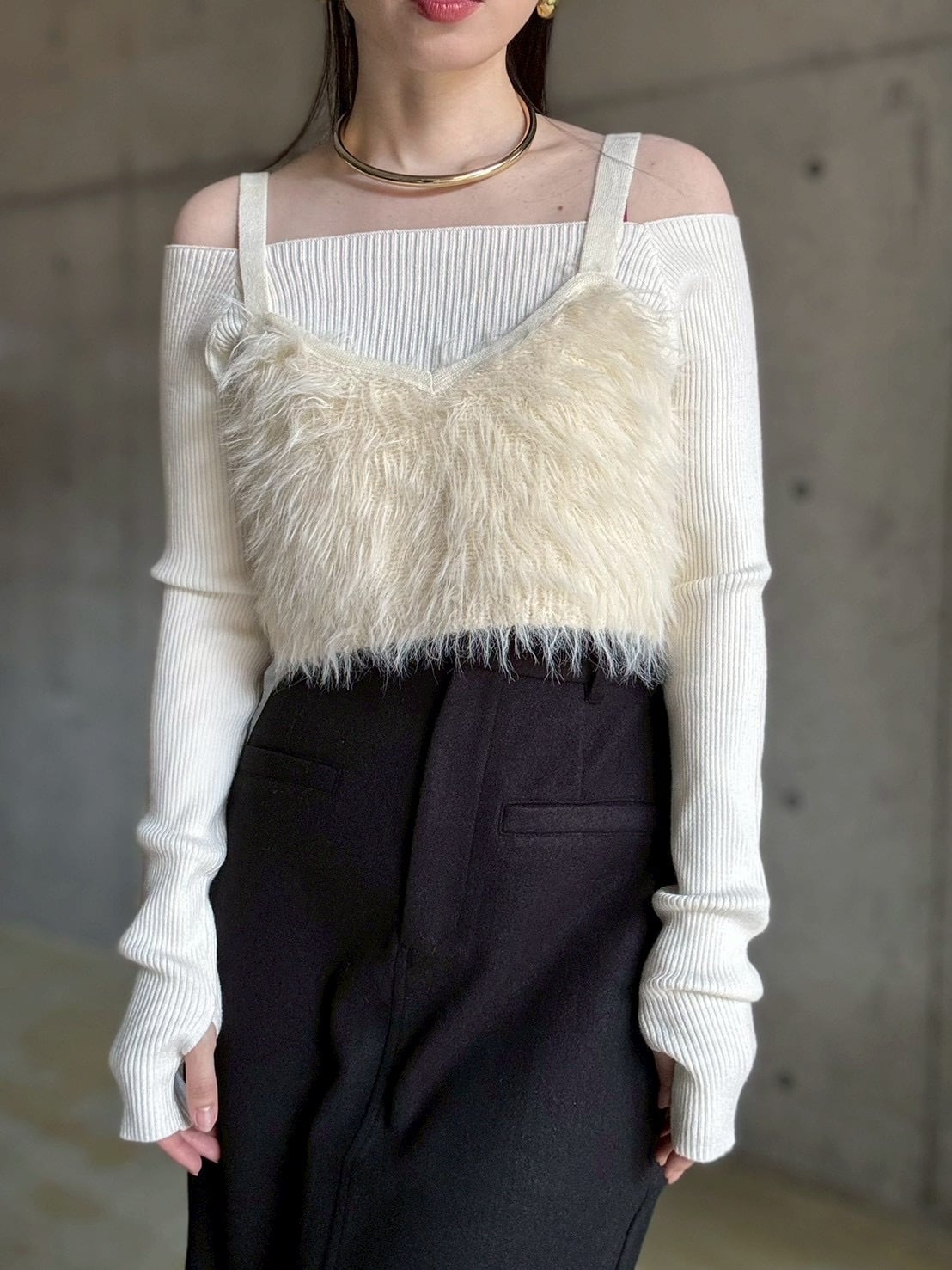 【10/15 21:00〜】オフショルリブニットtops【アイボリー】
