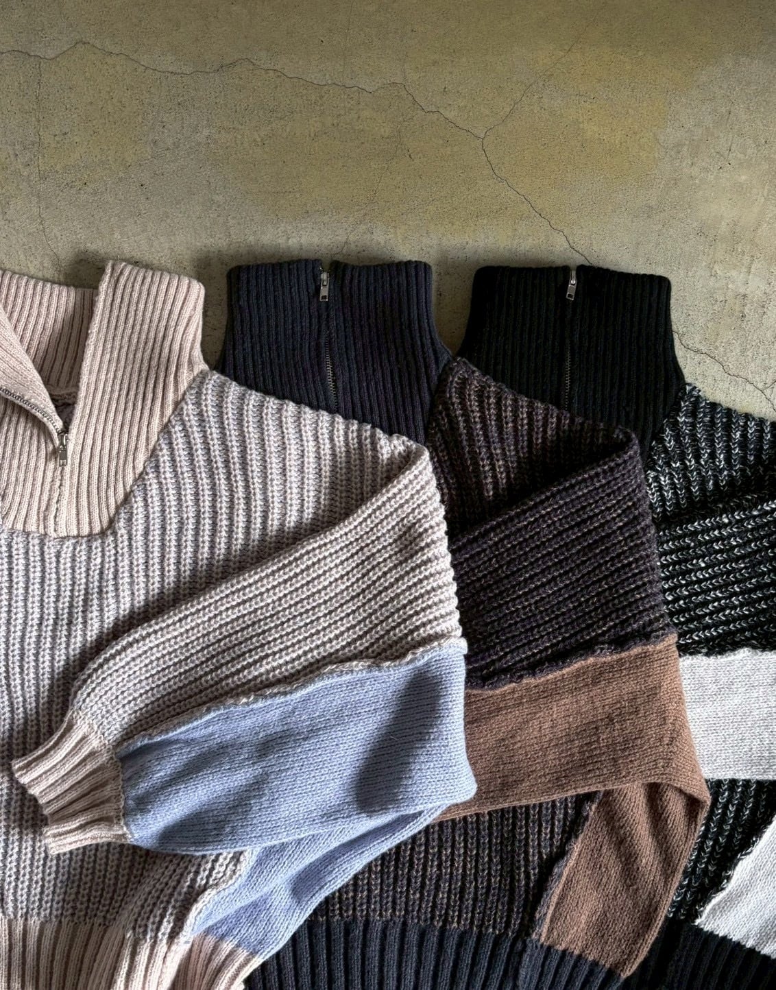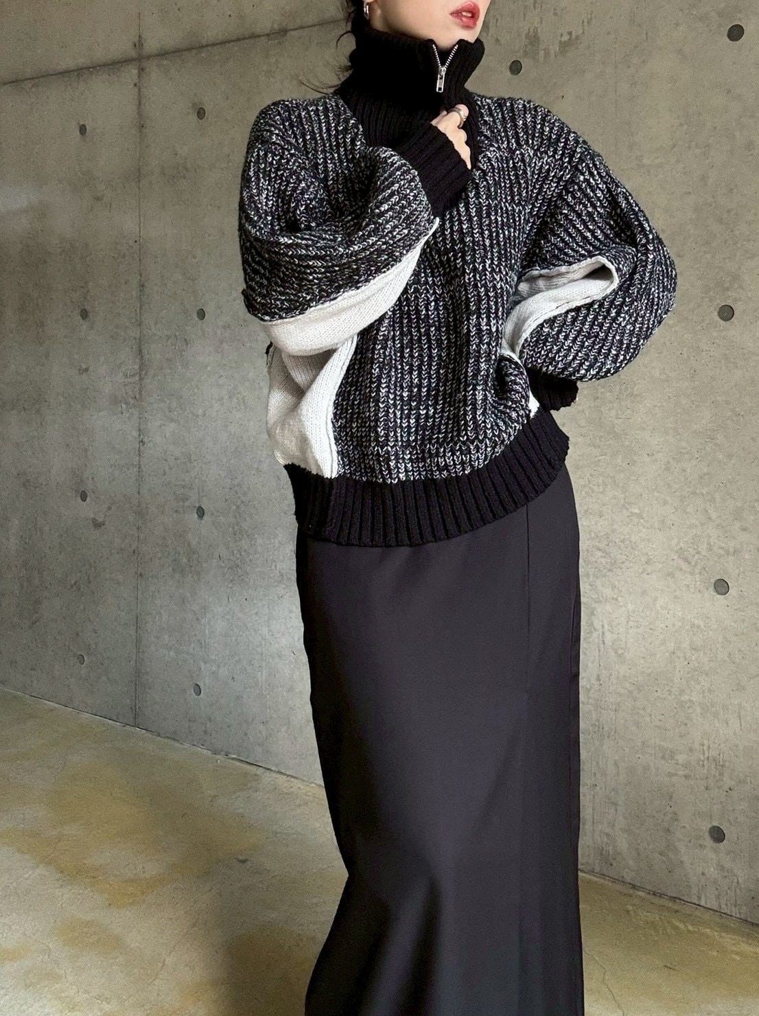 トレンドのハイネックジップ付きニットを個性的にアレンジ♪配色デザインニットプルオーバー✨