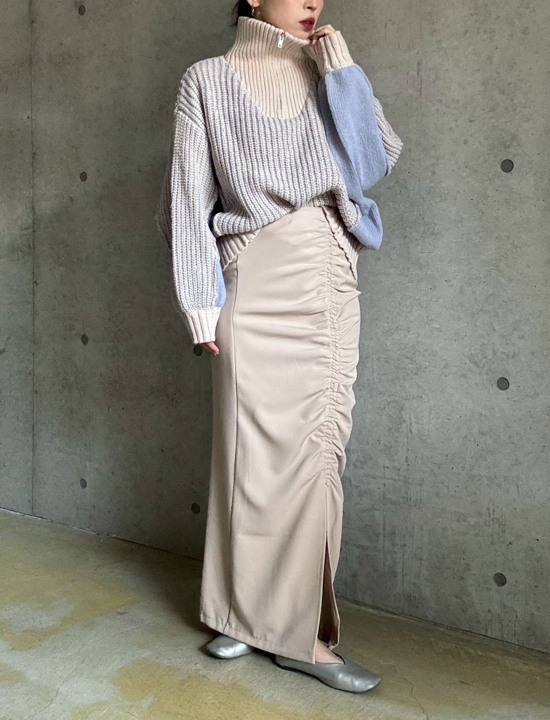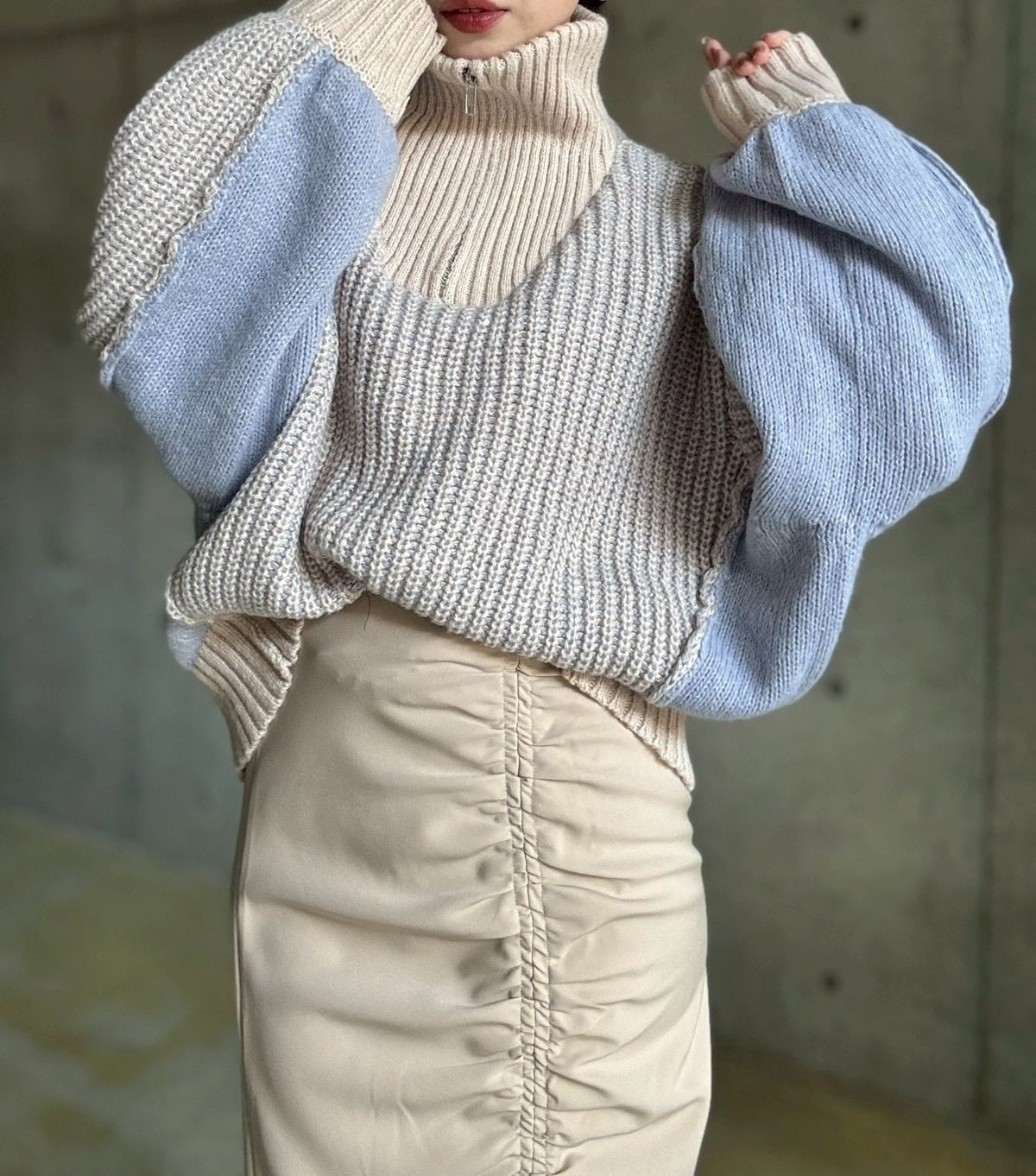ミックスニットと無地ニットの糸を組み合わせたドルマンスリーブのゆったりとしたシルエットが、こなれ感&抜け感たっぷりの印象に✨