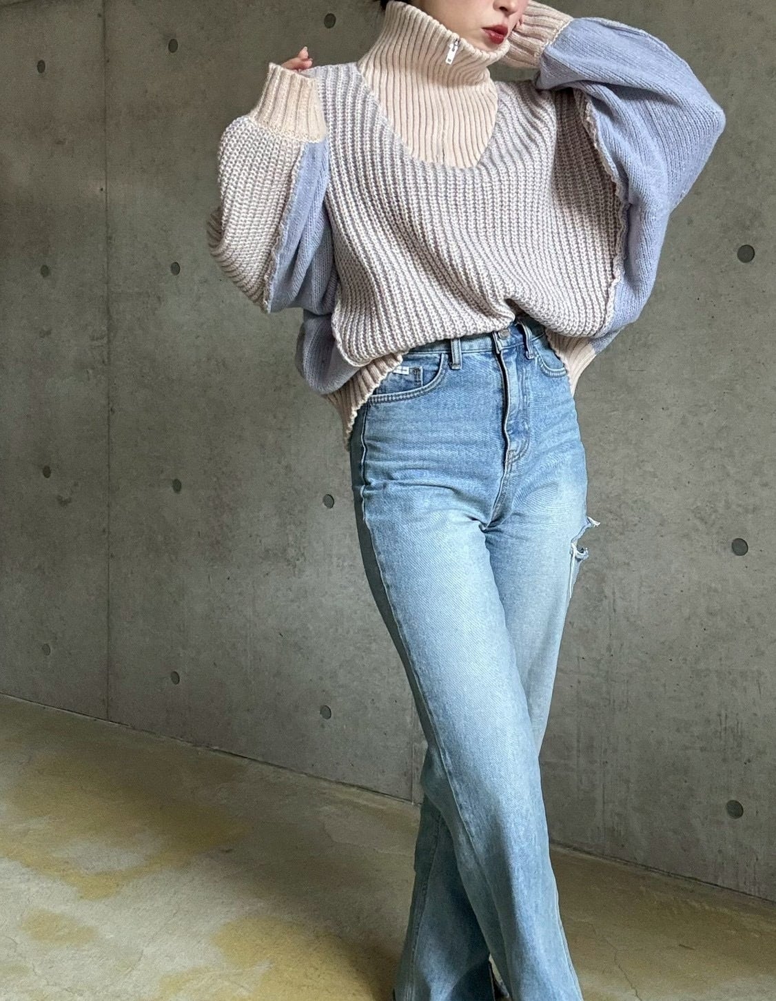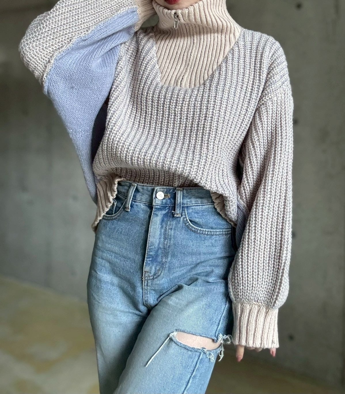 トレンドのハイネックジップ付きニットを個性的にアレンジ♪配色デザインニットプルオーバー✨
