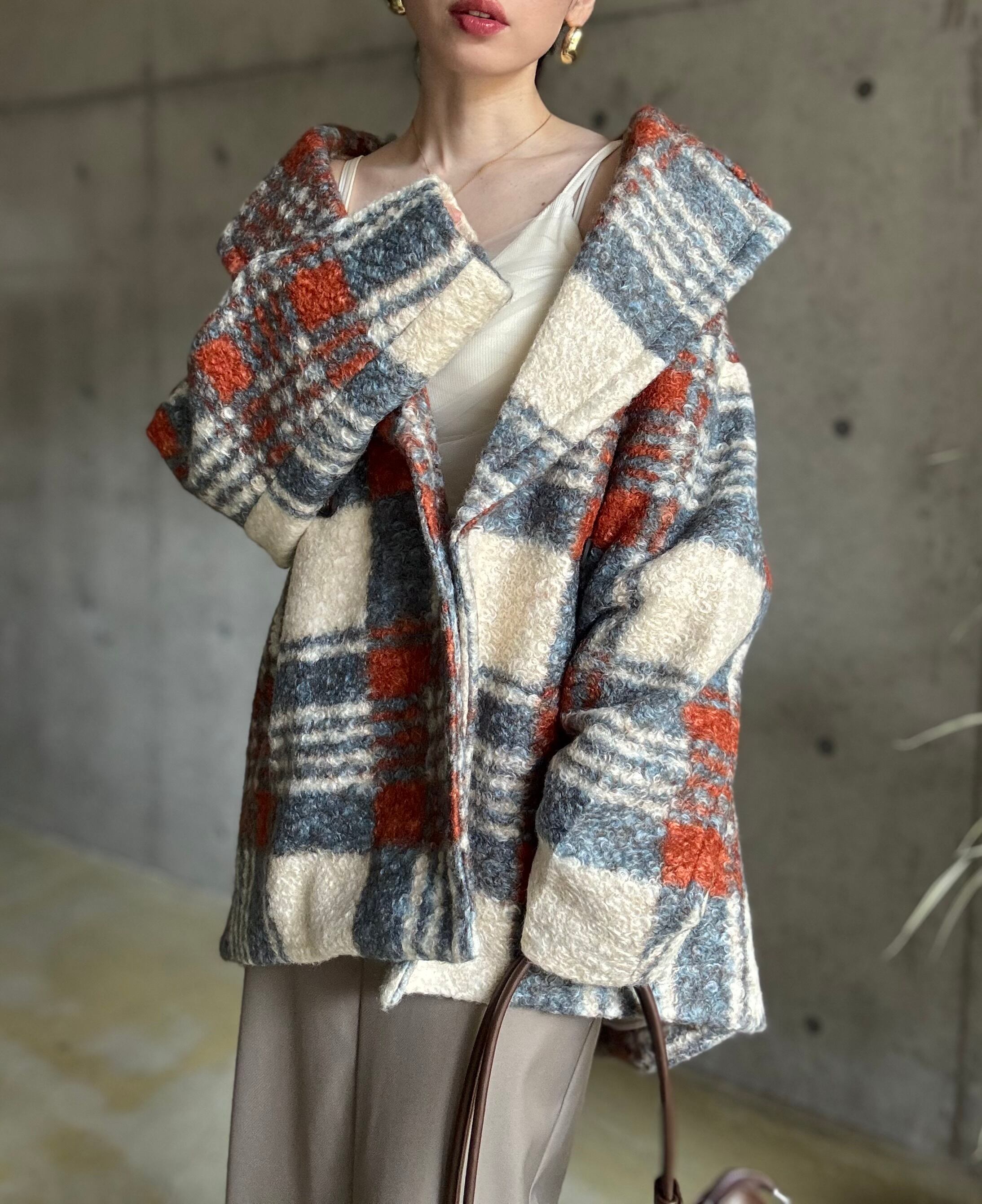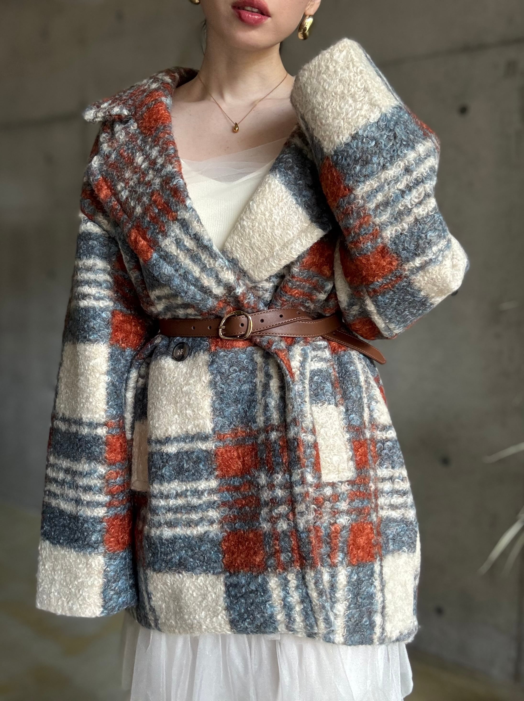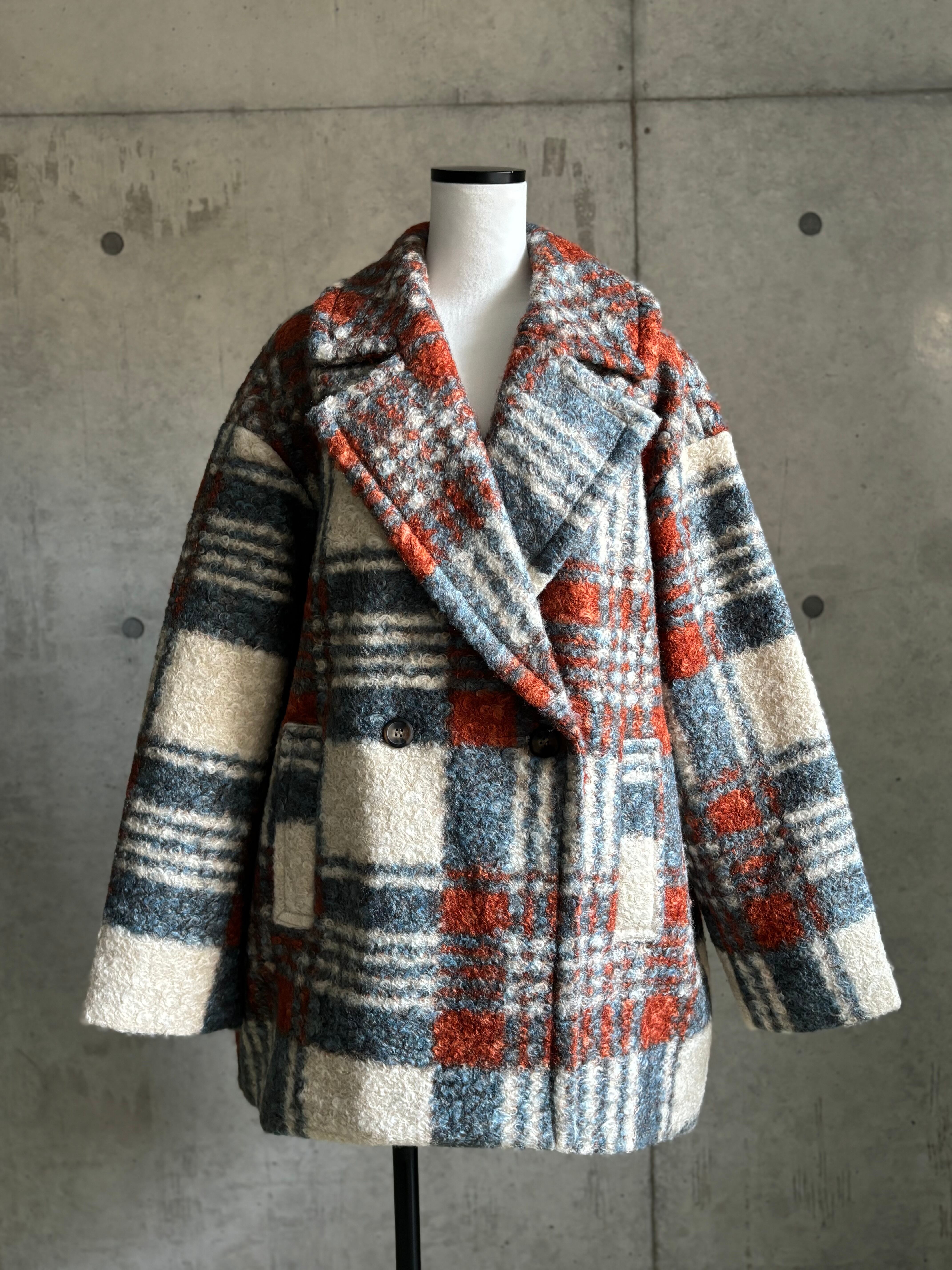 肉厚の先染めチェック柄のリングボア生地使用し、軽量なのに暖かく、回りと差がつくデザインがポイントの一着✨