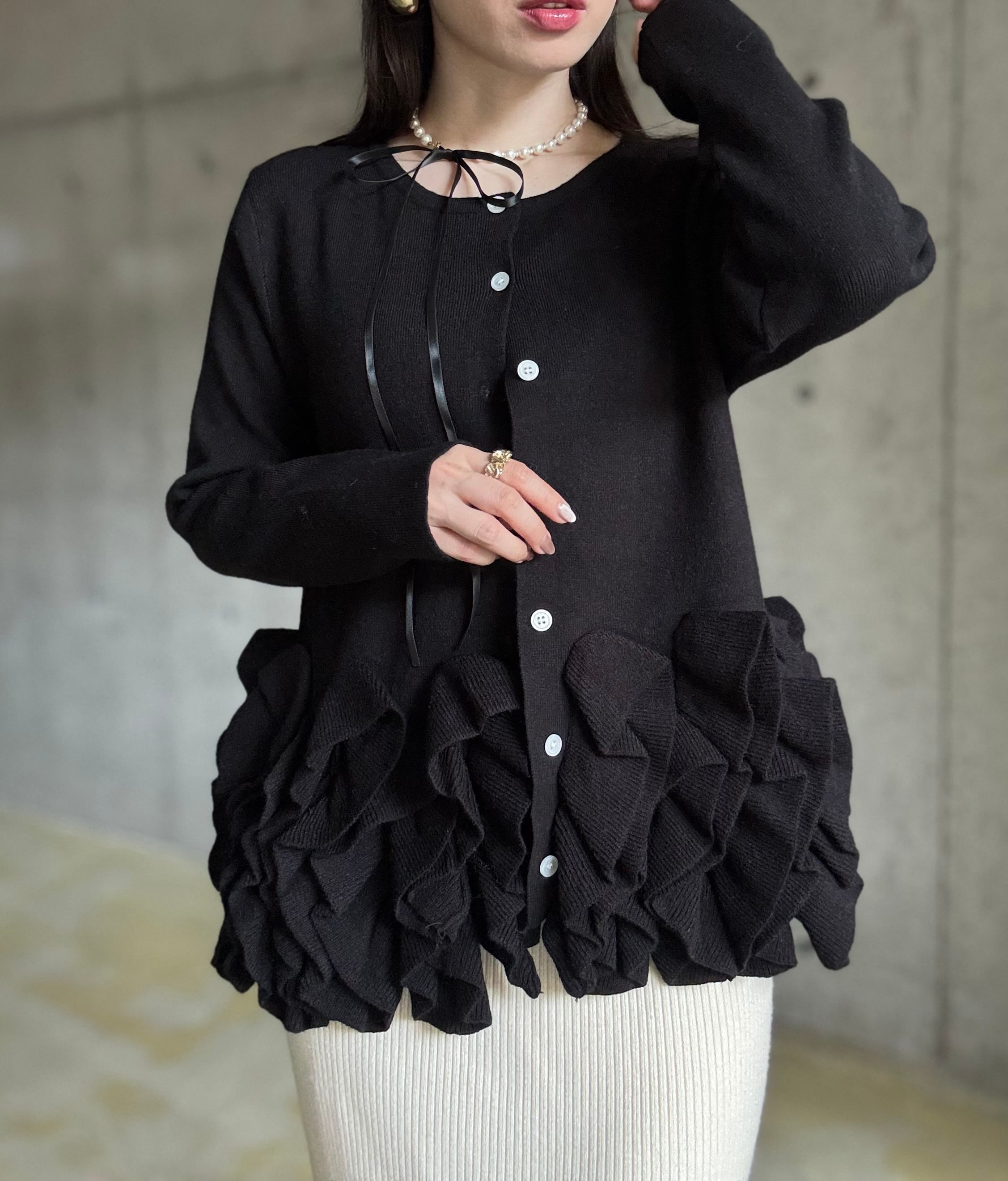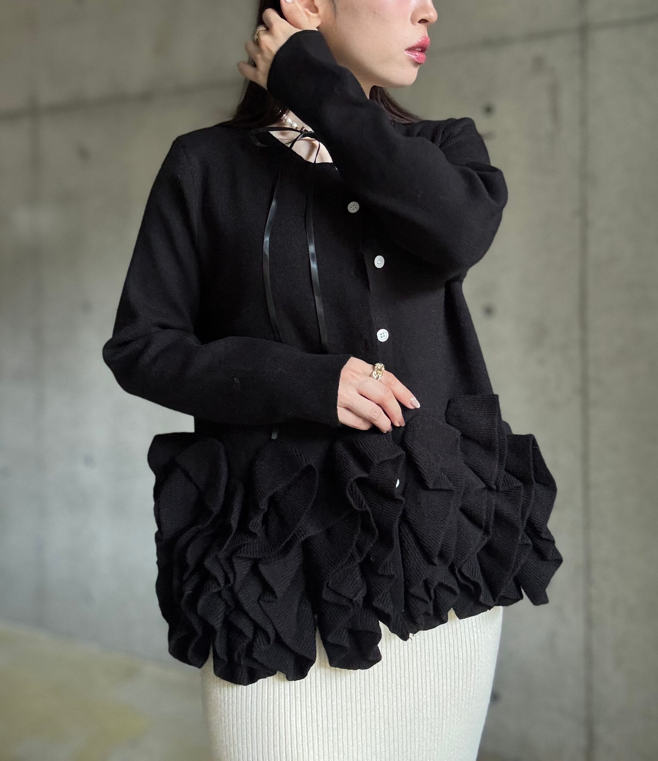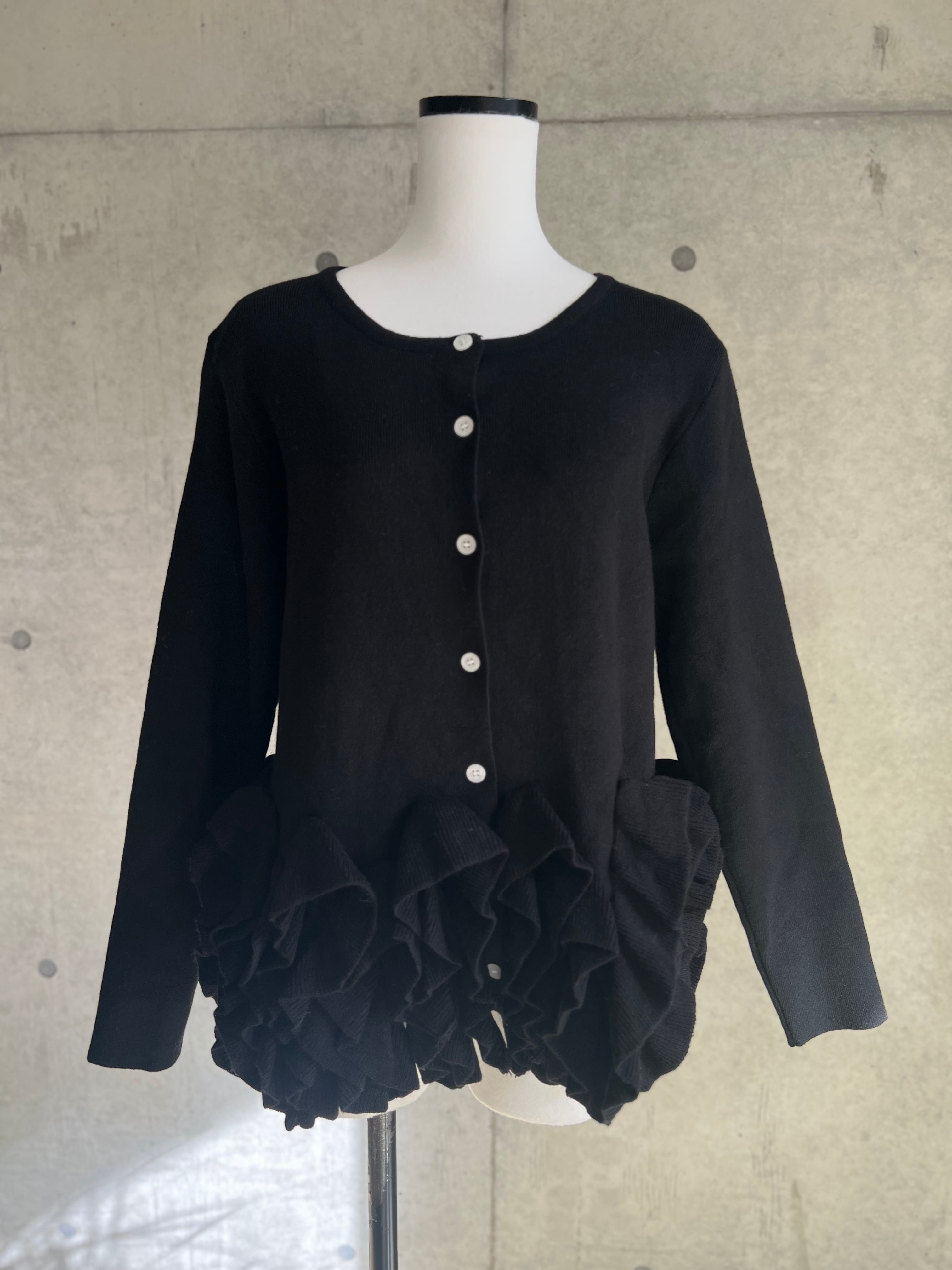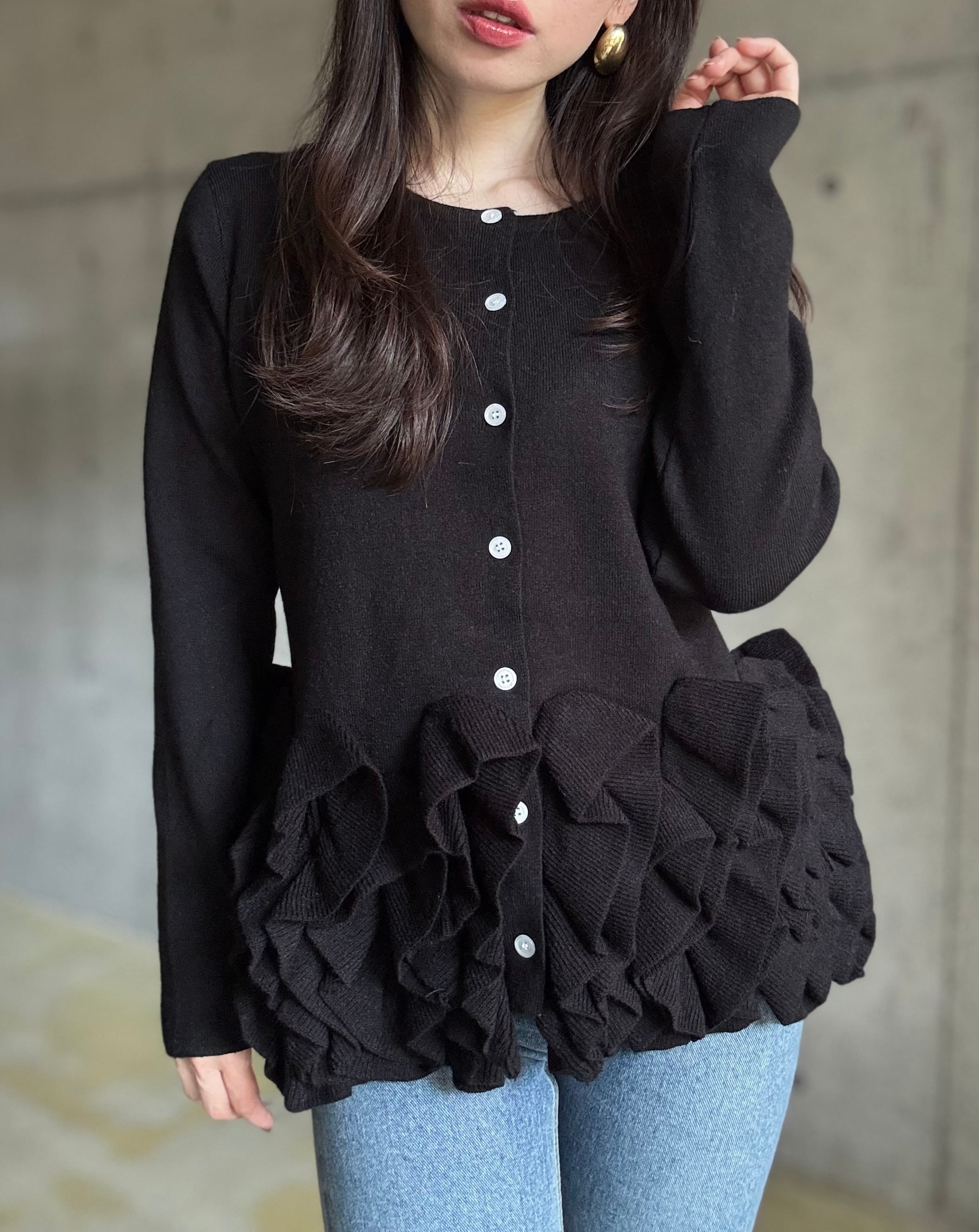【即納】裾ボリュームフリルニットカーディガン【ブラック】
