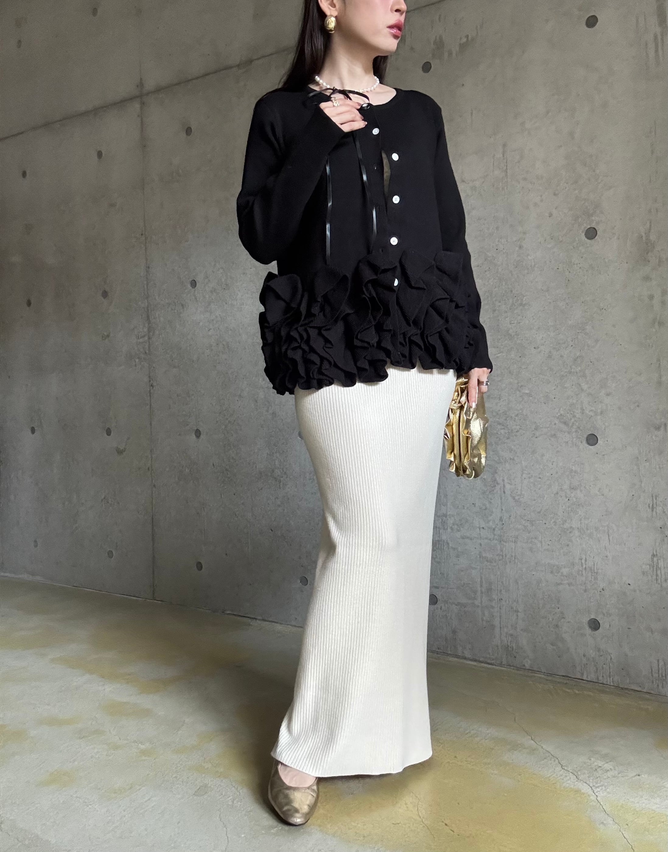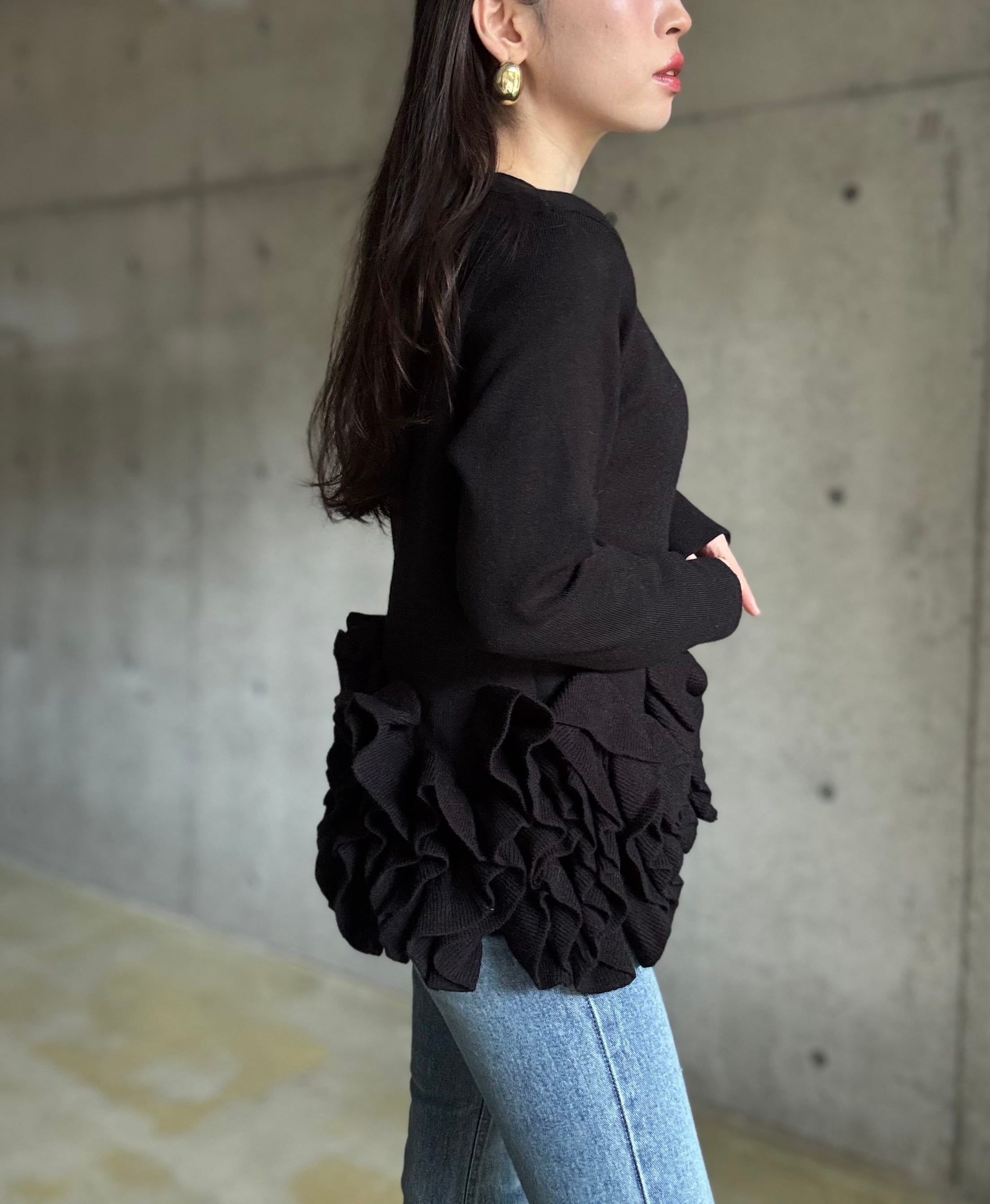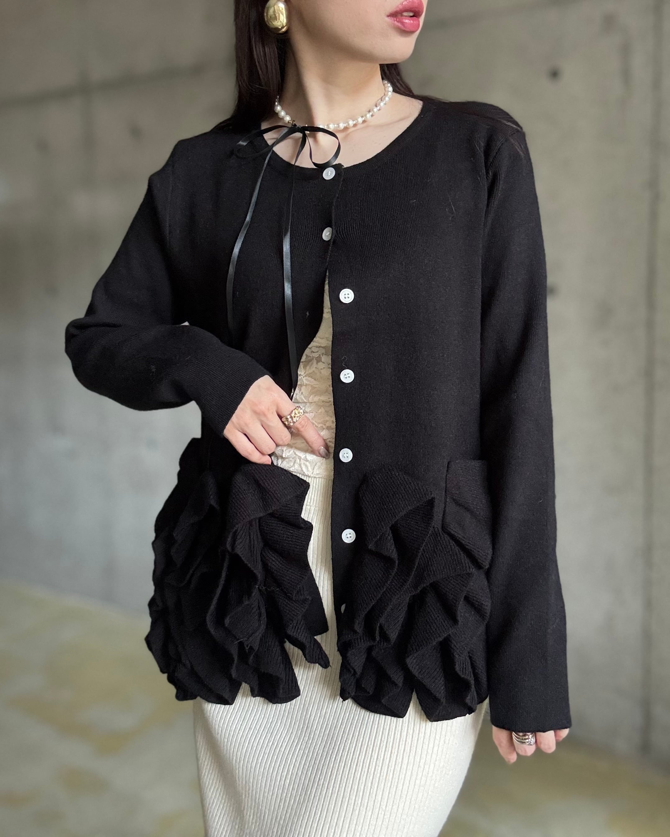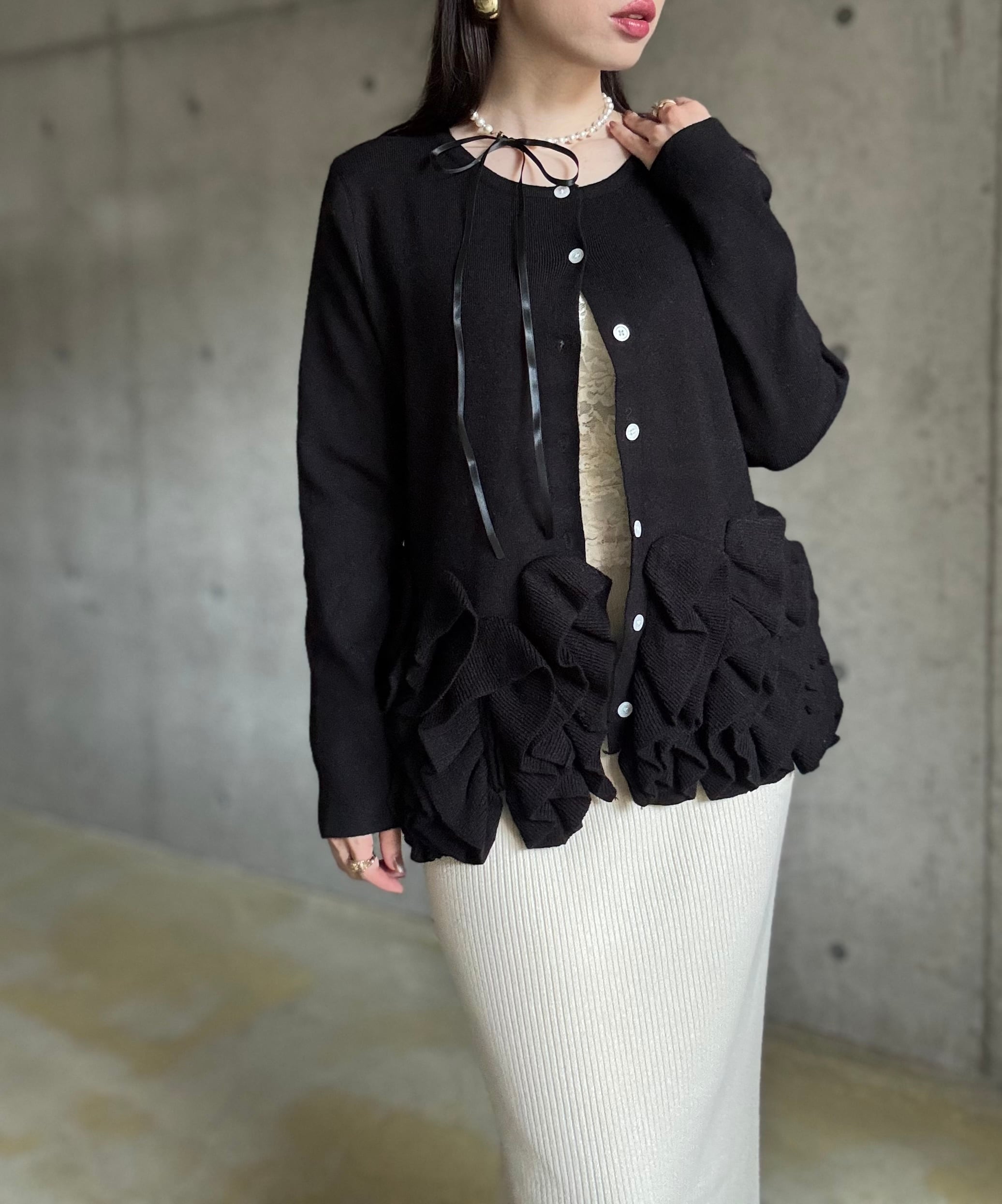 【即納】裾ボリュームフリルニットカーディガン【ブラック】