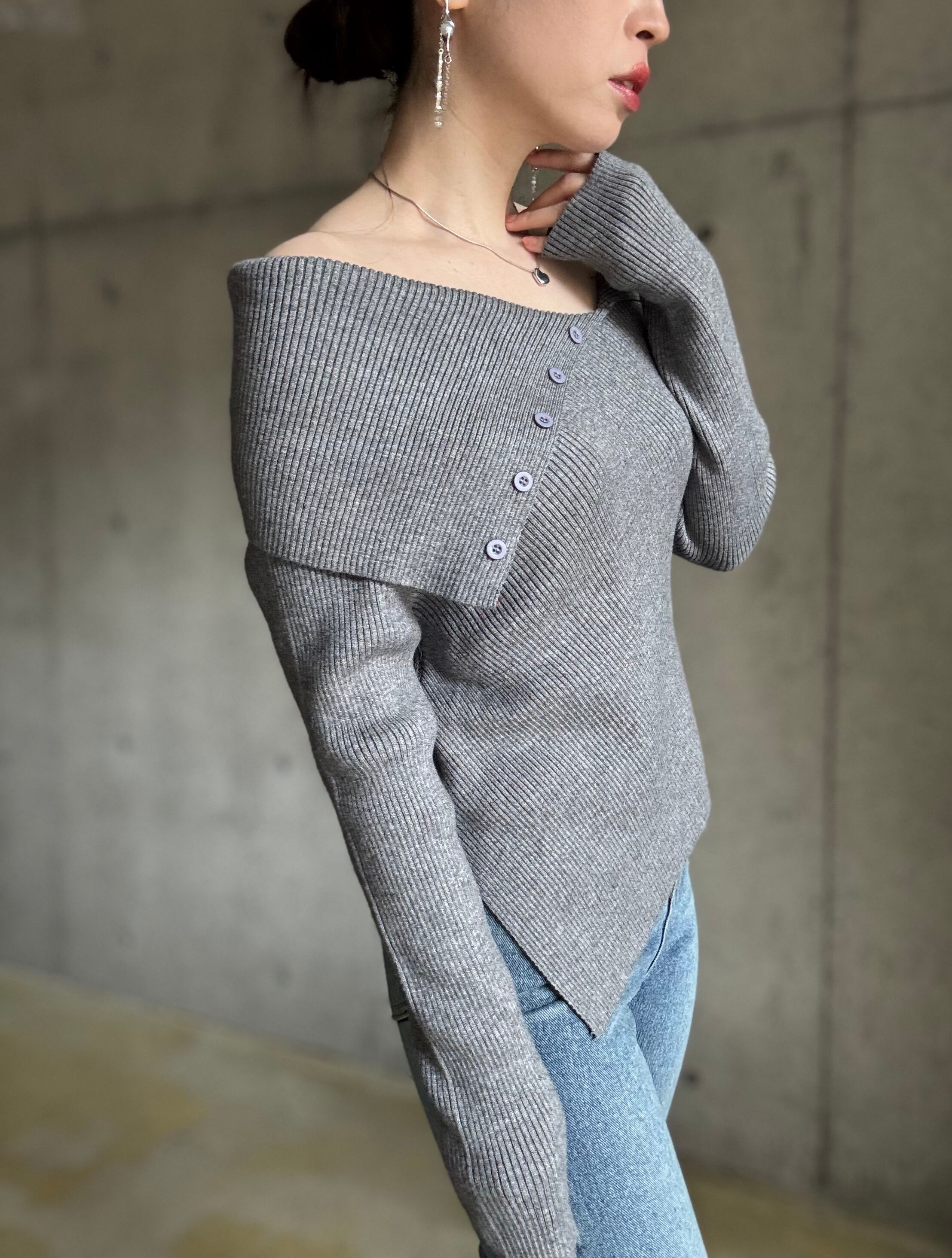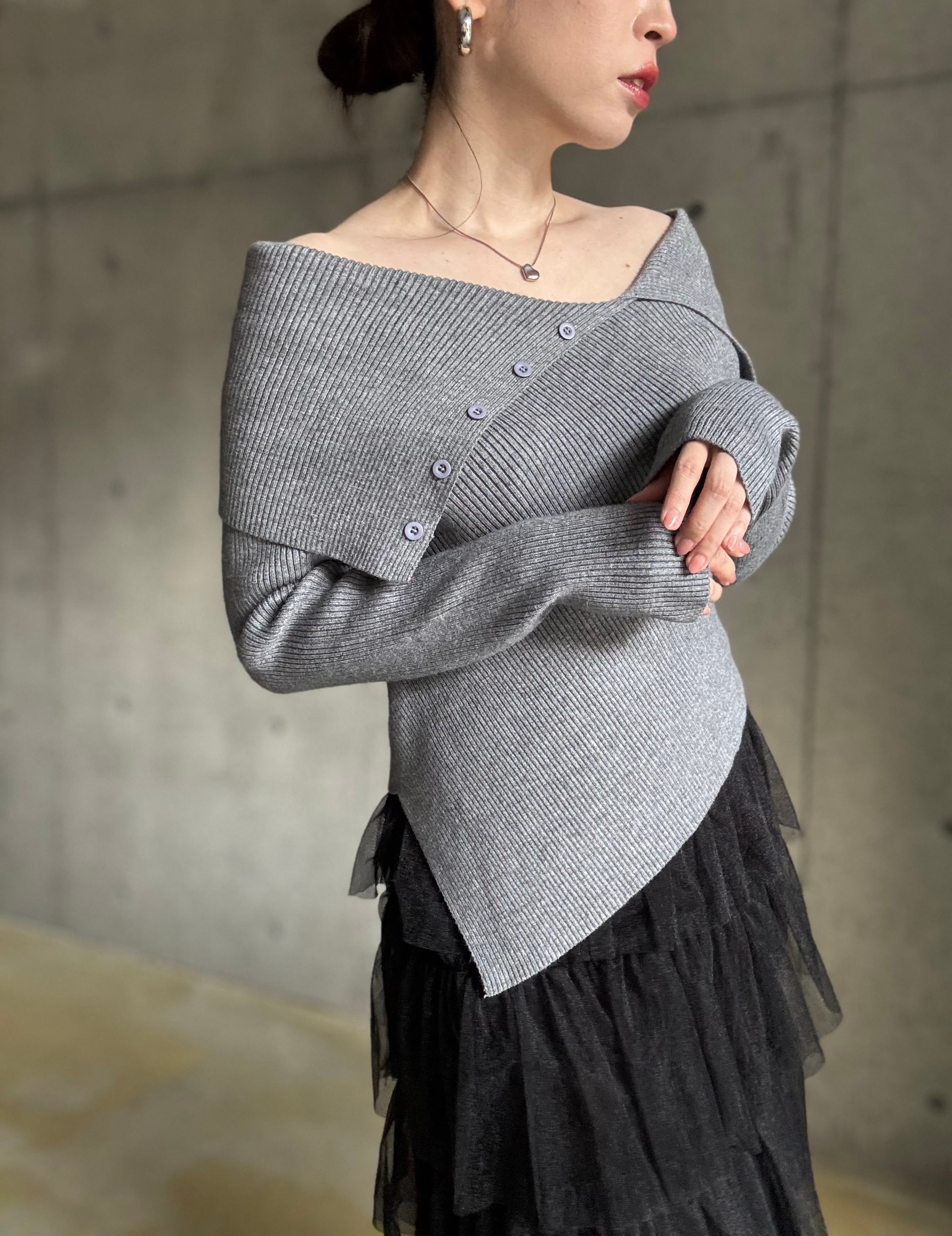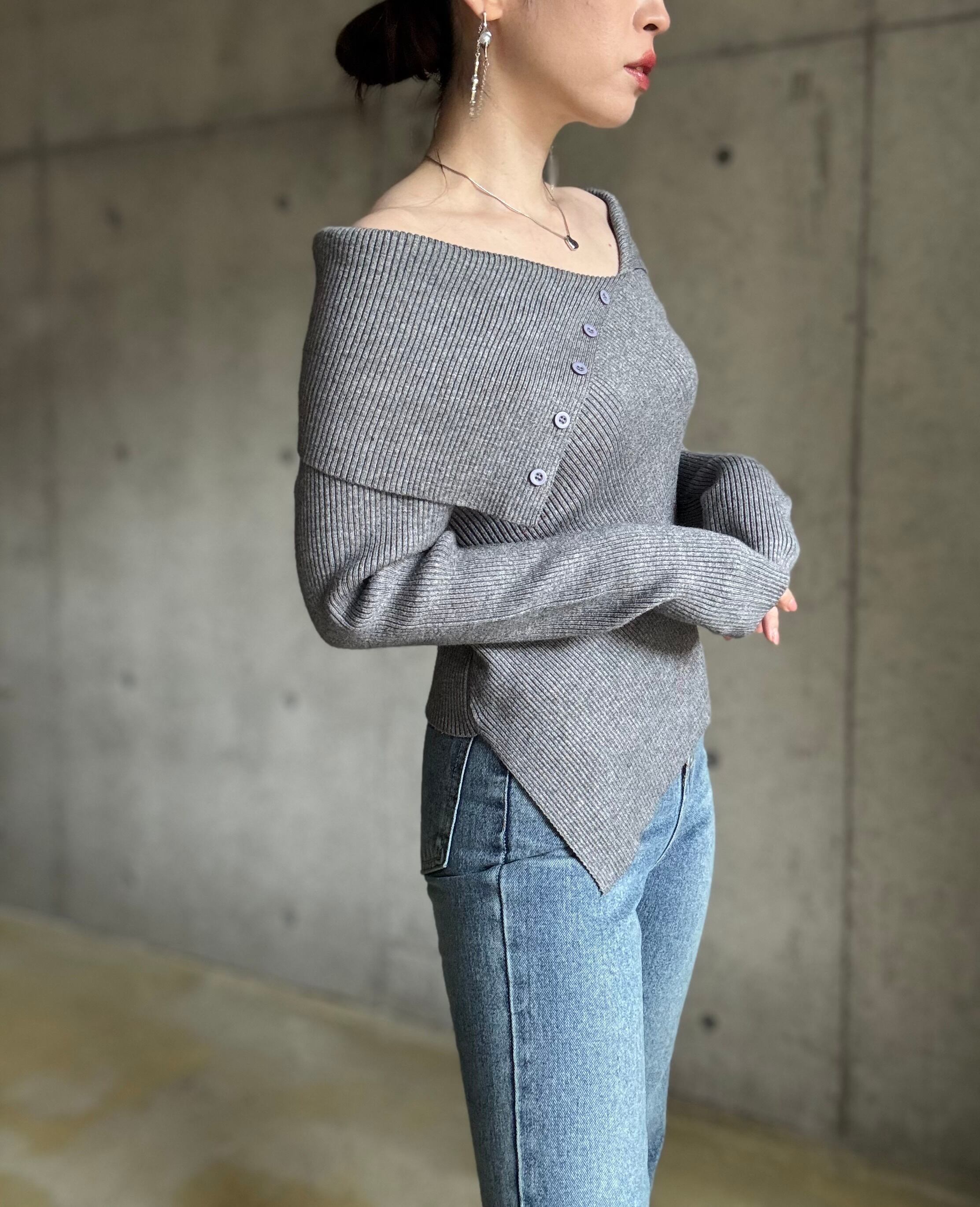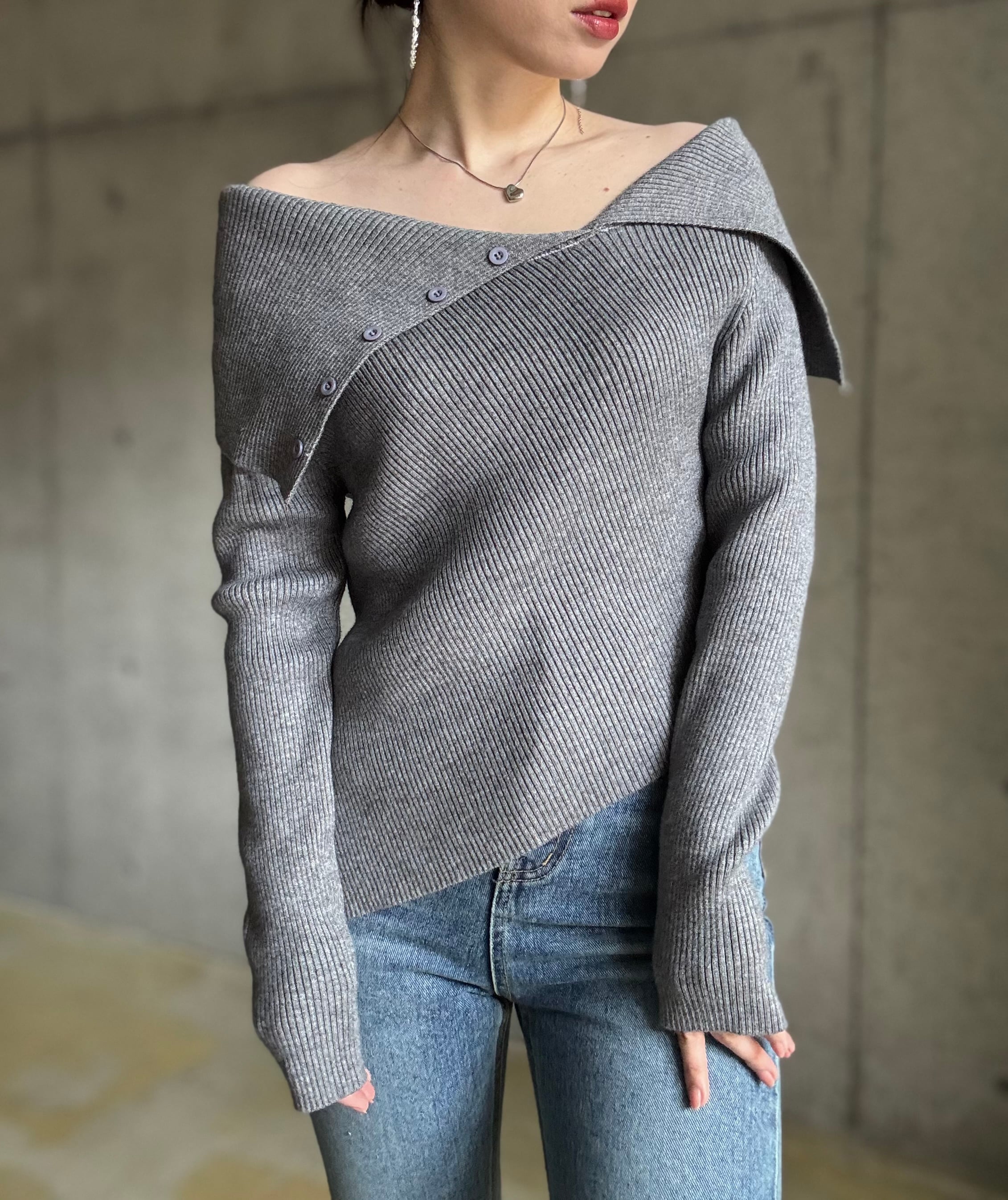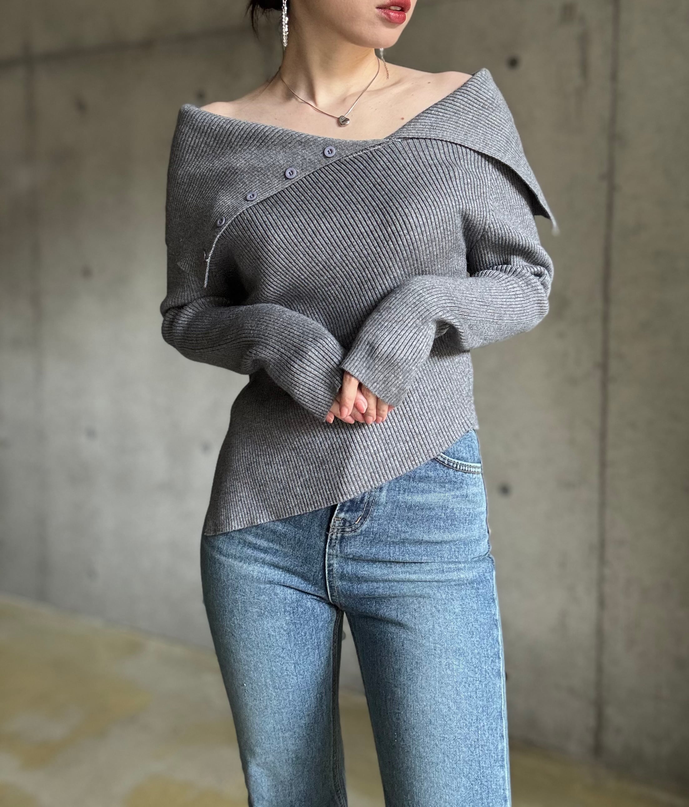 着痩せ効果バツグン!アシンメトリーデザインがポイントのオフショルニットトップス✨