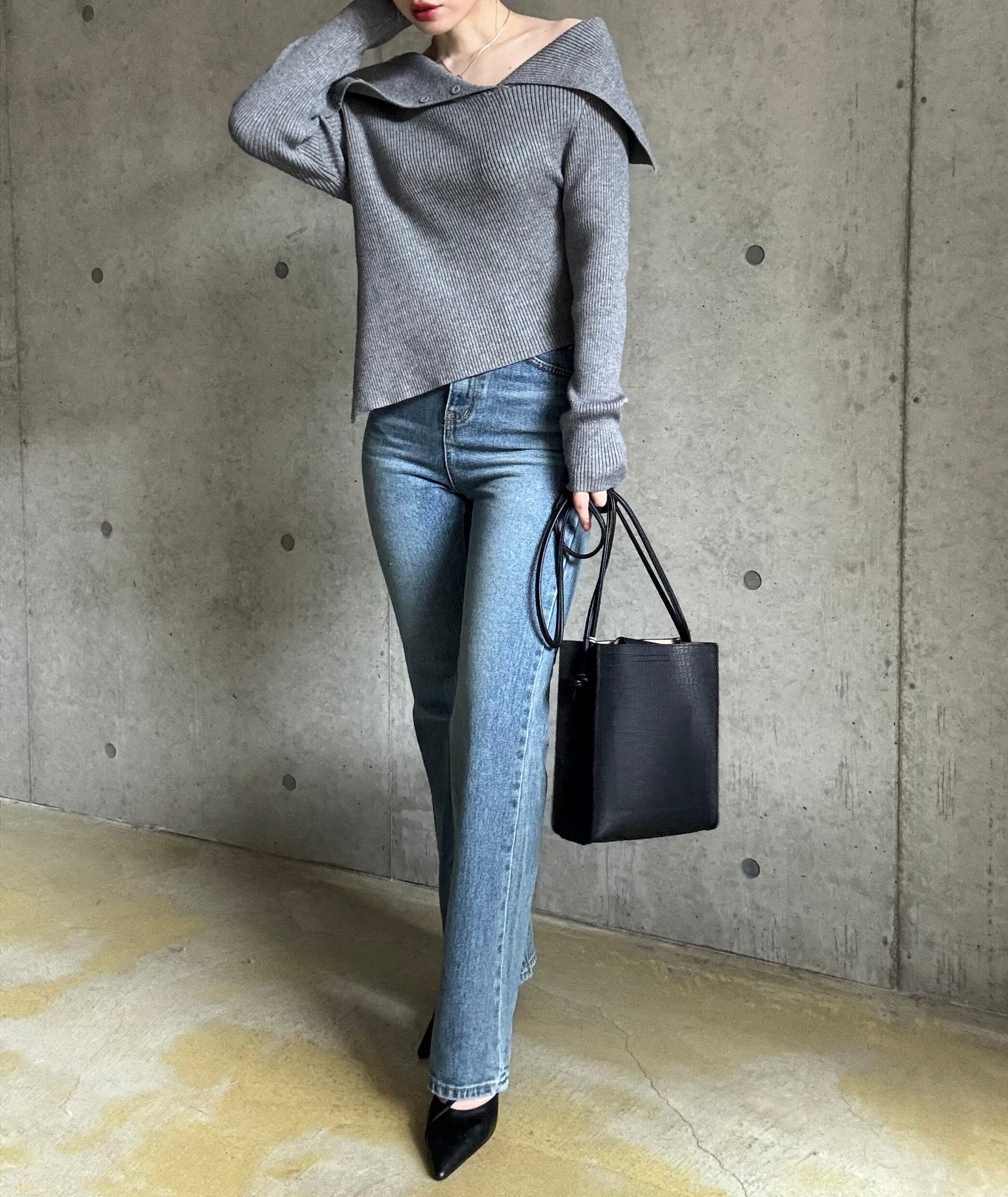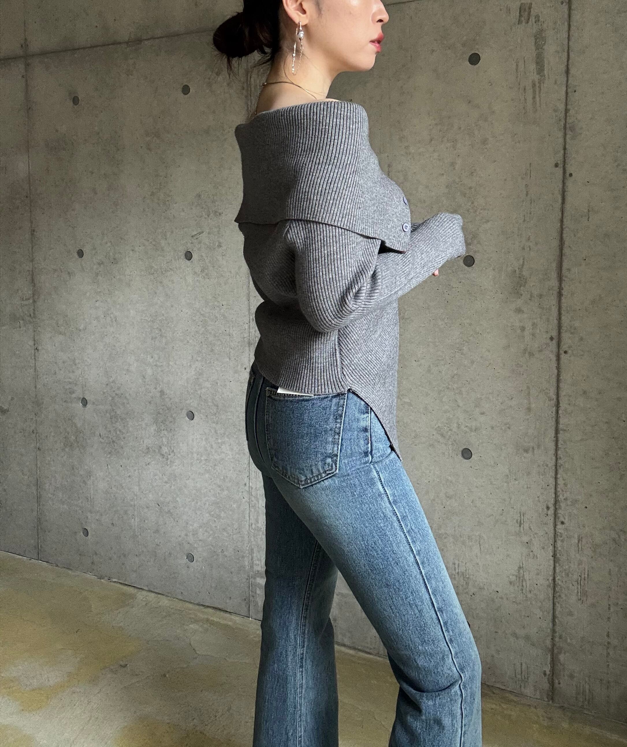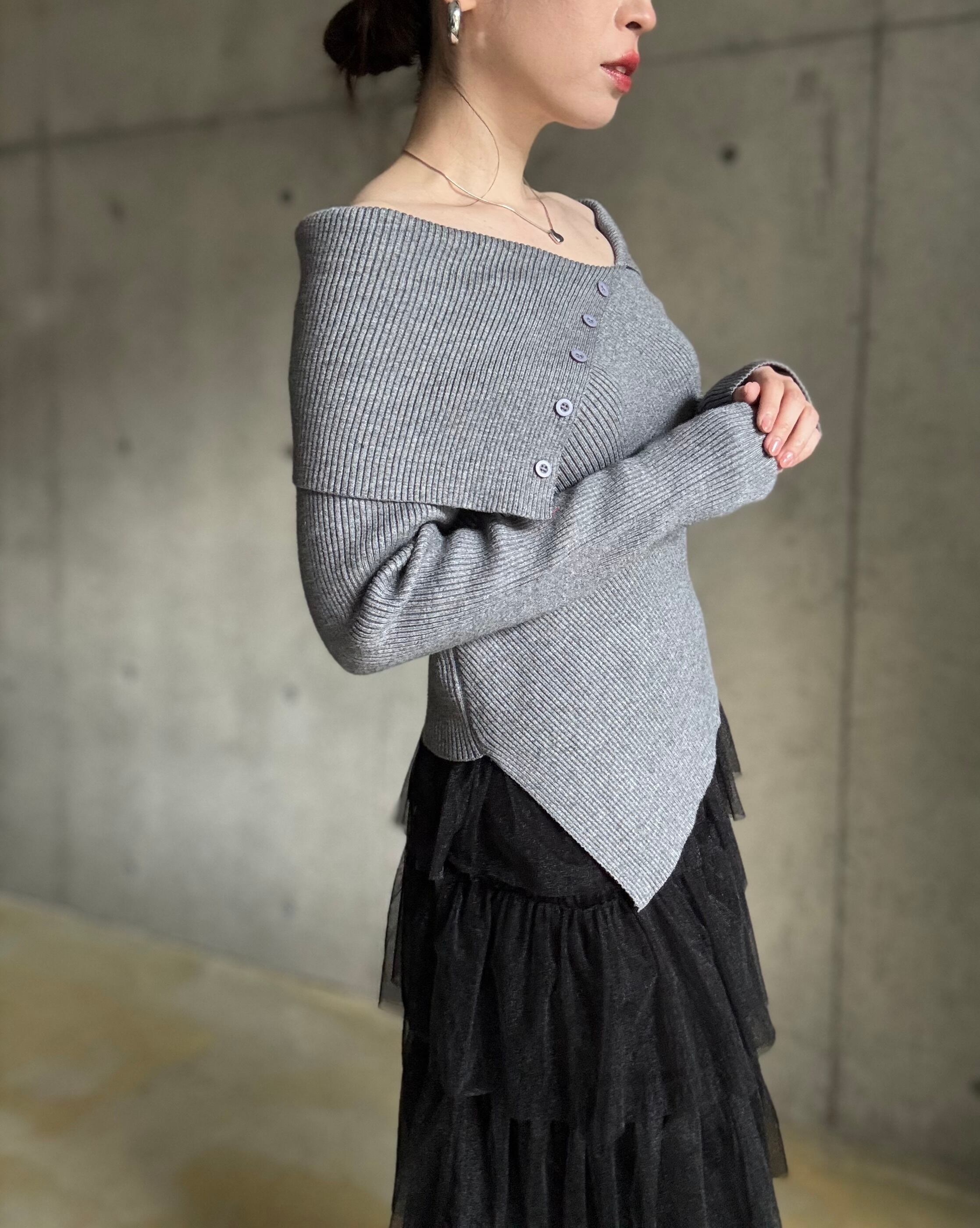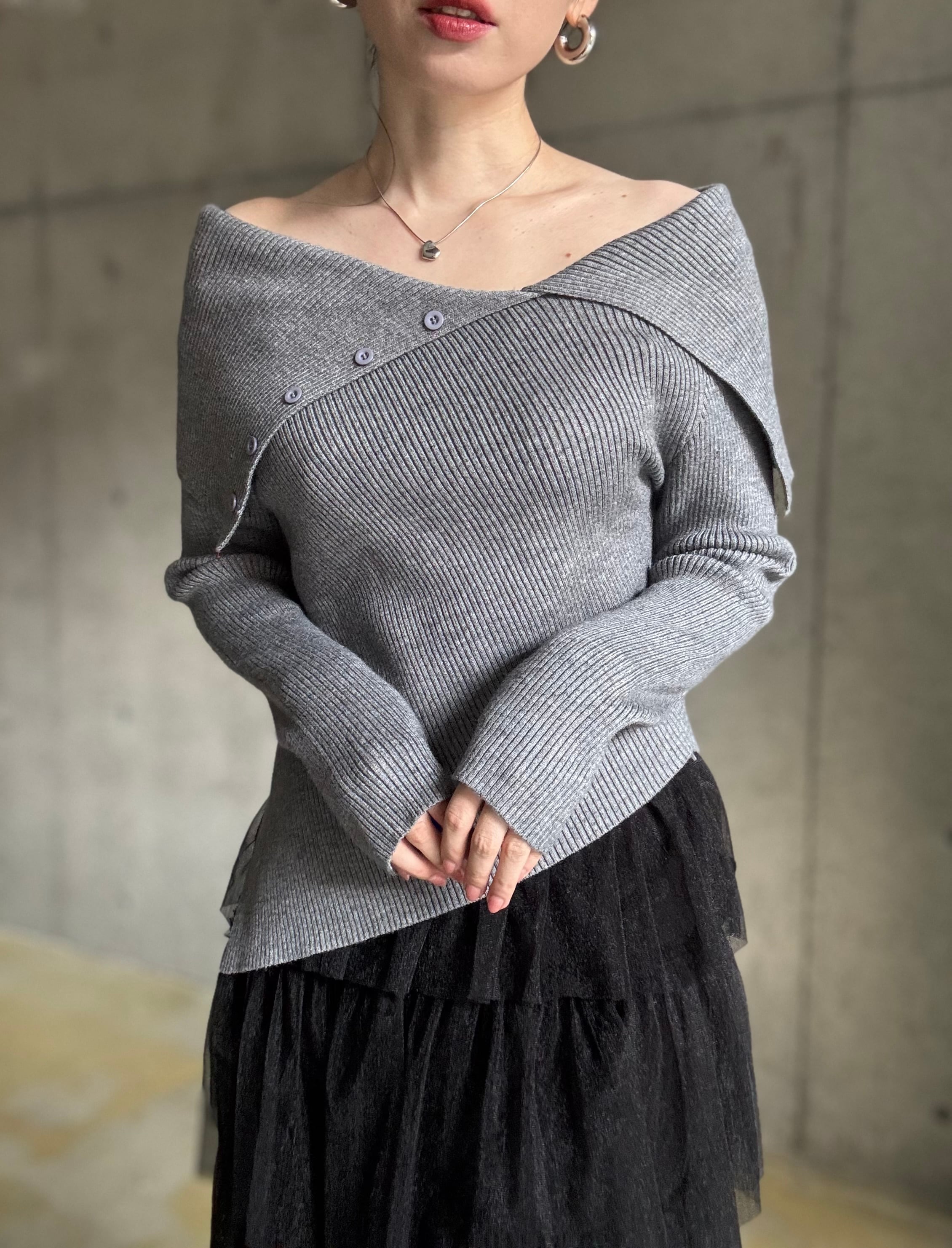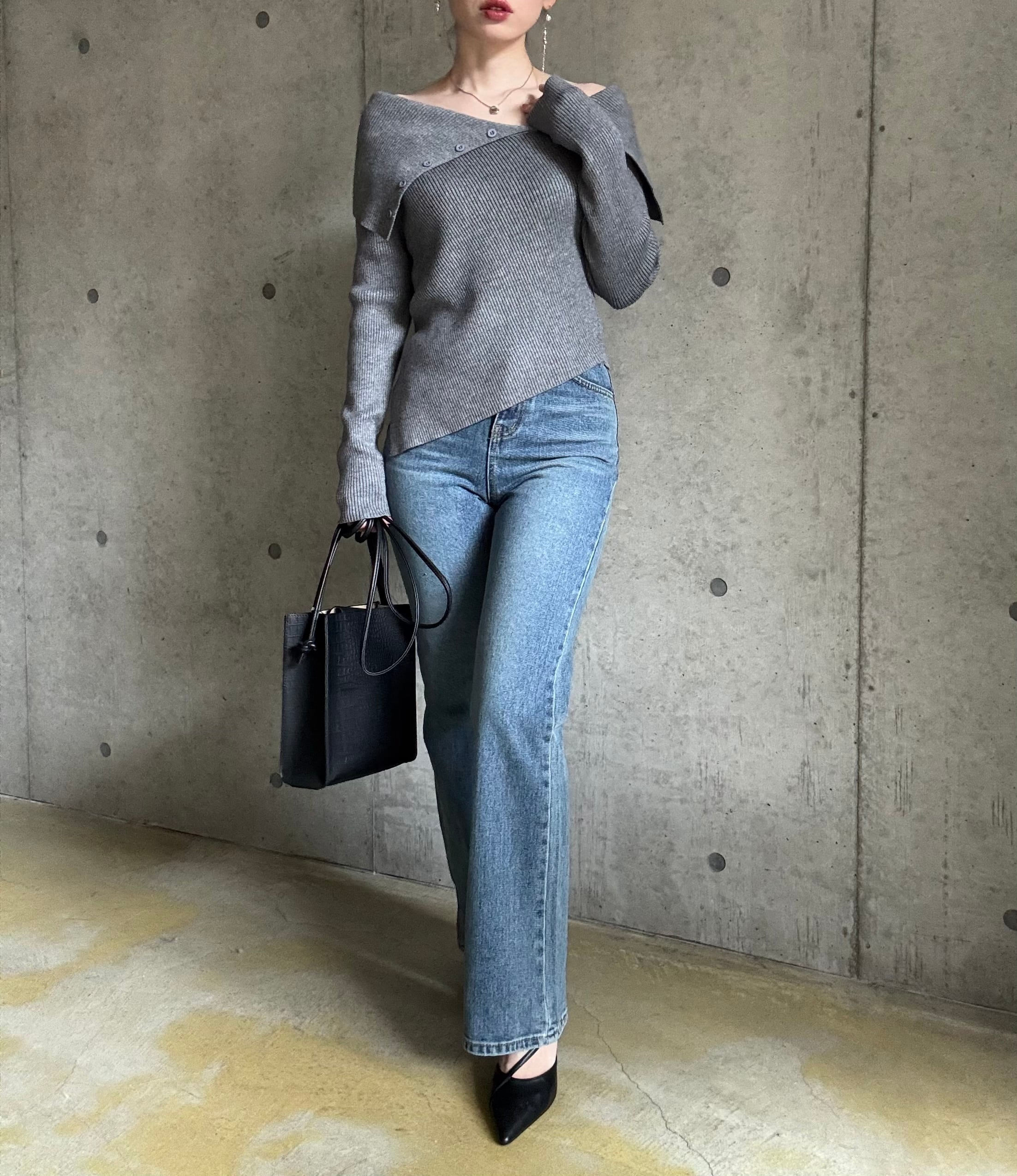 着痩せ効果バツグン!アシンメトリーデザインがポイントのオフショルニットトップス✨