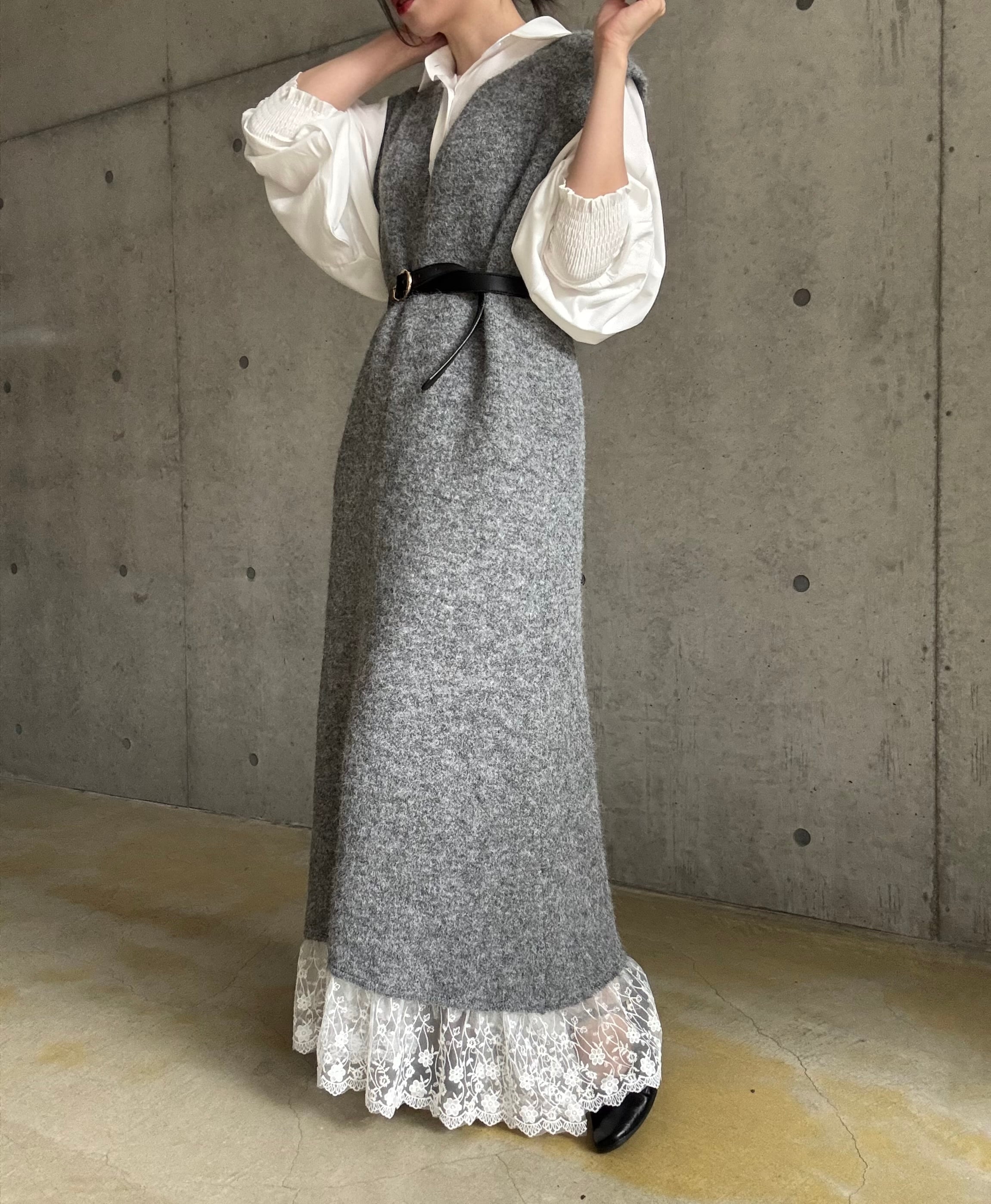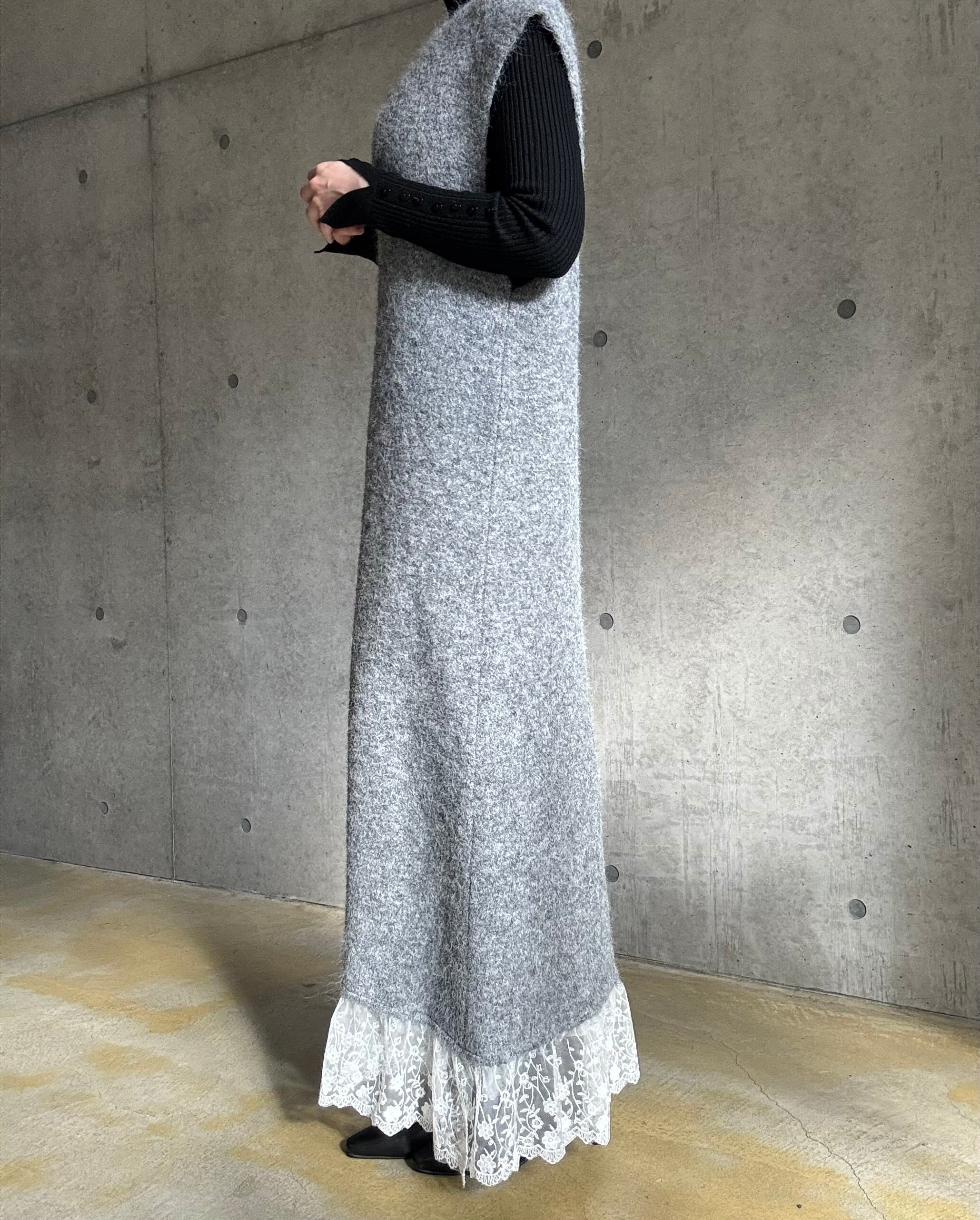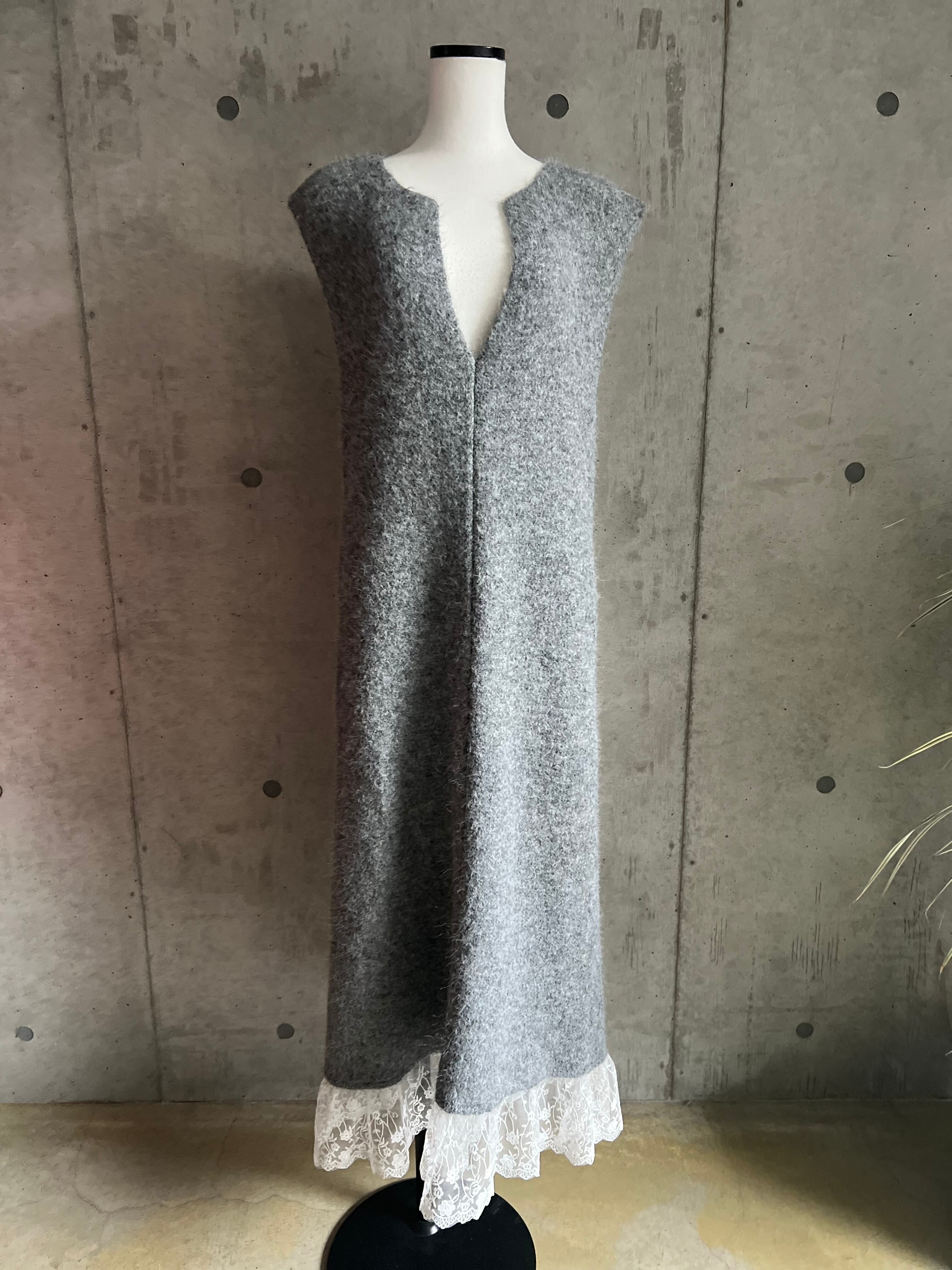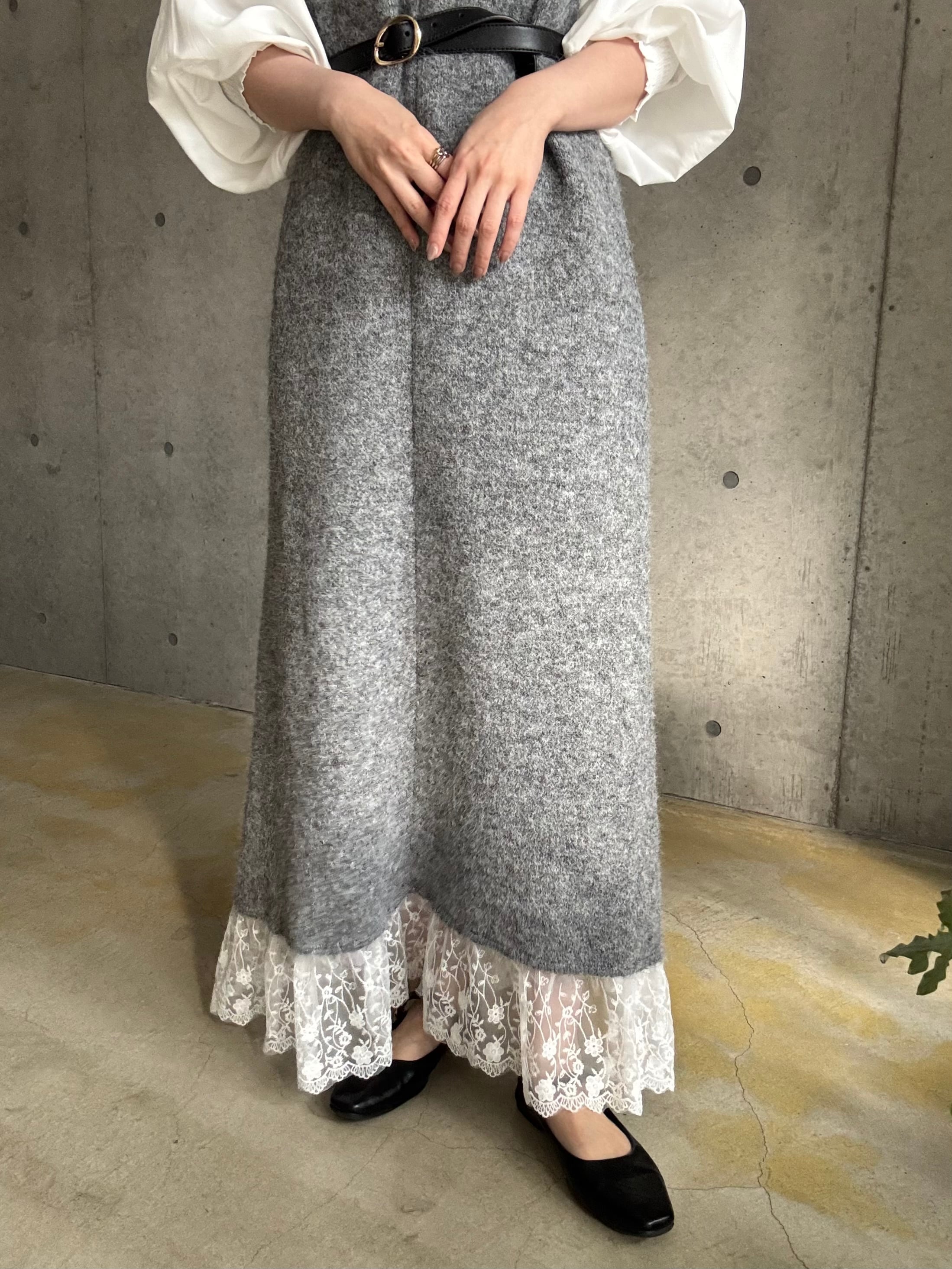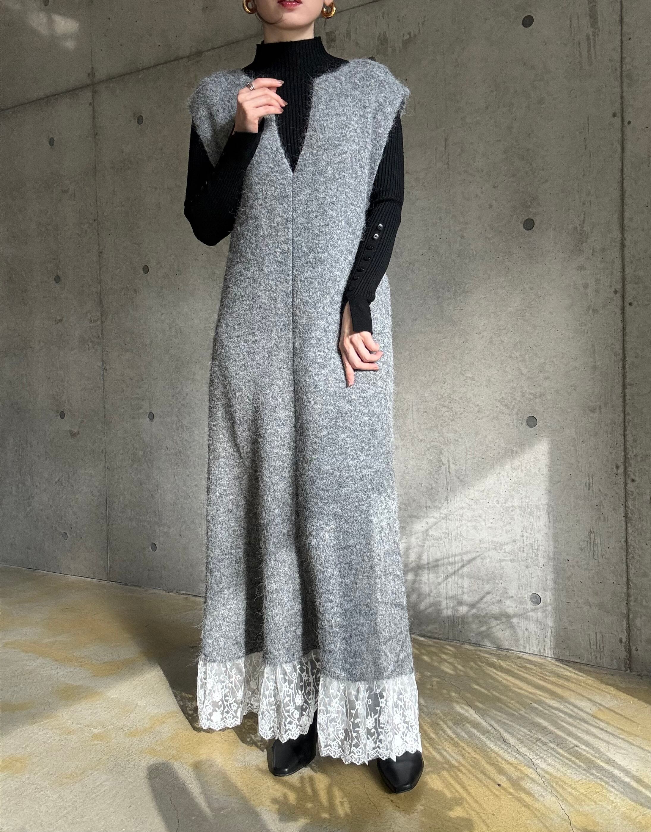 【即納】裾レースキーネックロングニットワンピース【グレー】