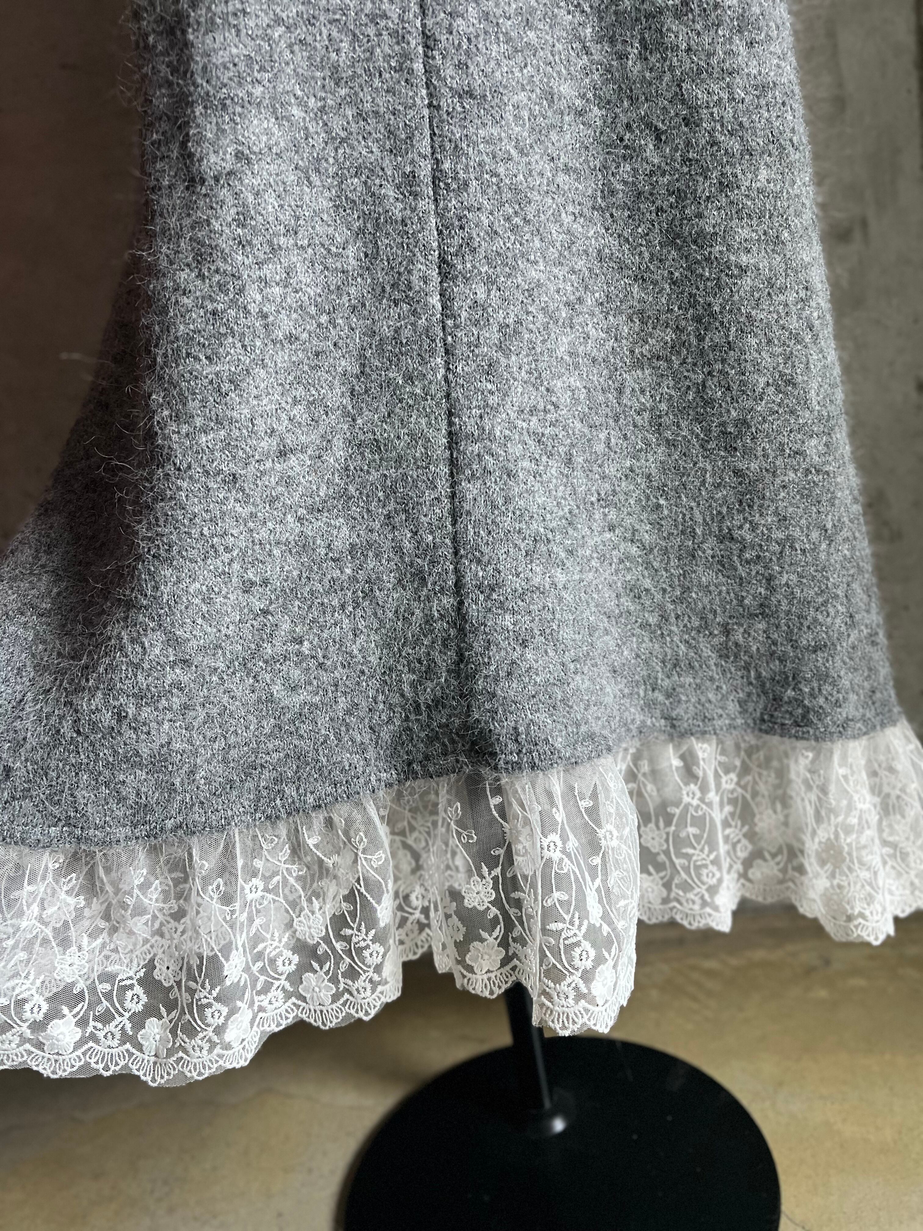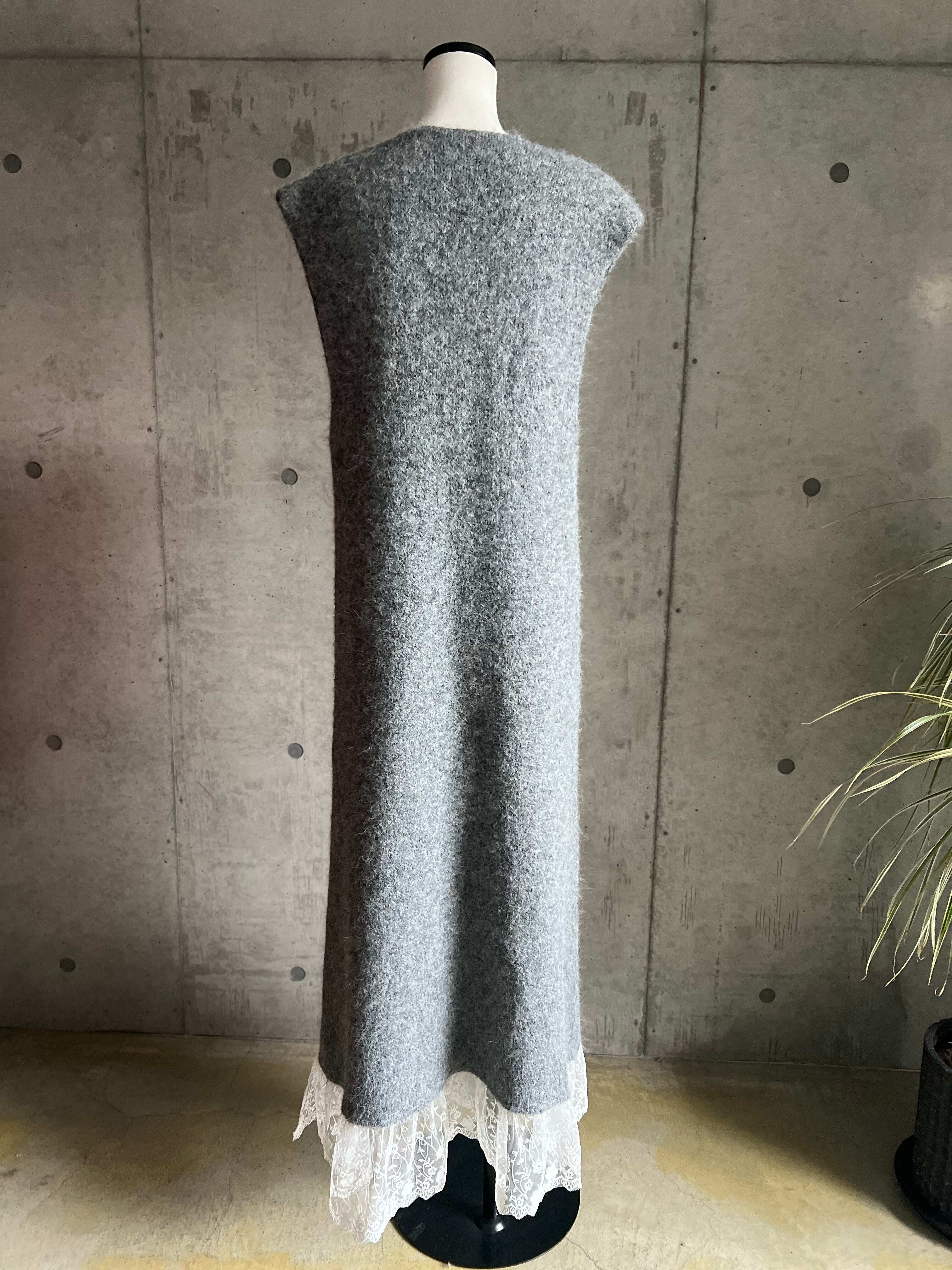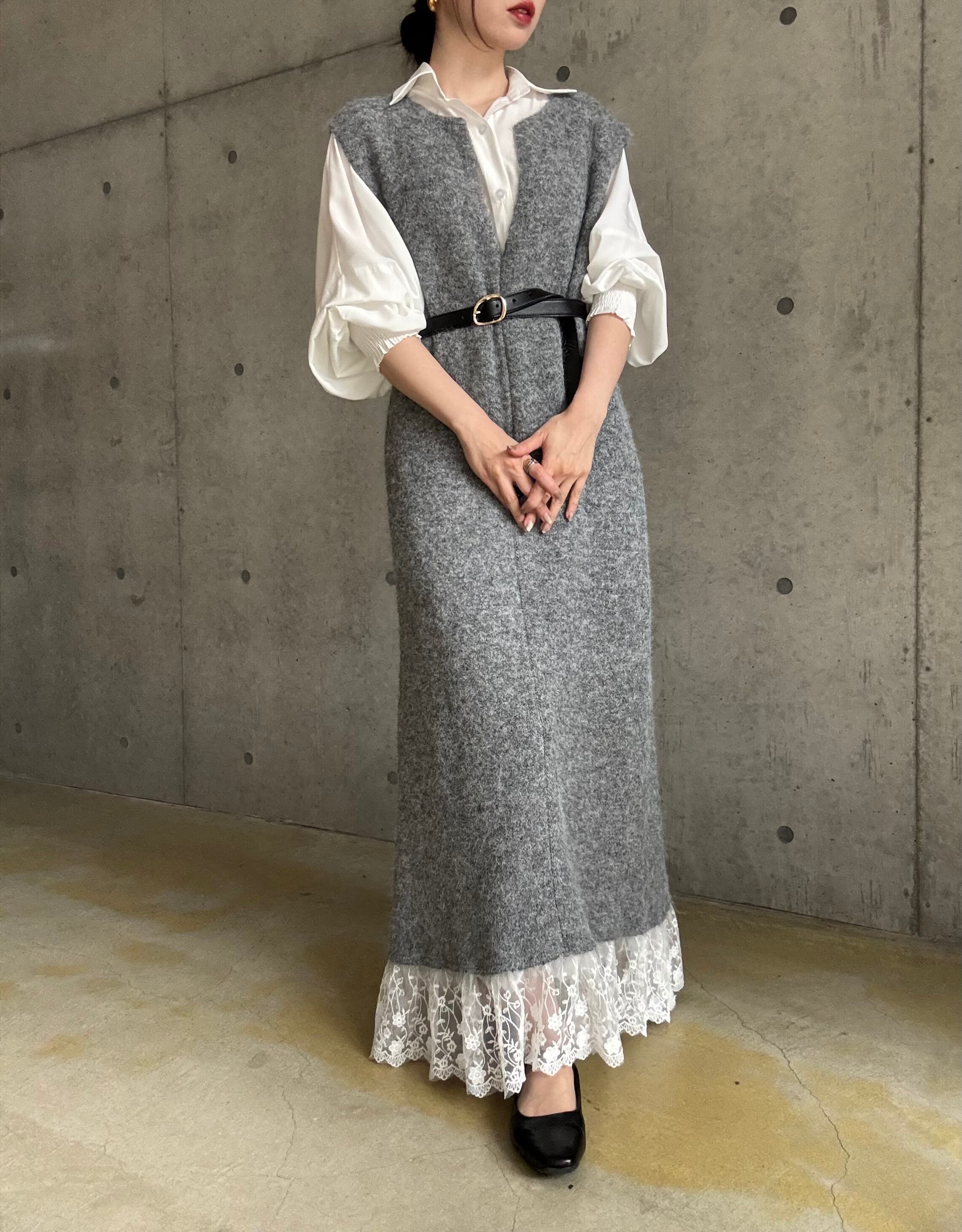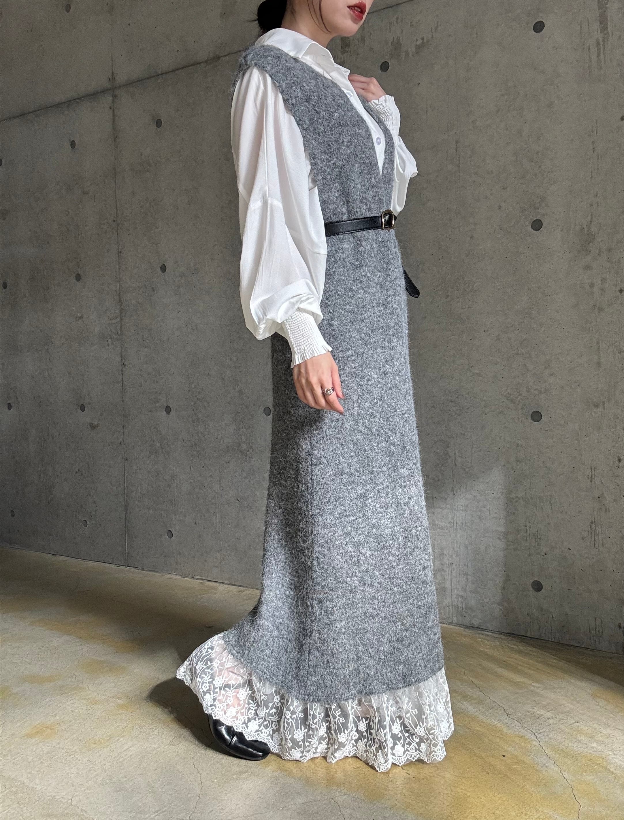 【即納】裾レースキーネックロングニットワンピース【グレー】