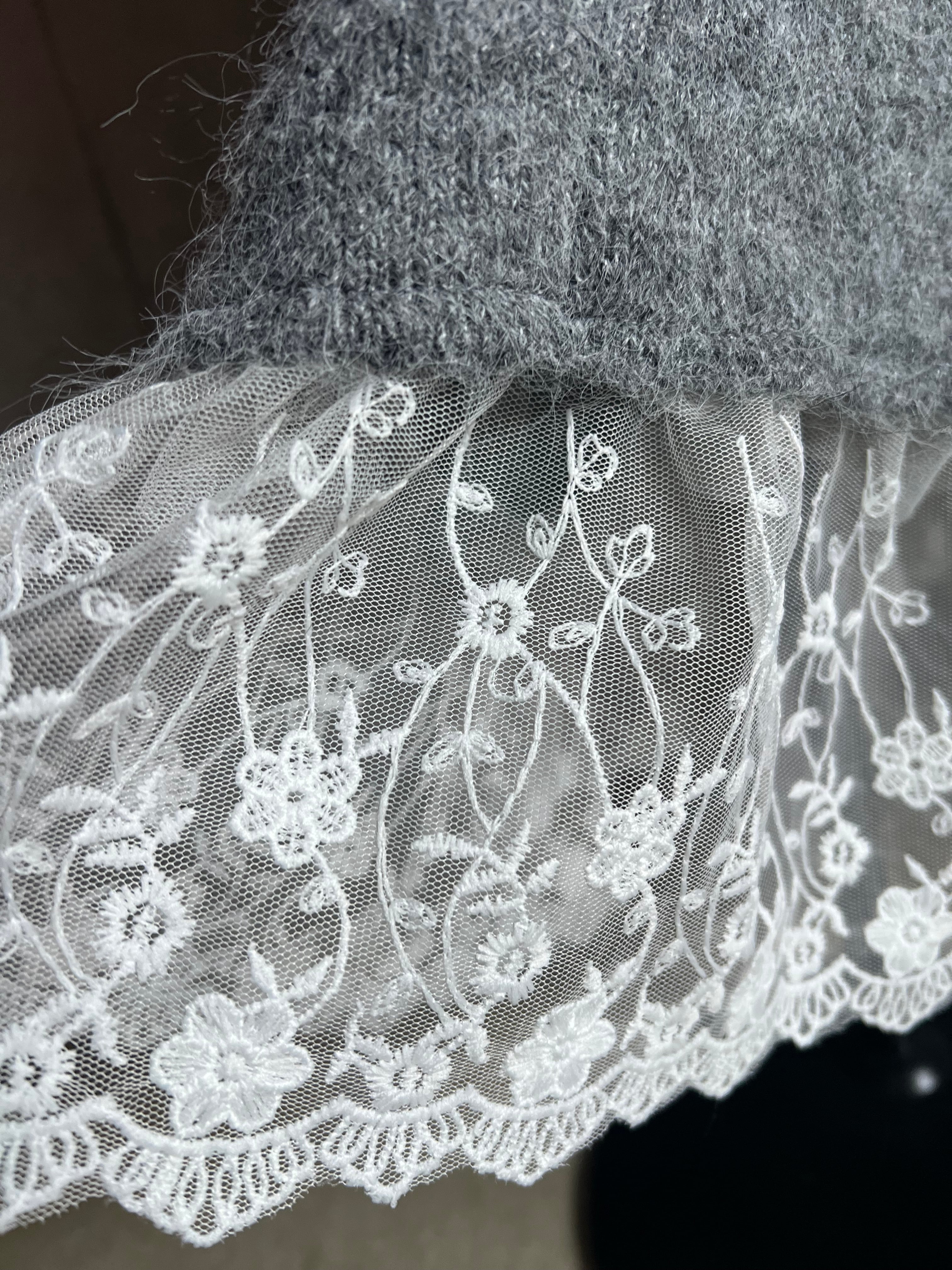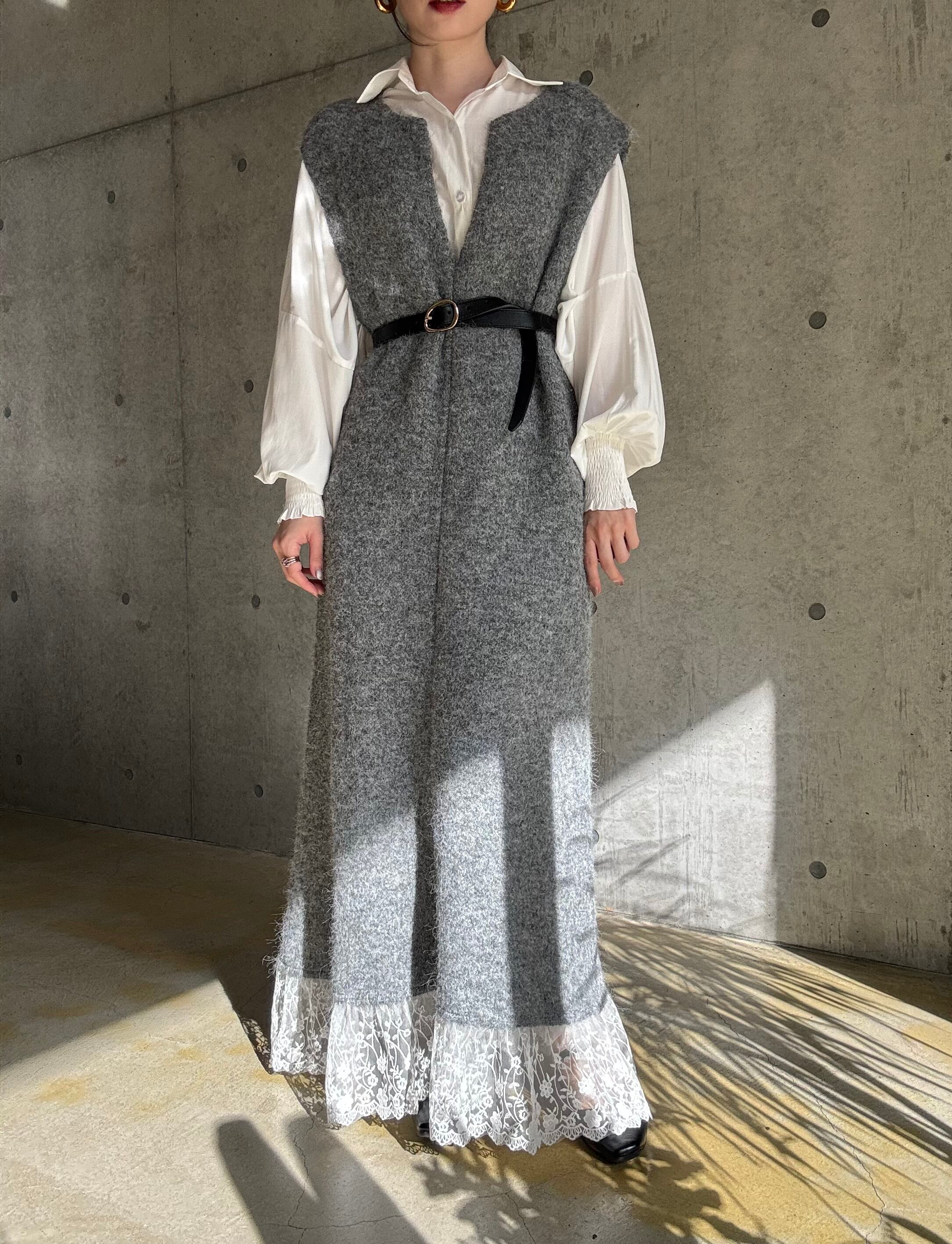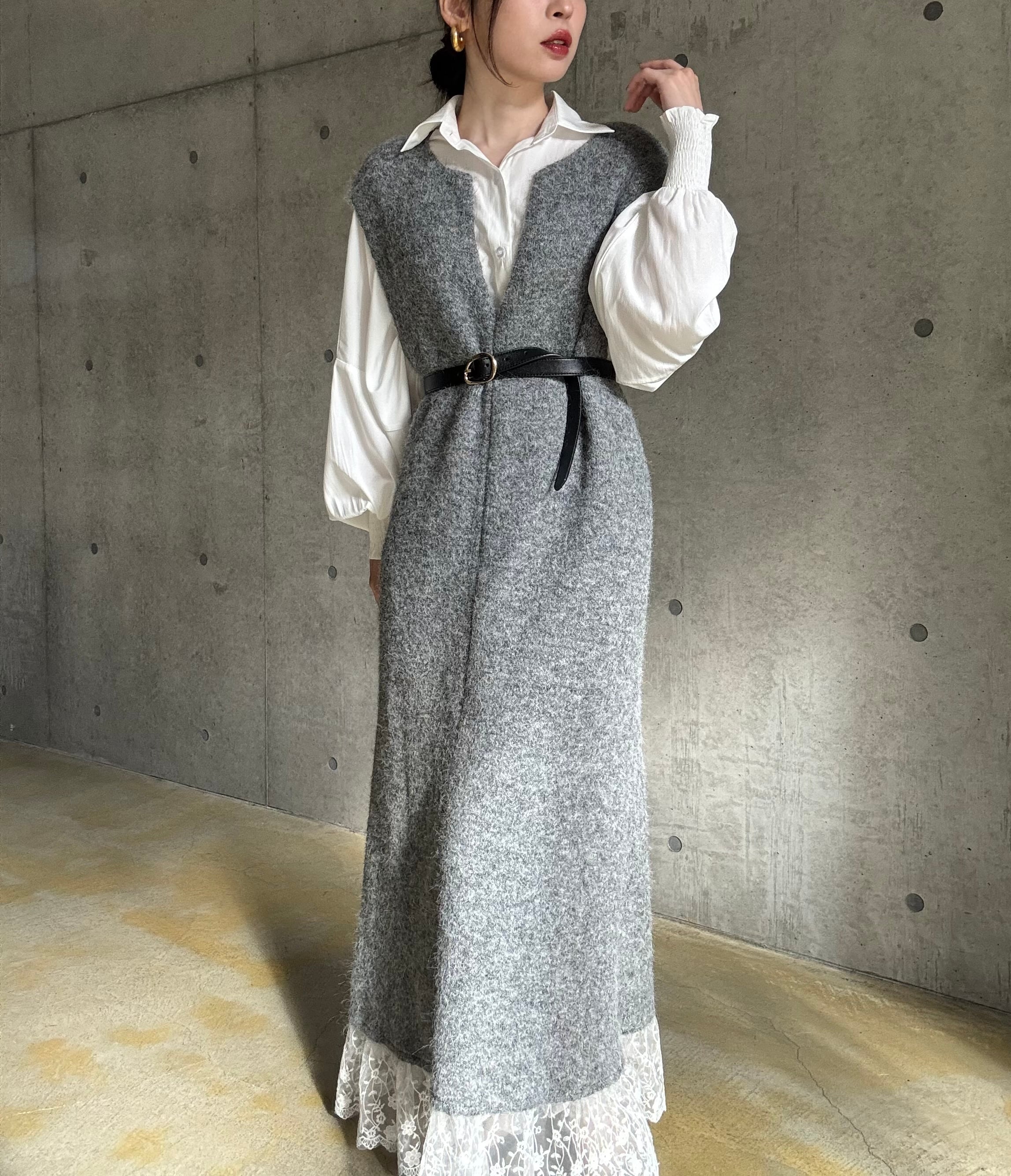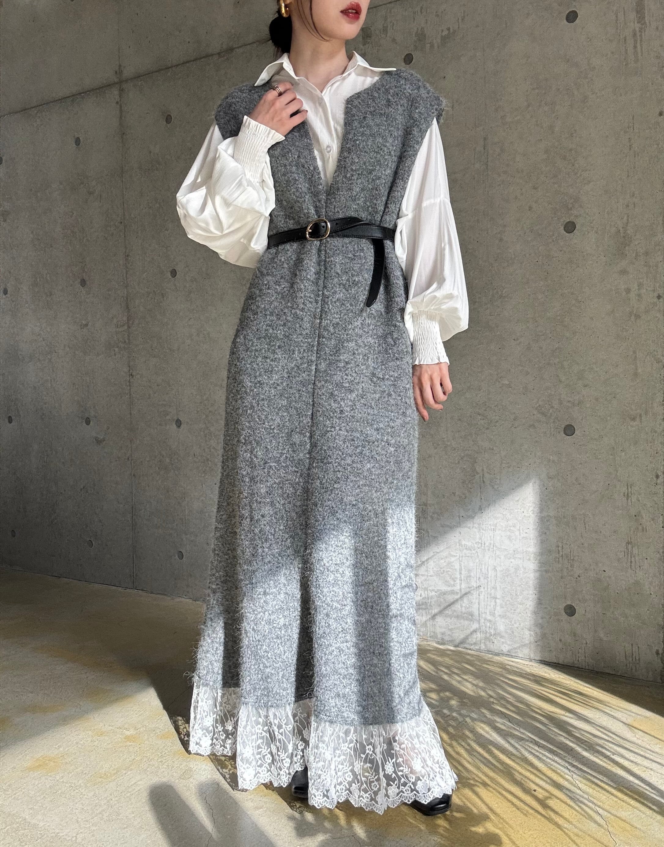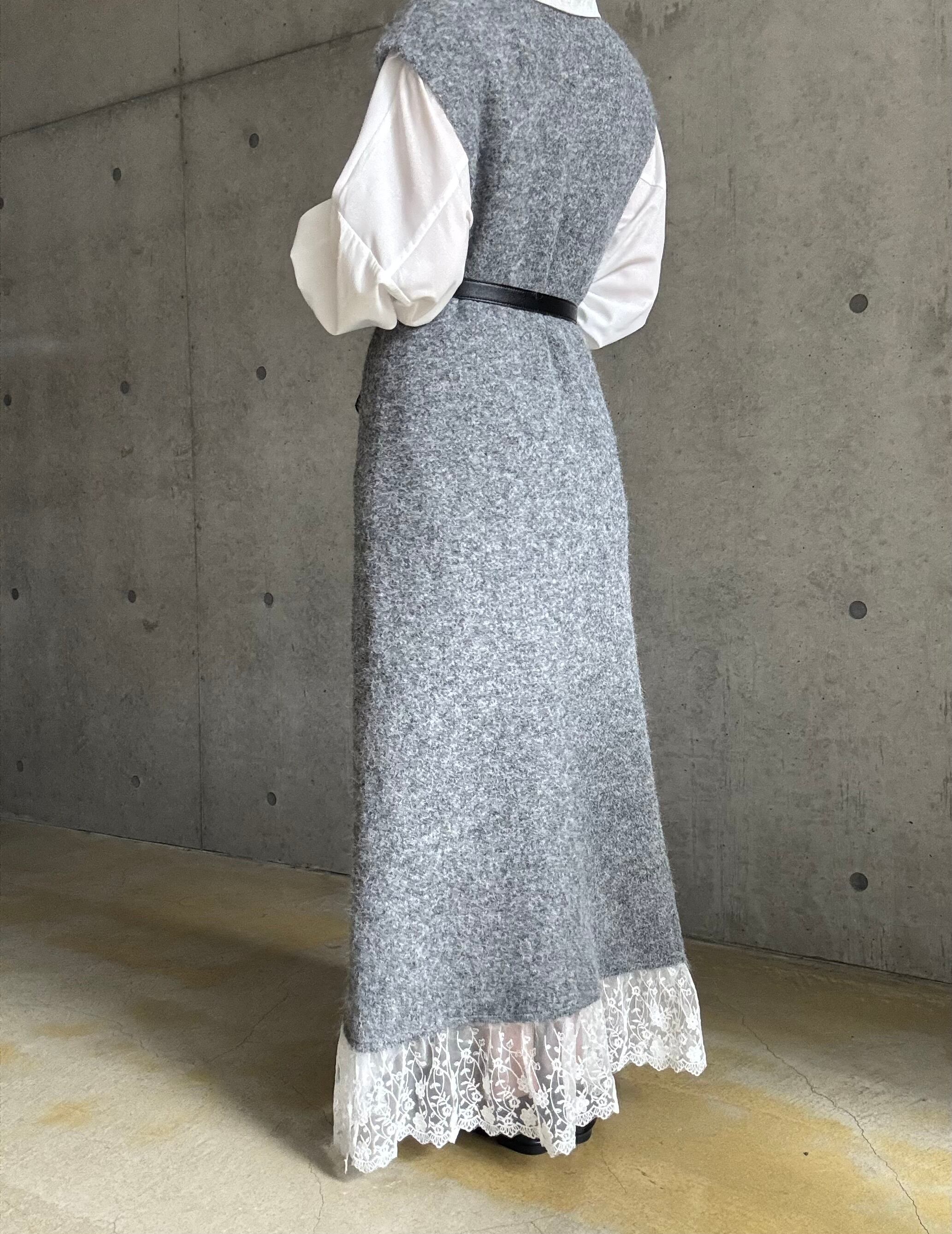 【即納】裾レースキーネックロングニットワンピース【グレー】