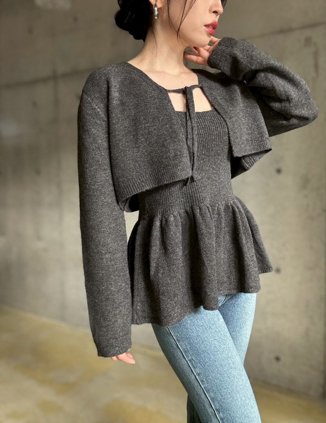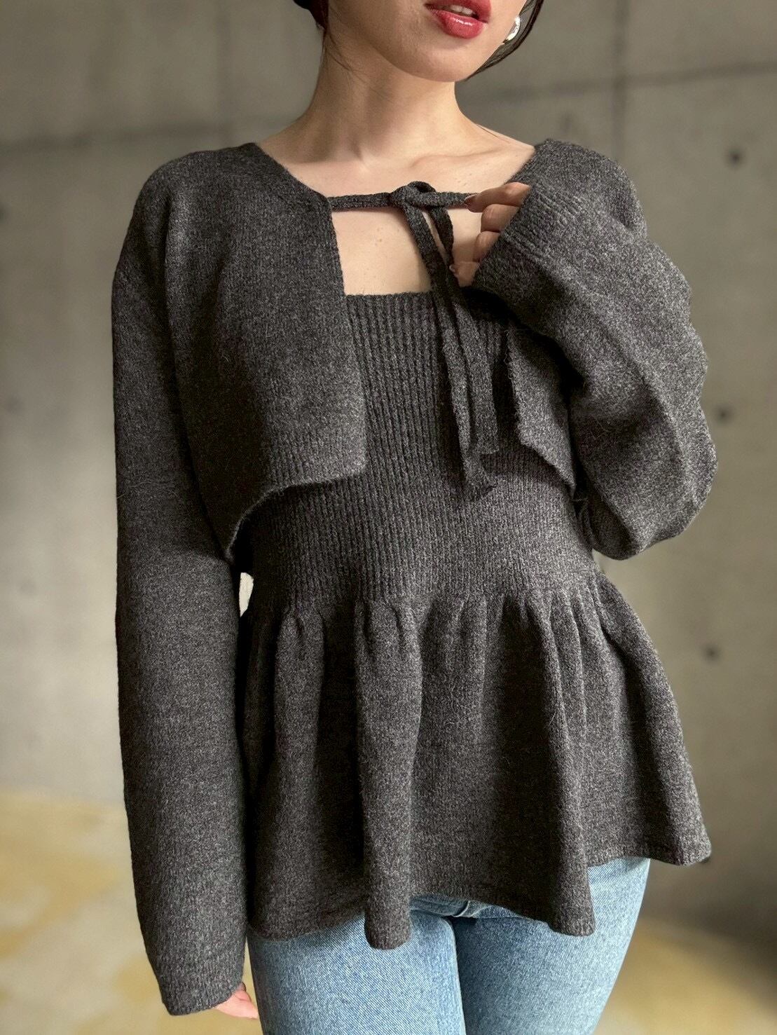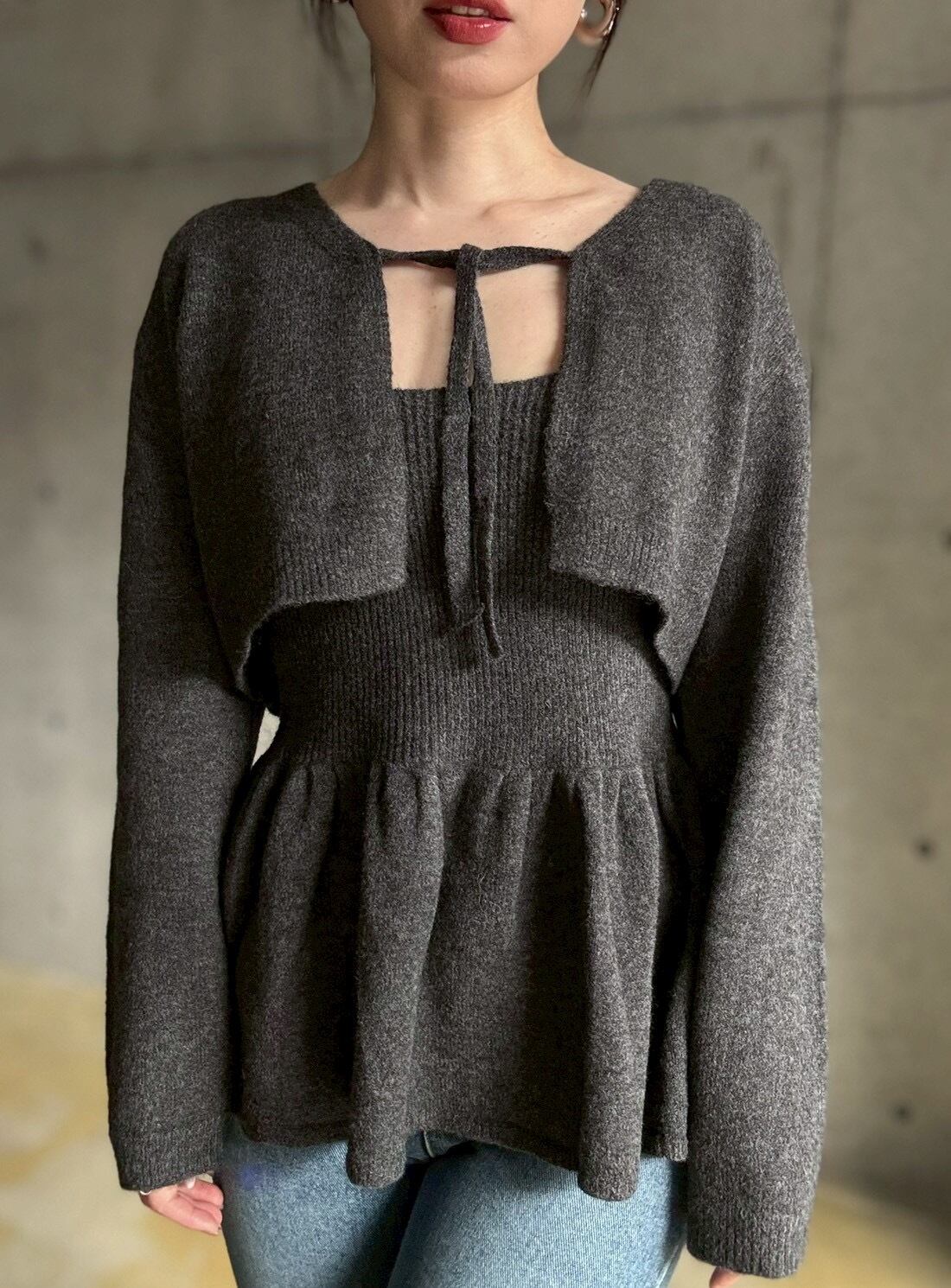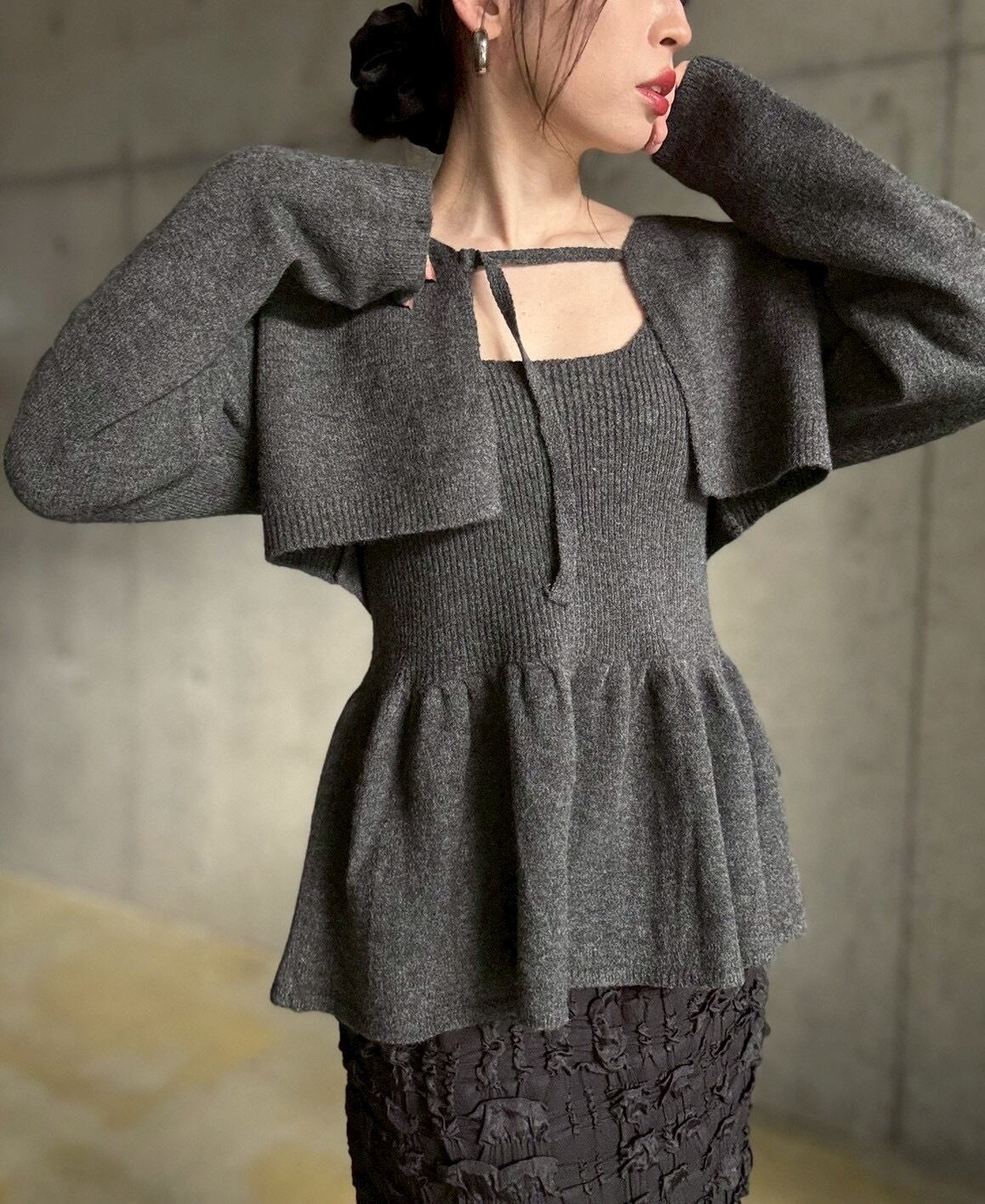 ニットペプラムキャミソール+ボレロカーディガンset【チャコール】