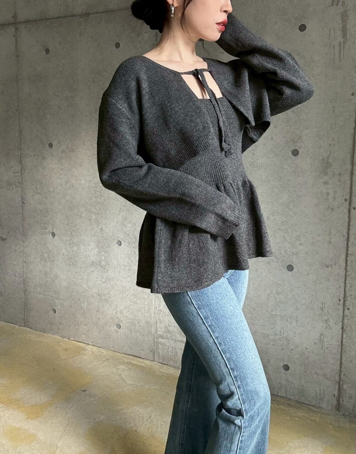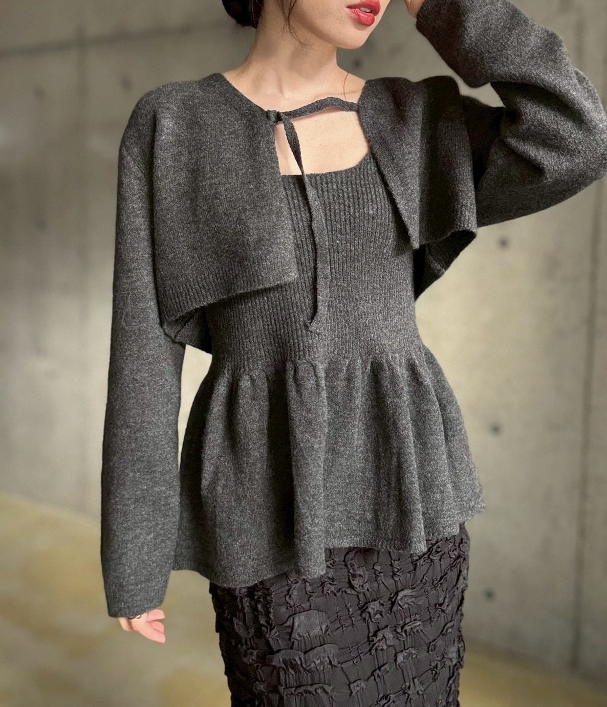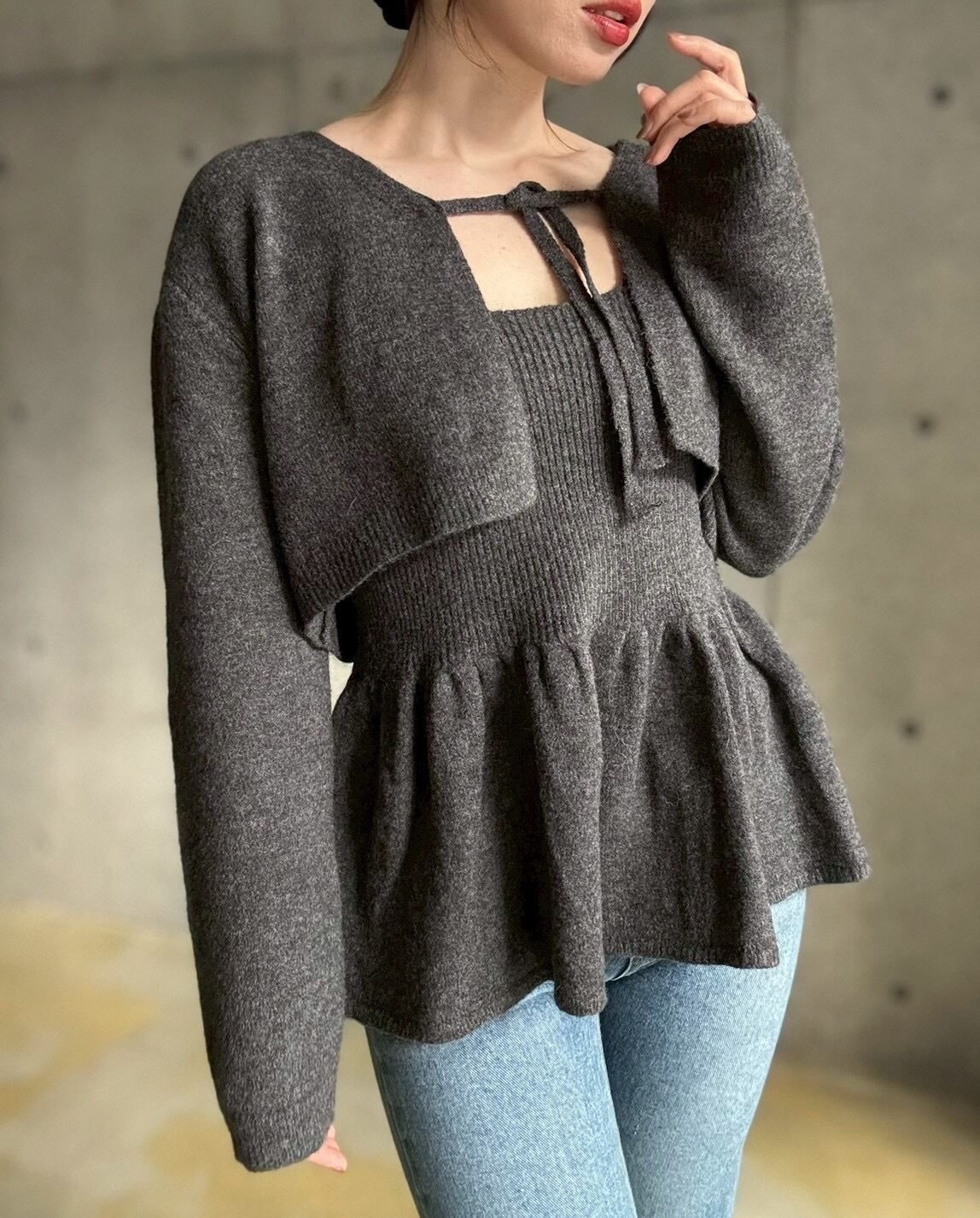 ニットペプラムキャミソール+ボレロカーディガンset【チャコール】
