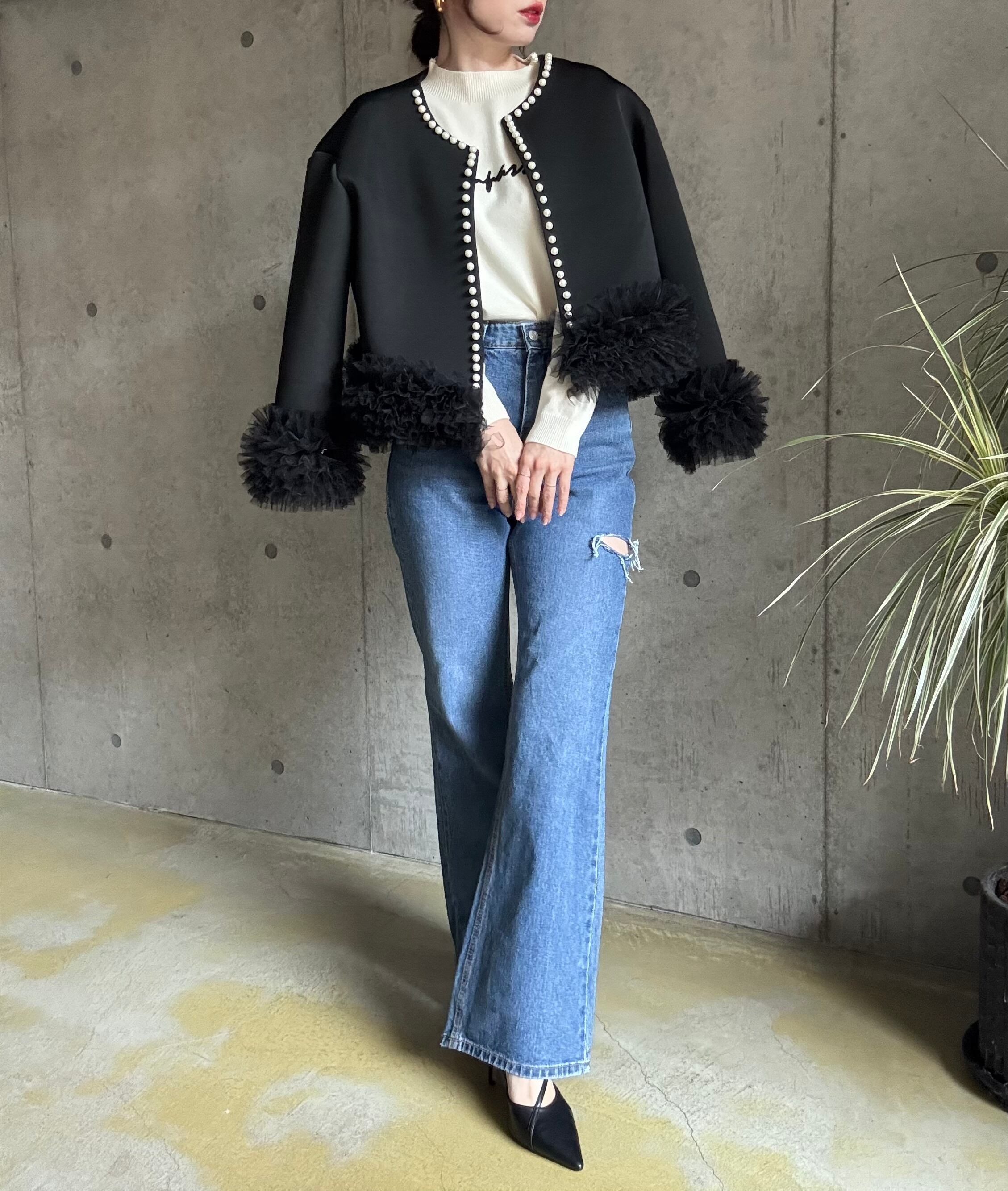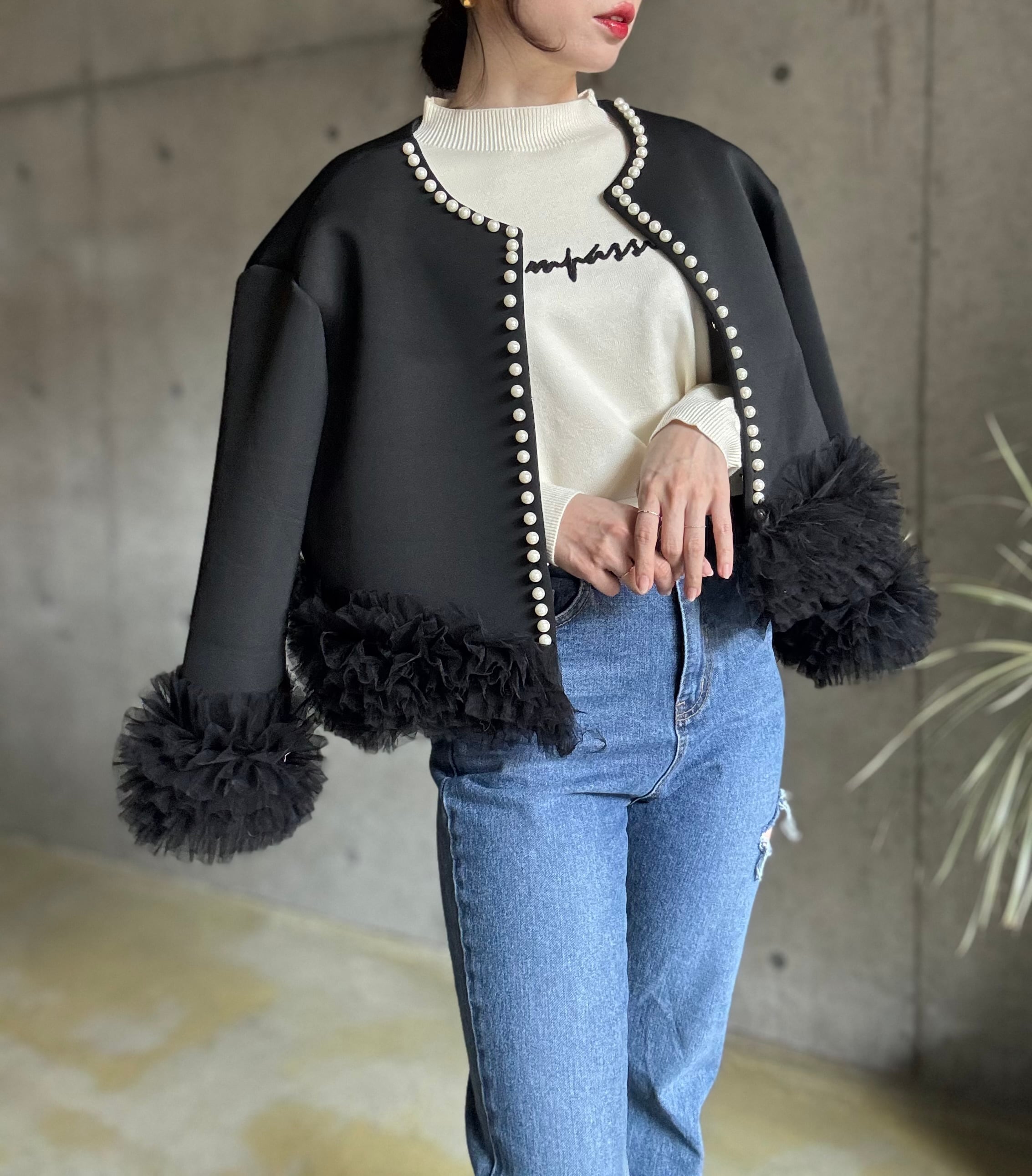 ボリュームたっぷりのチュールフリルとパールが目を惹くボディングジャケット✨