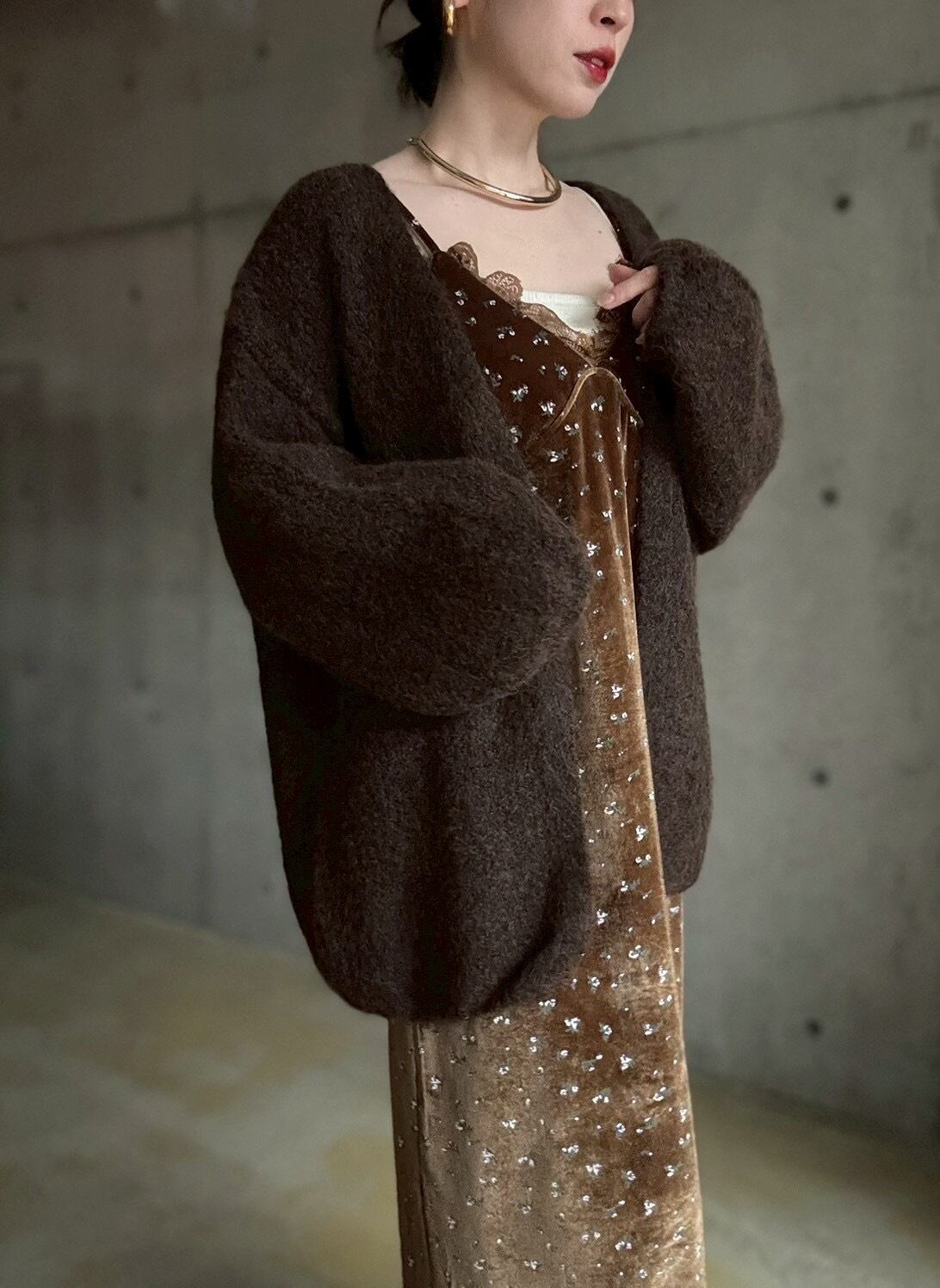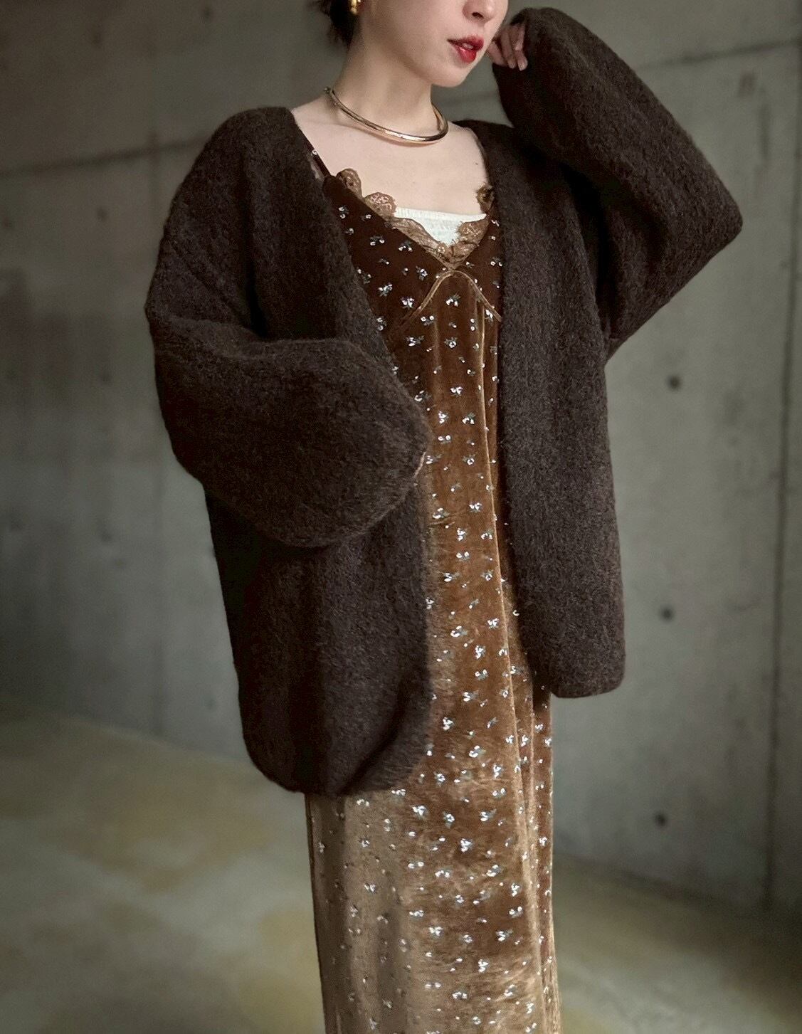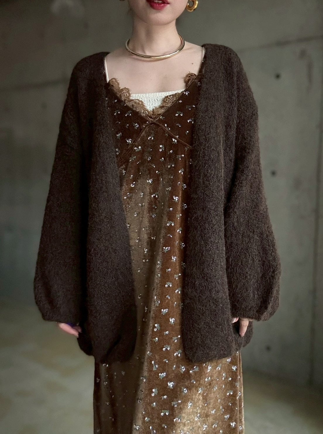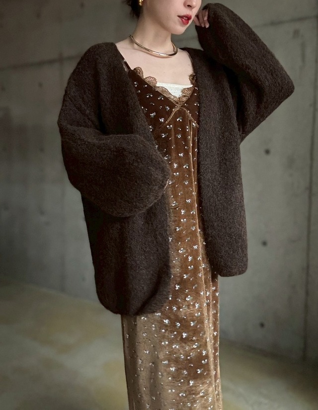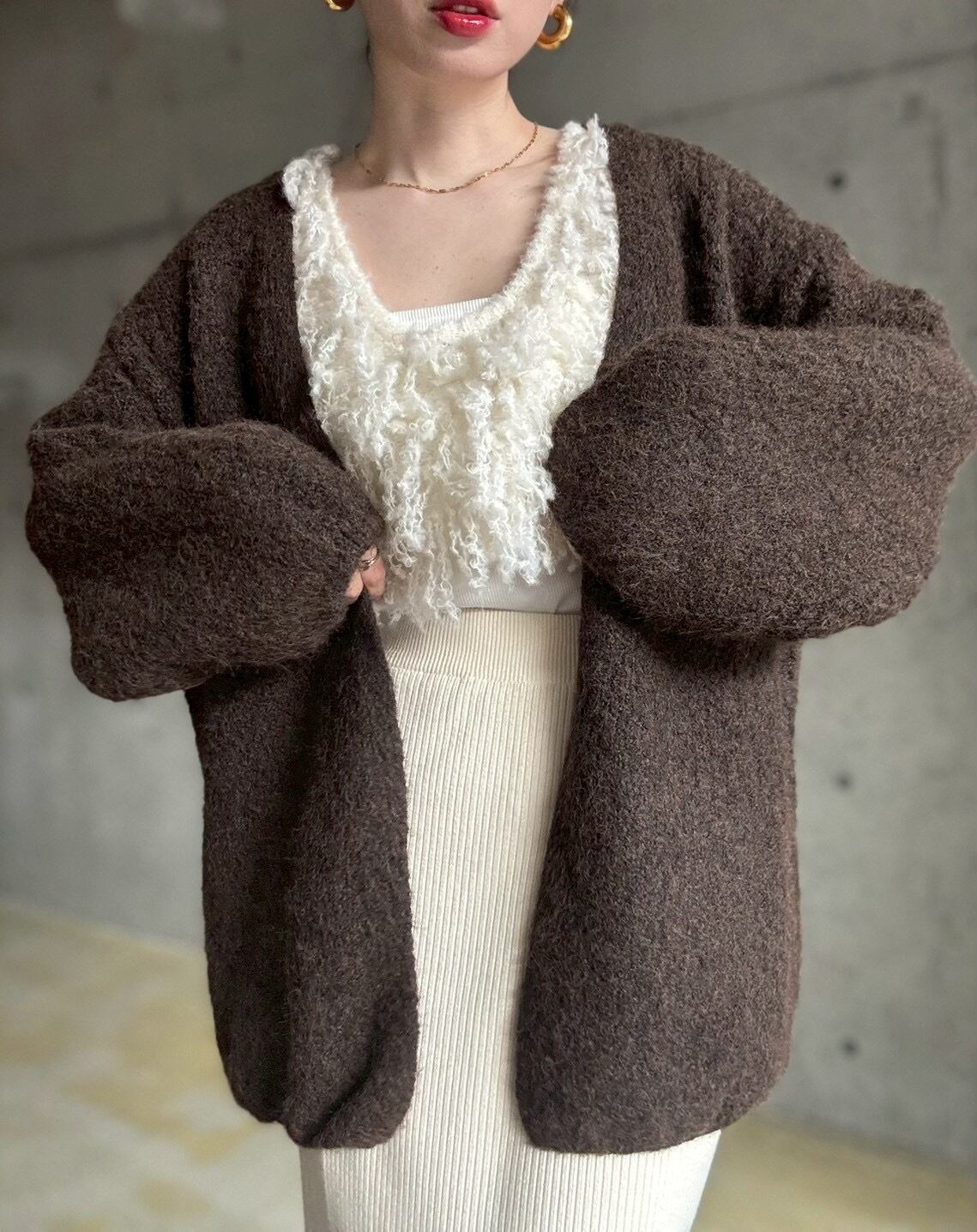 【12/24 21:00〜】袖ボリュームオープンニットカーディガン【ブラウン】