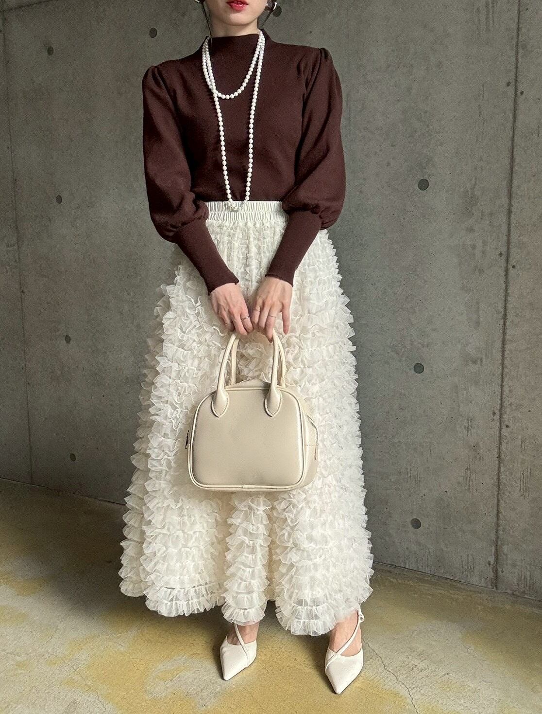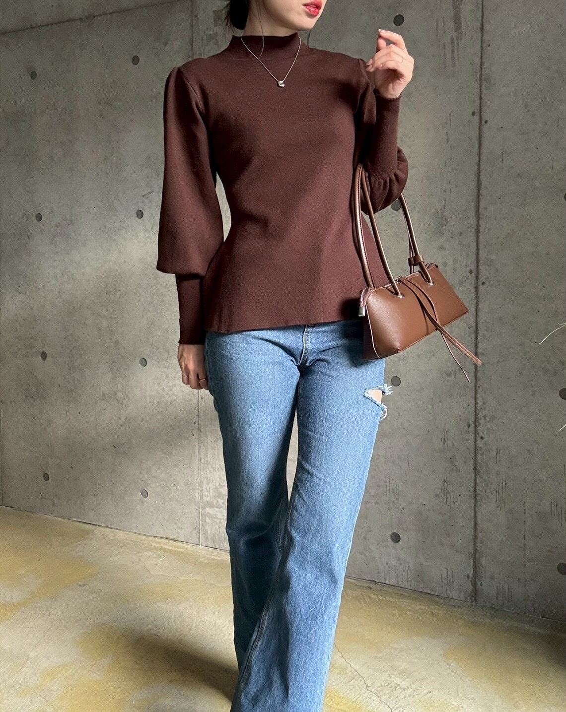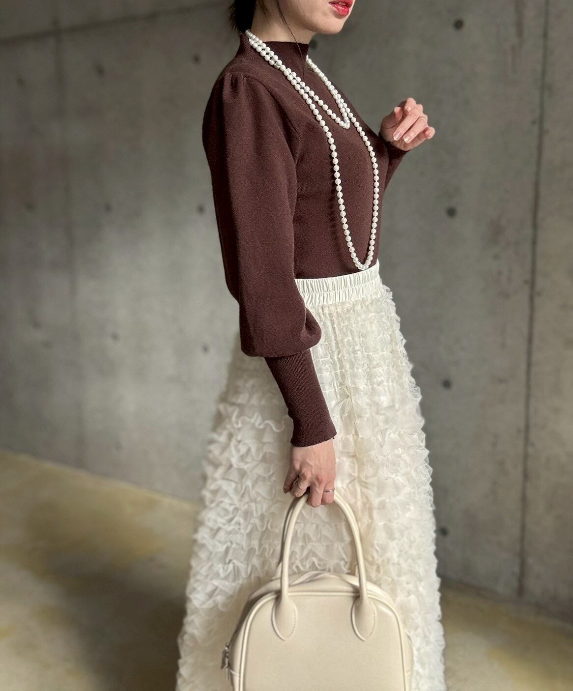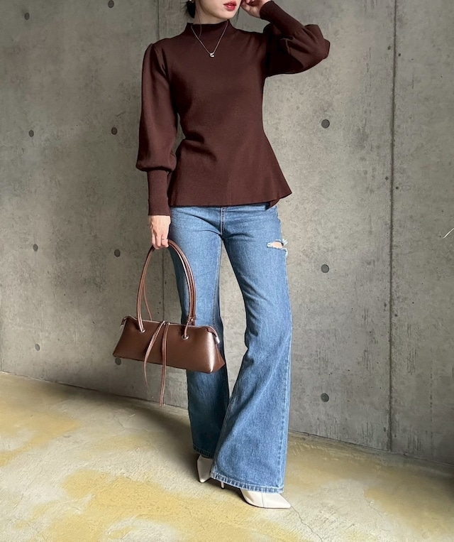 【12/24 21:00〜】Aラインパフショルダーハイネックニットtops【ブラウン】