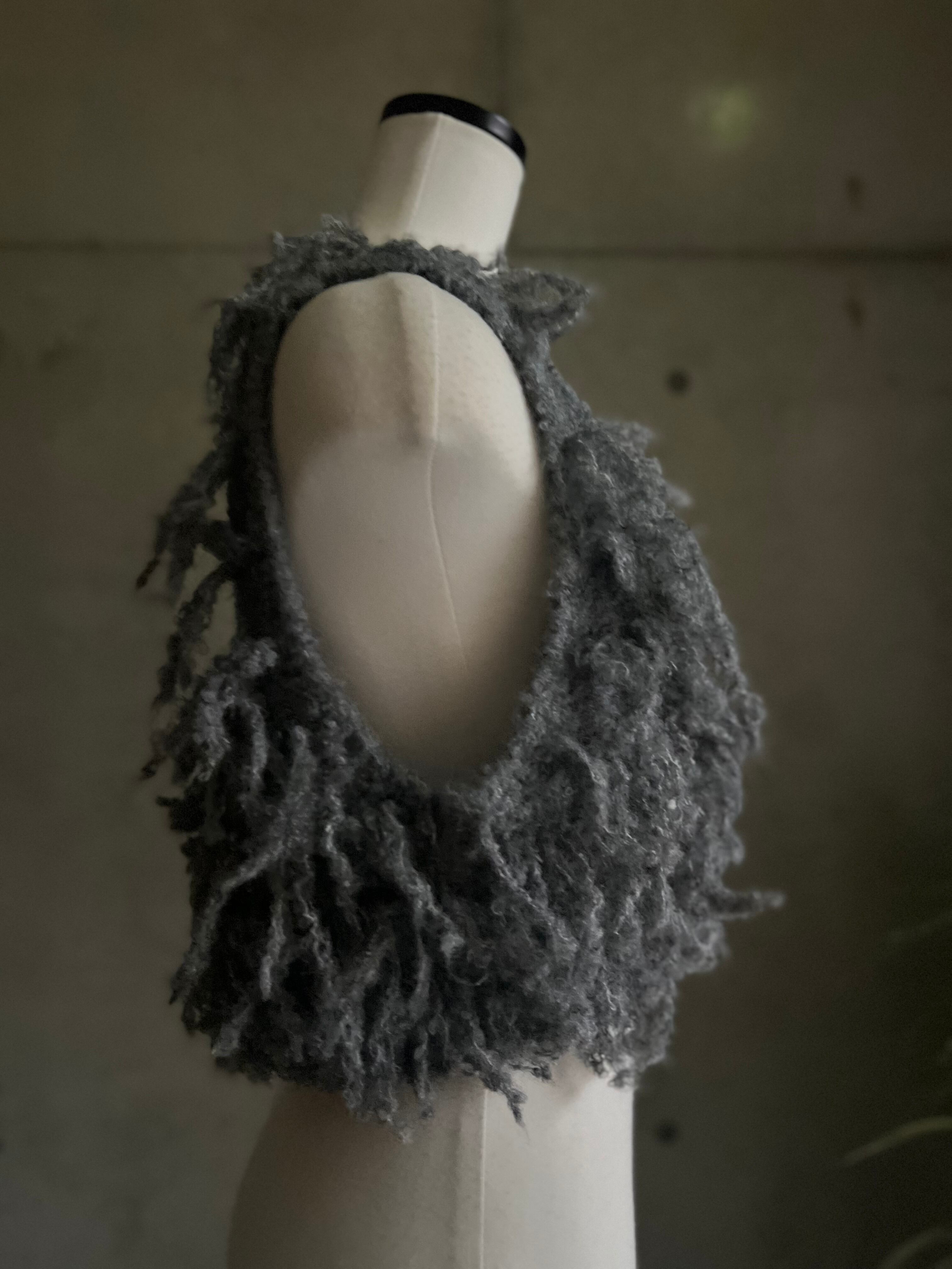 凹凸感のあるブークレニット生地をフリンジデザインにアレンジした存在感バツグンなビスチェ♪