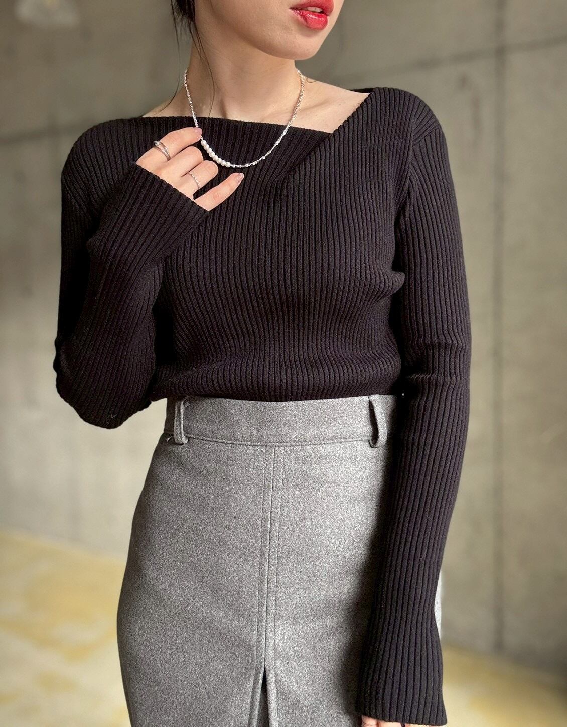 変形のネックラインで、シンプルに着るだけでおしゃれ見え♪首元はあき過ぎずスッキリと、上品な印象を与えてくれます✨