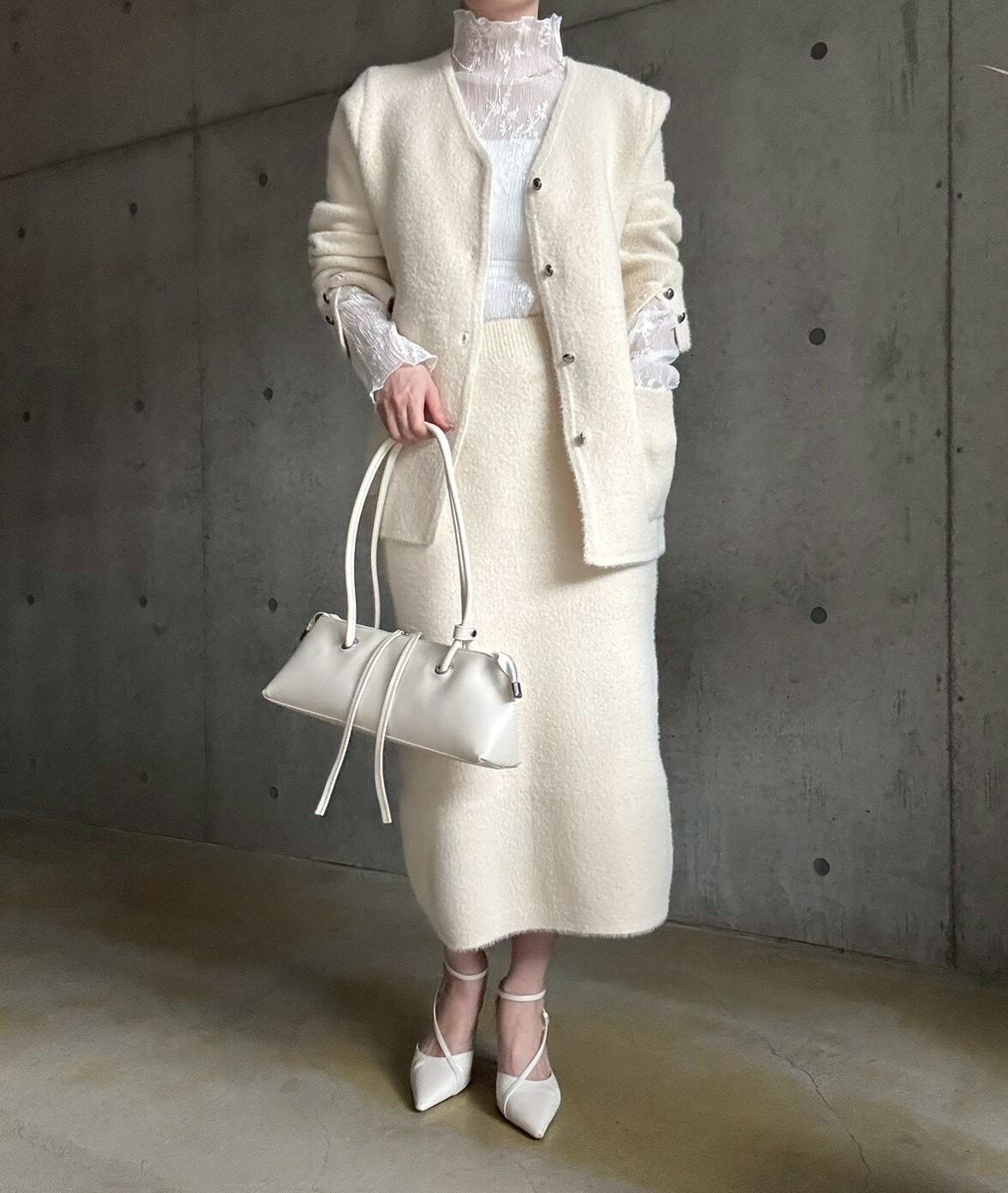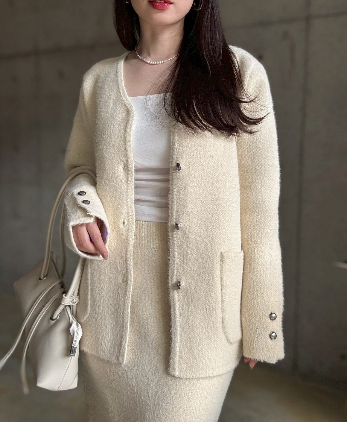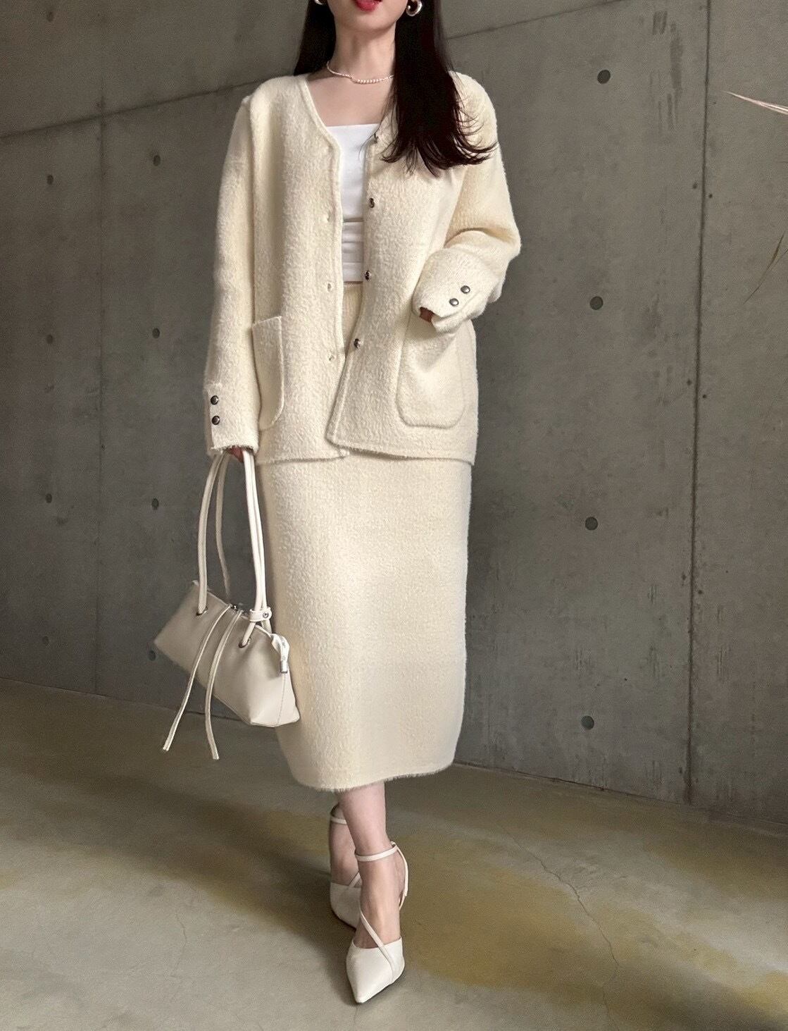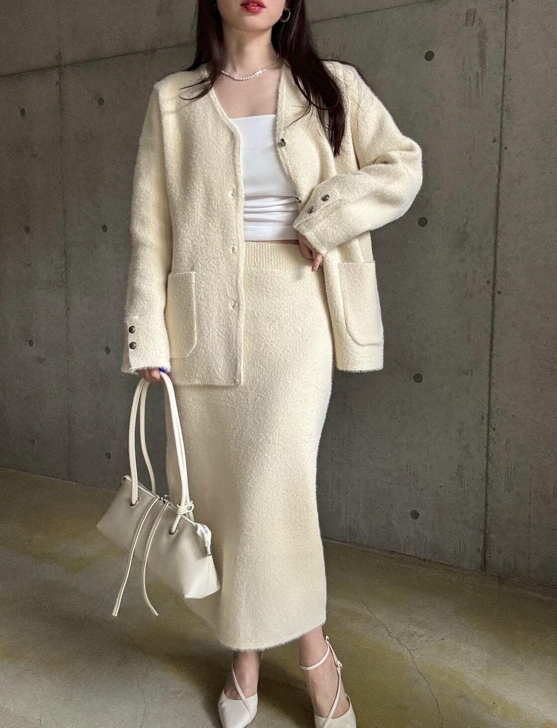 【即納】高密度シャギーニットジャケット+スカートset【アイボリー】