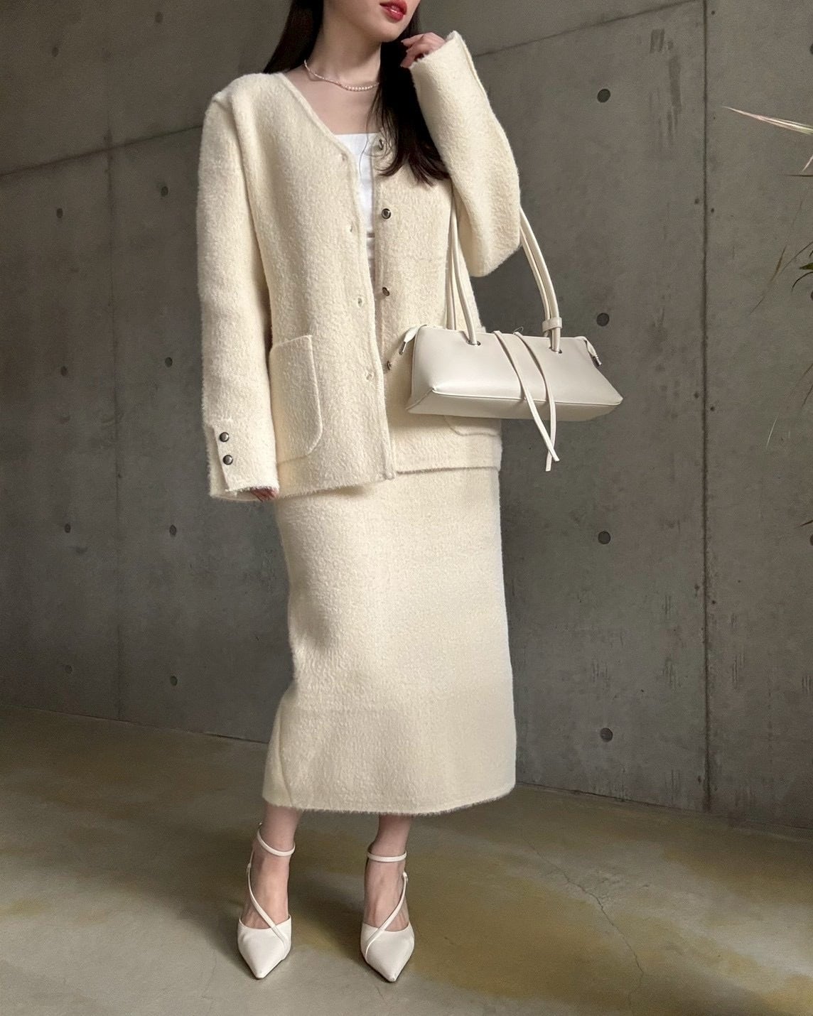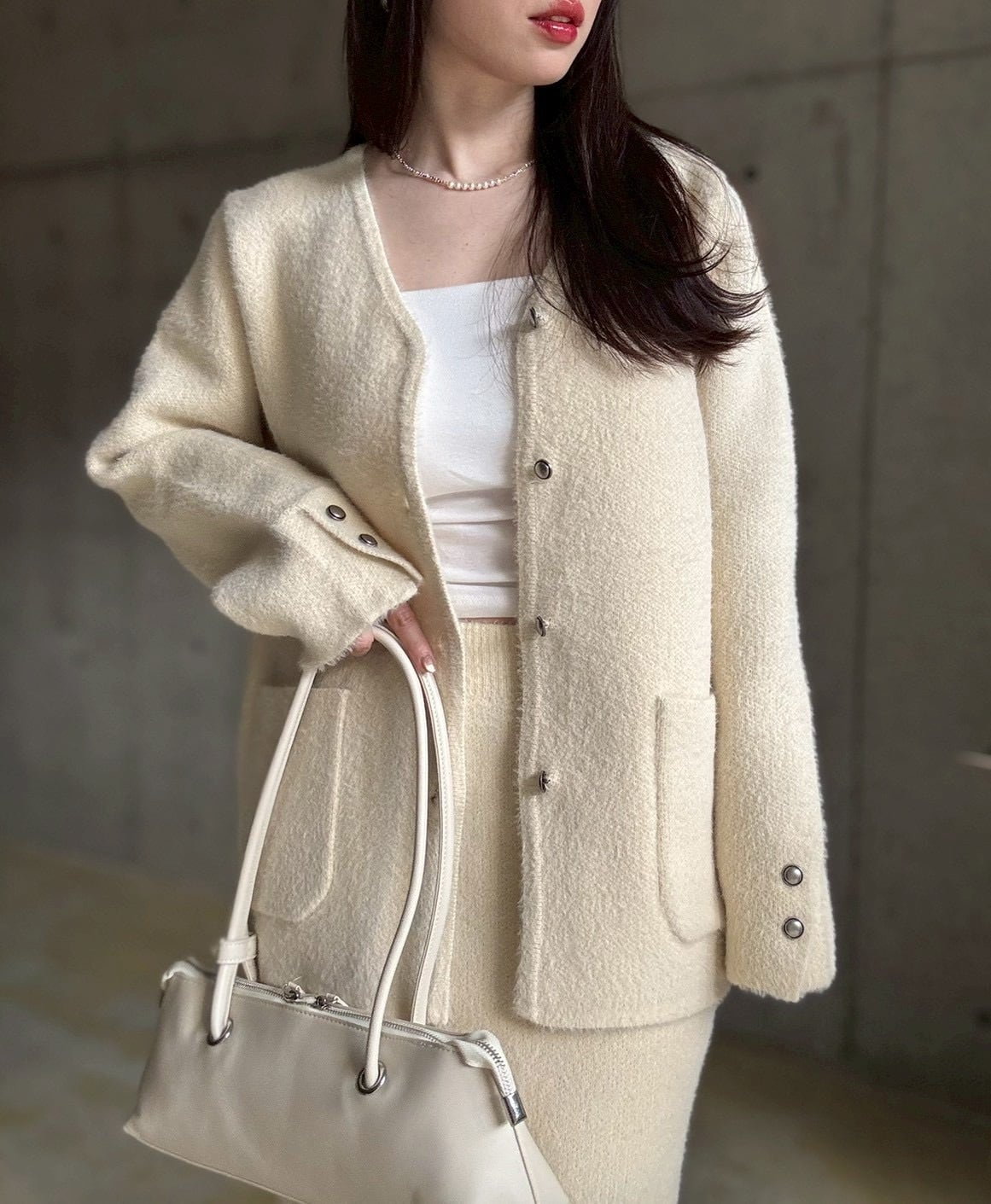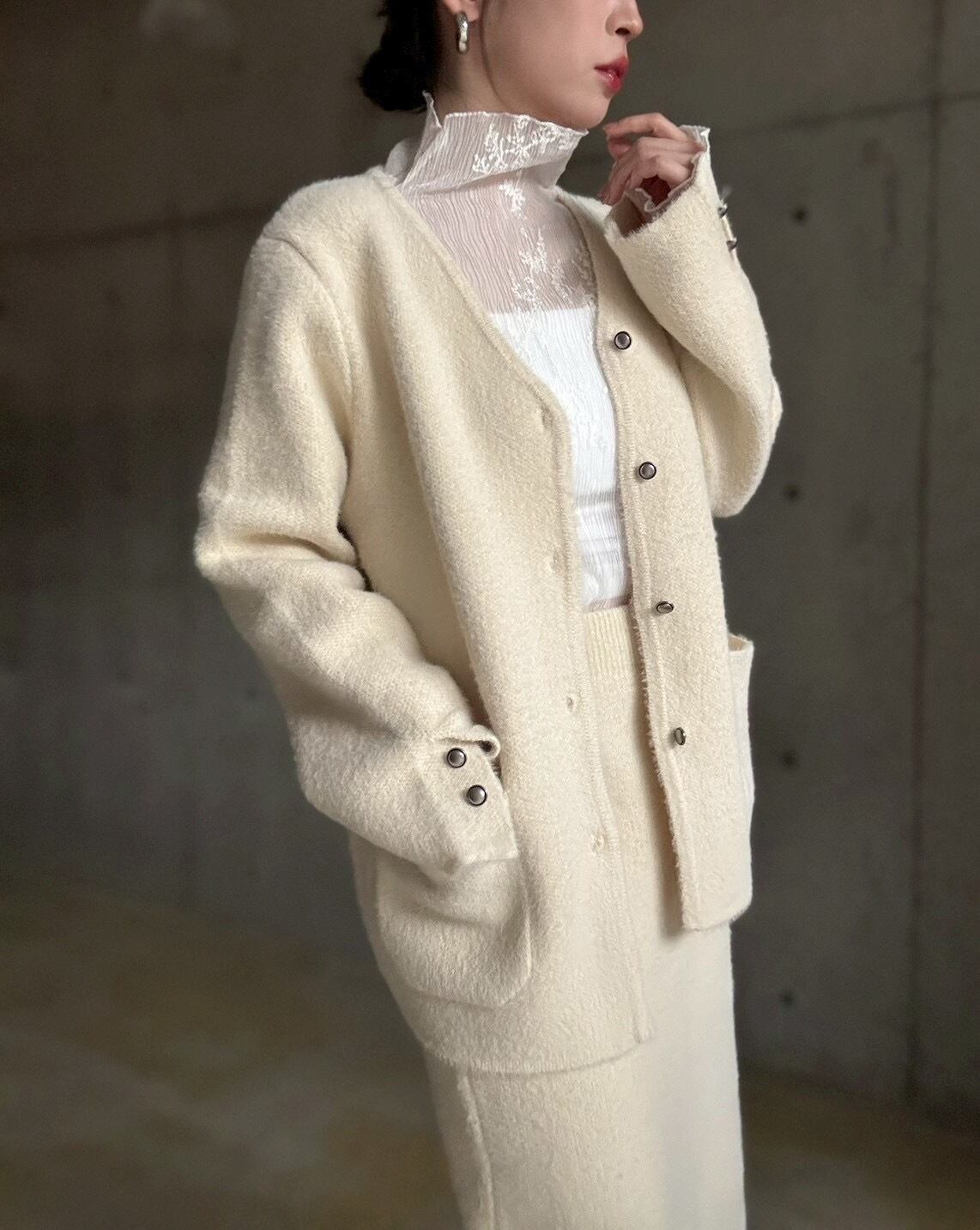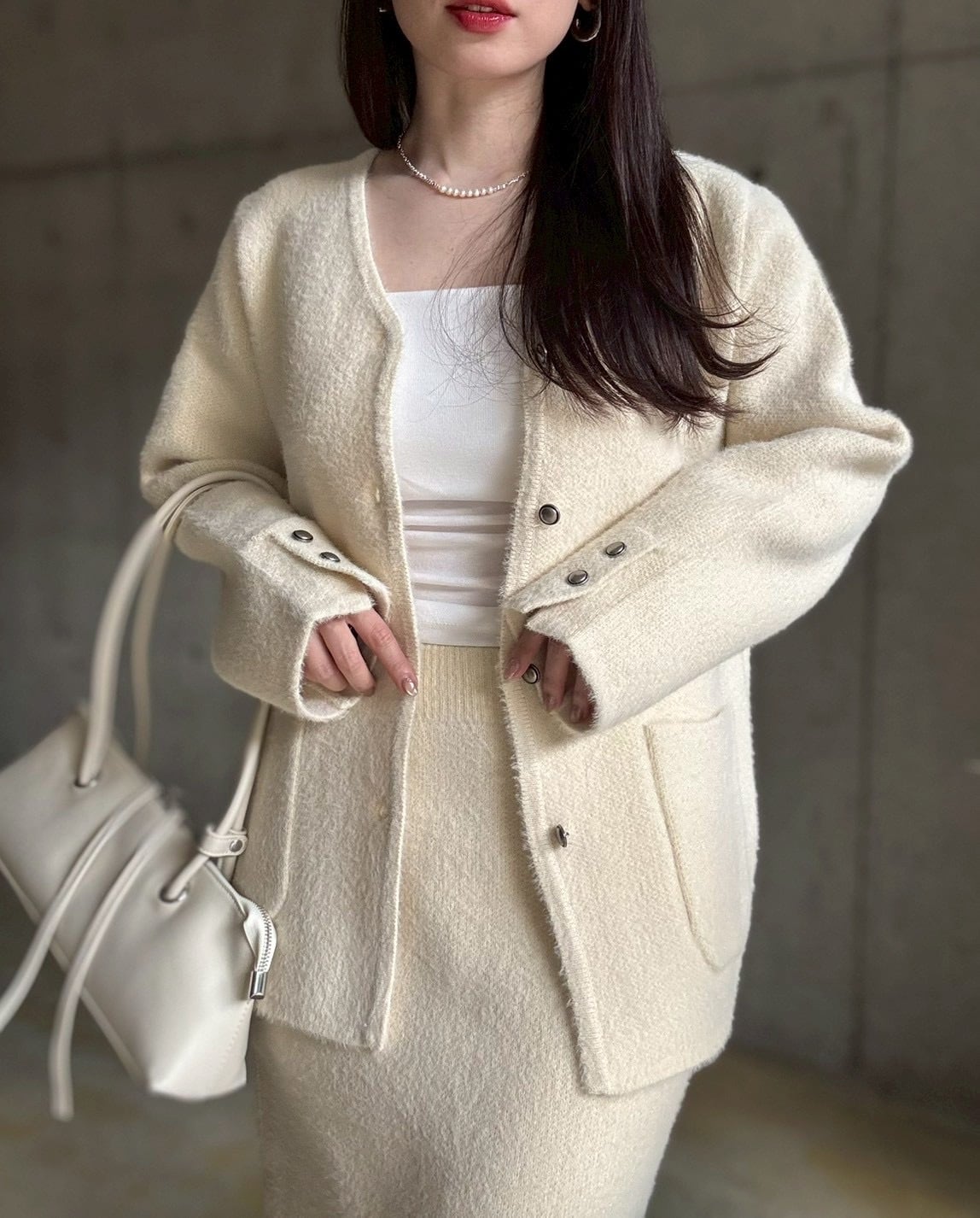 【即納】高密度シャギーニットジャケット+スカートset【アイボリー】