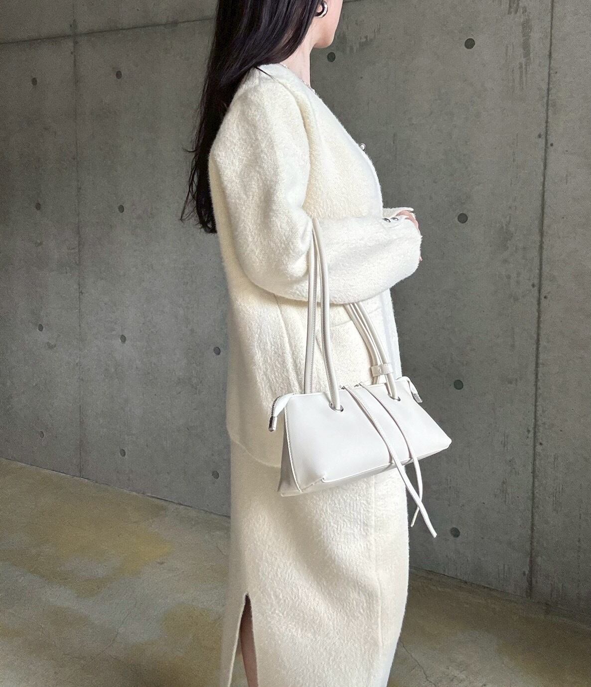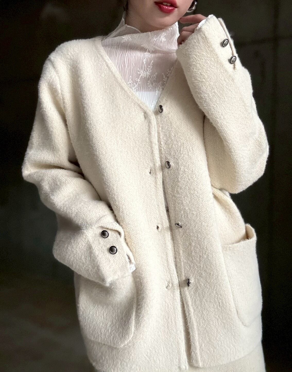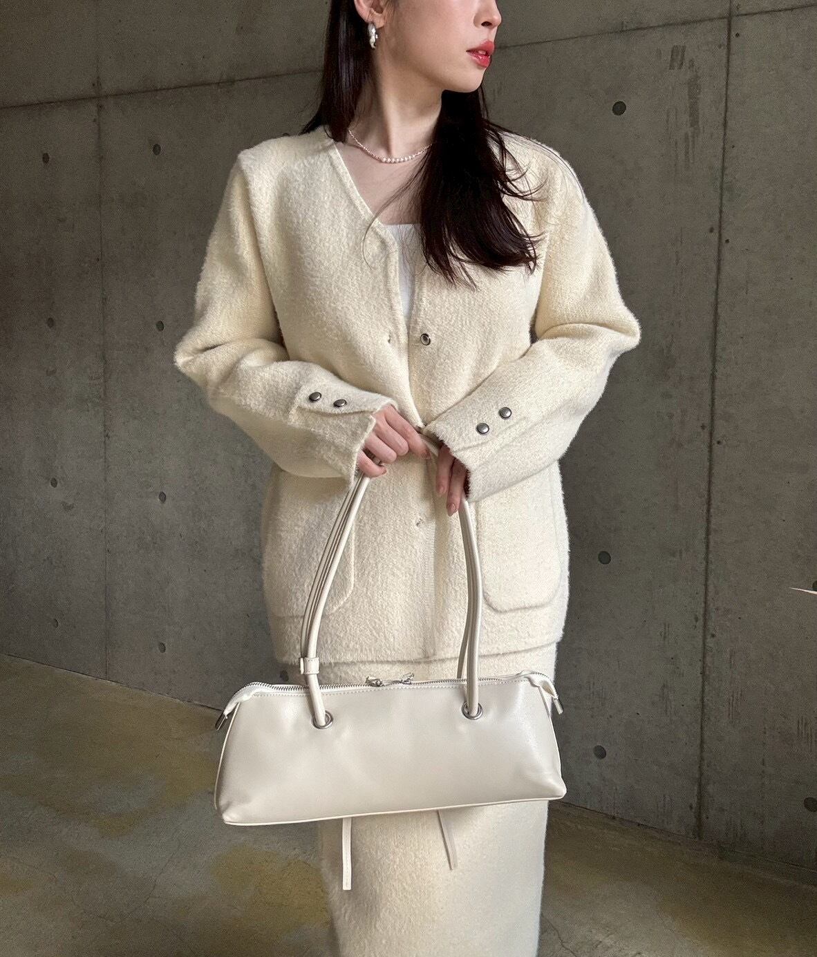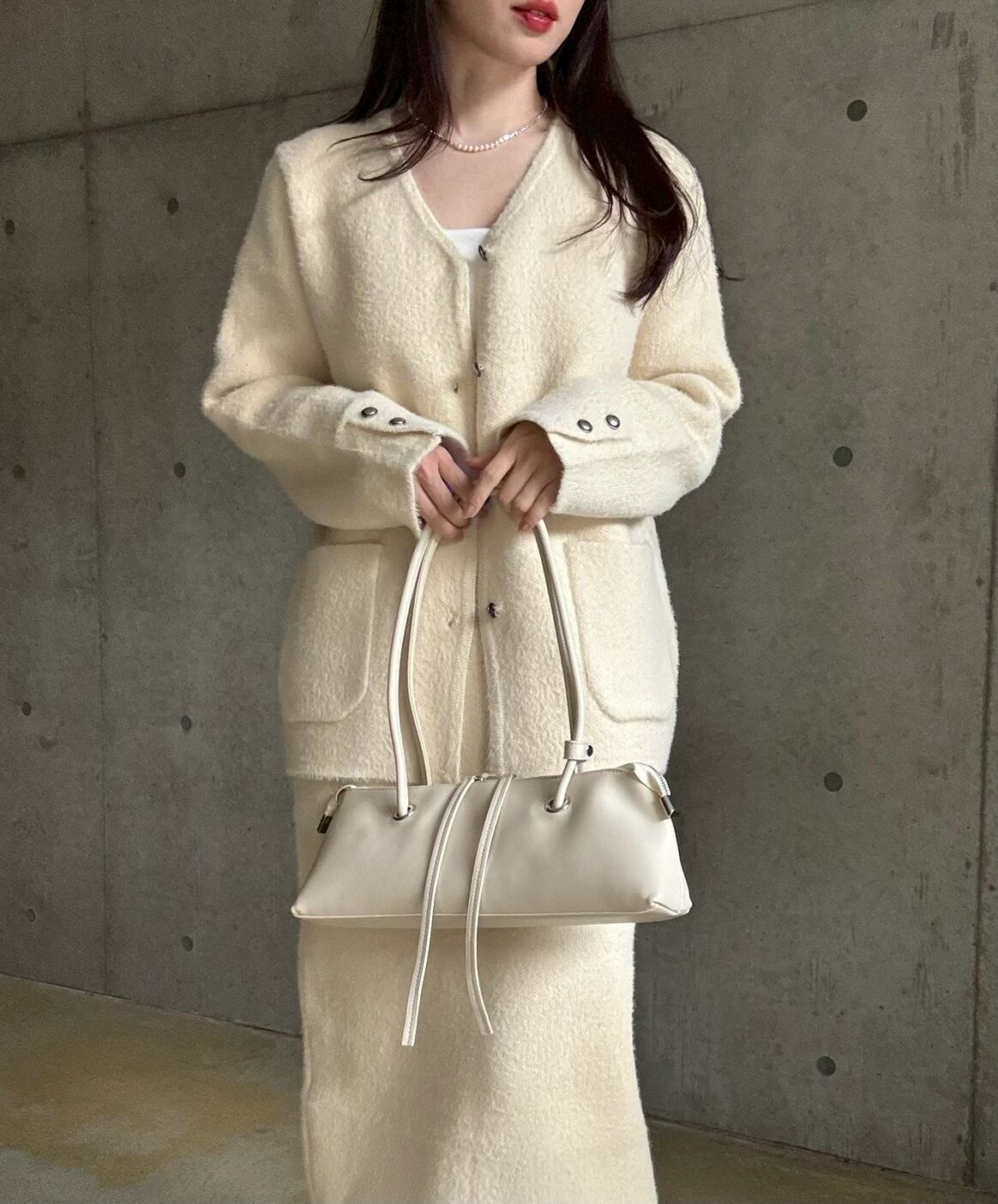 【即納】高密度シャギーニットジャケット+スカートset【アイボリー】
