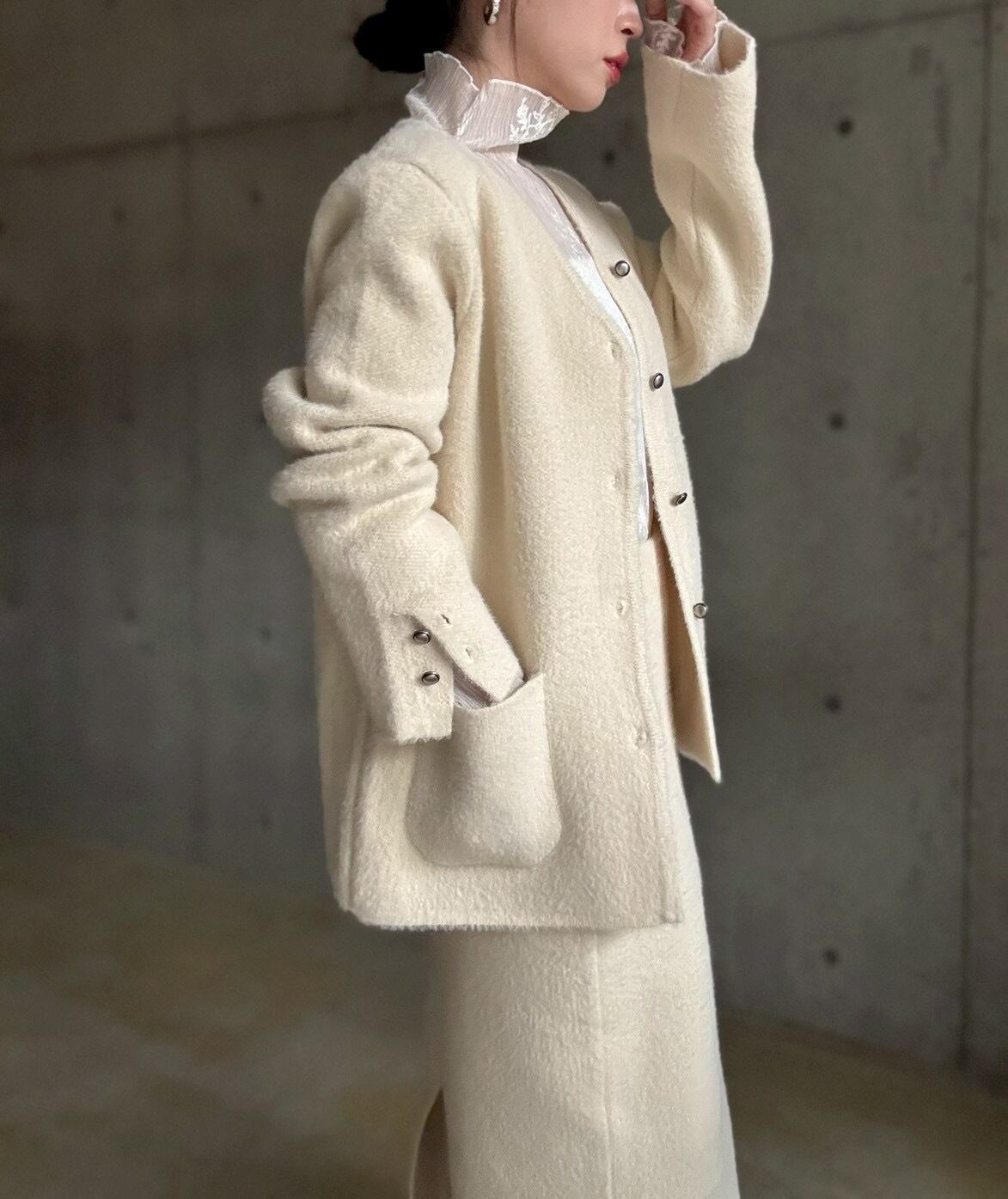 Vネックのノーカラーデザインなのでインナー合わせもしやすく、ハイネックアイテムなどと合わせてもスッキリと着用して頂けます♪