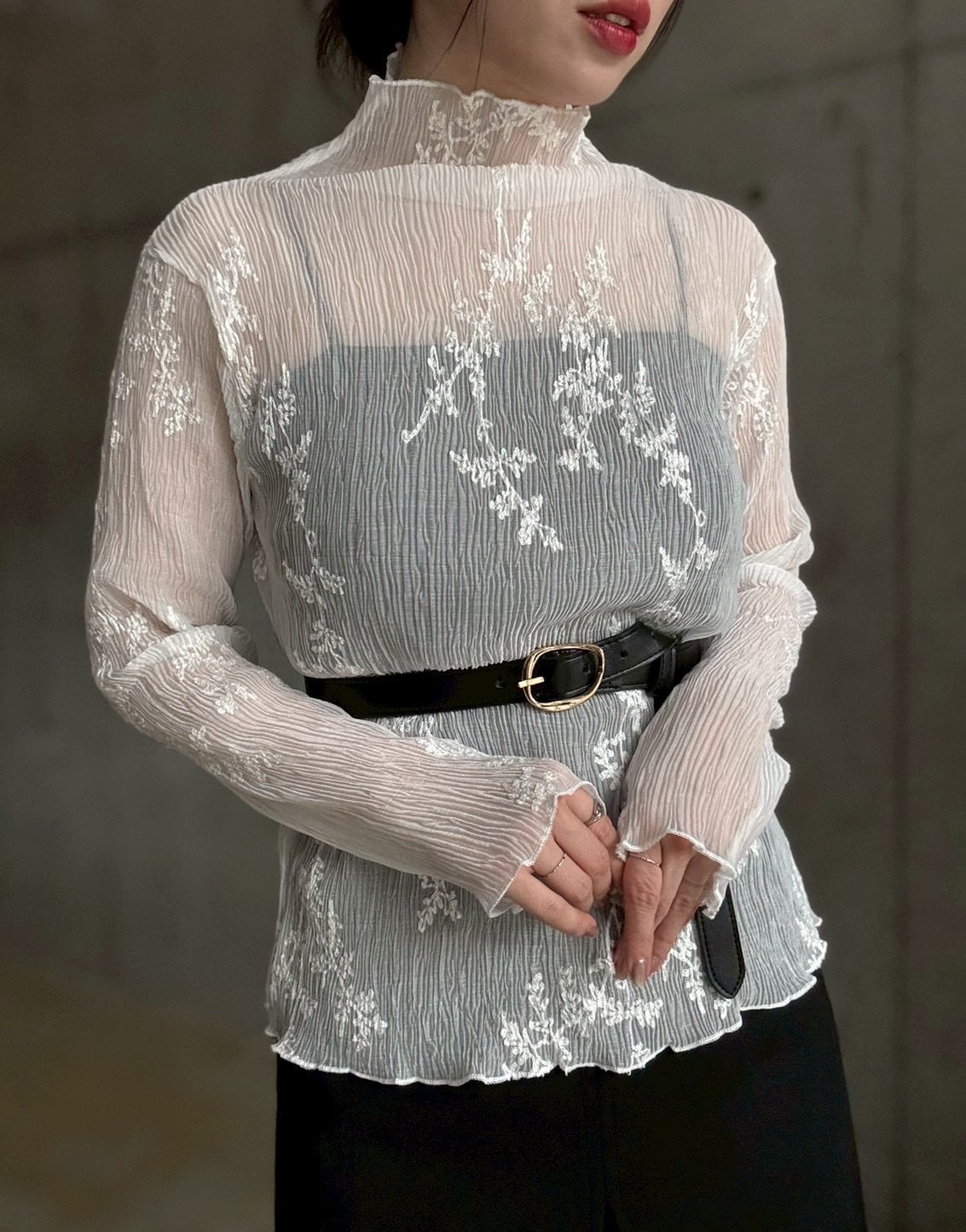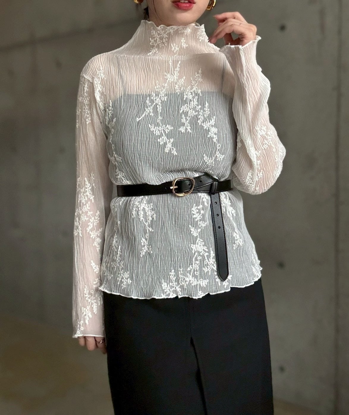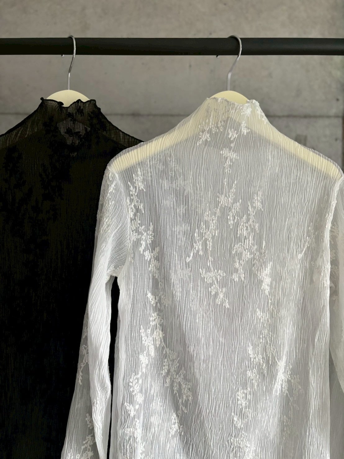 【即納】刺繍デザインプリーツ加工シアーtops【ホワイト】