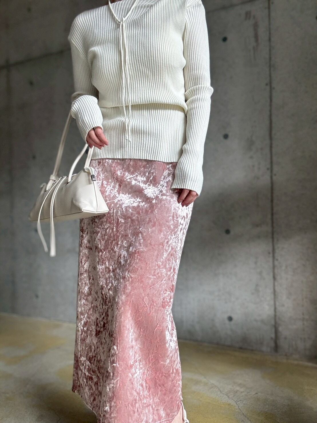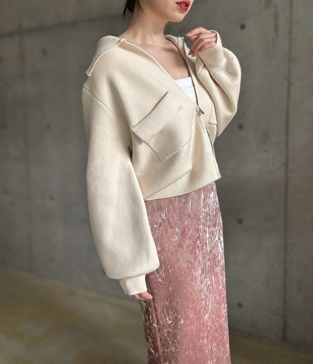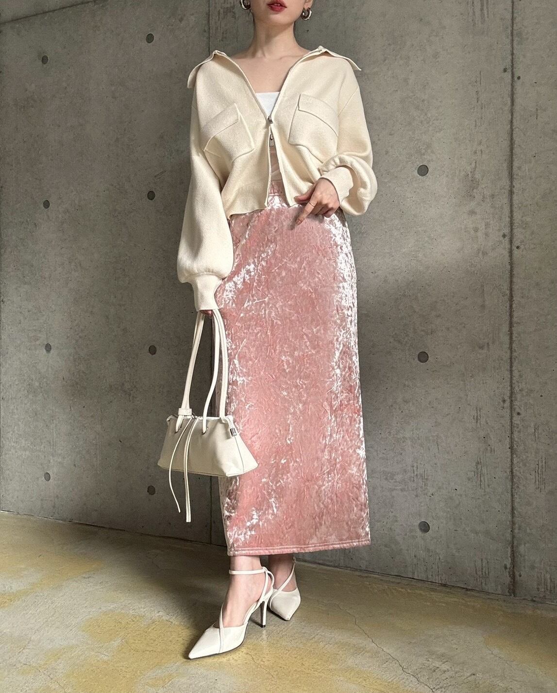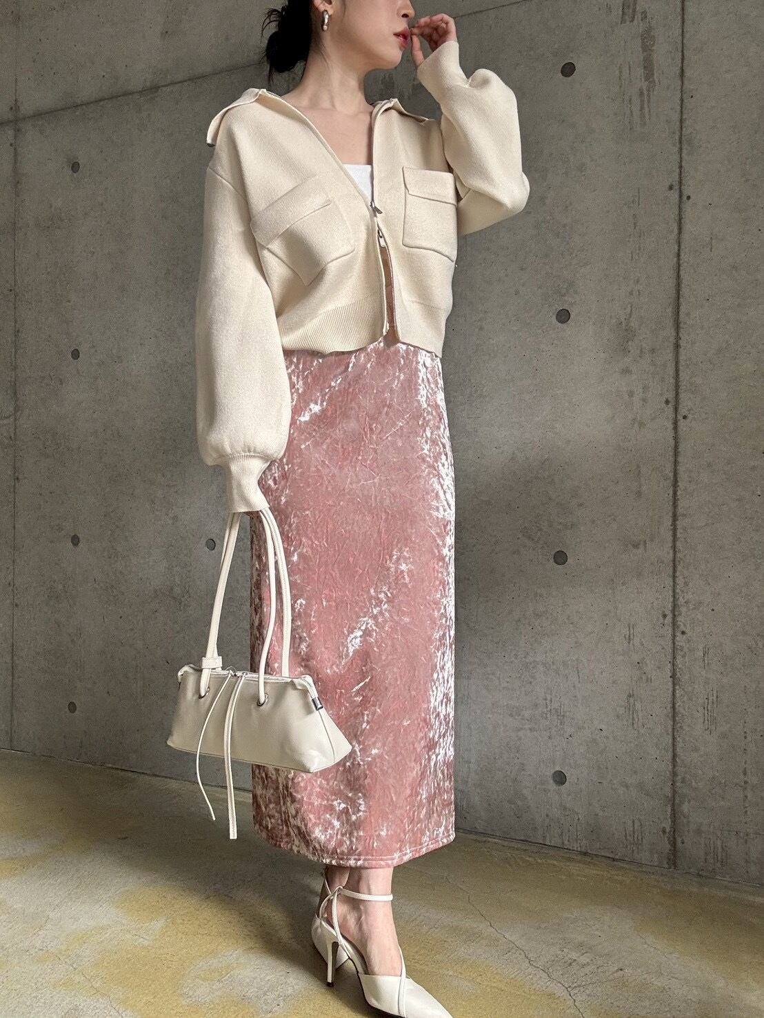 クラッシュベロアの生地感がスタイリングのアクセントに♪