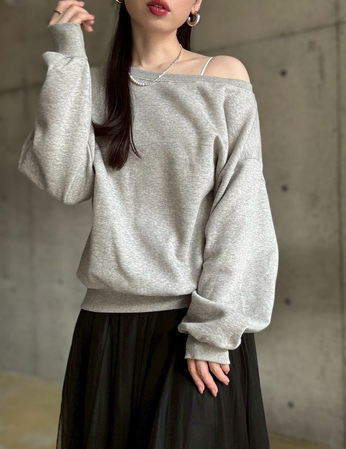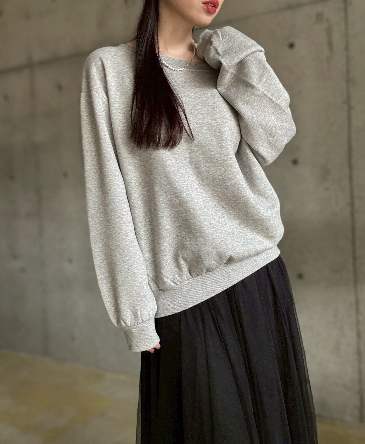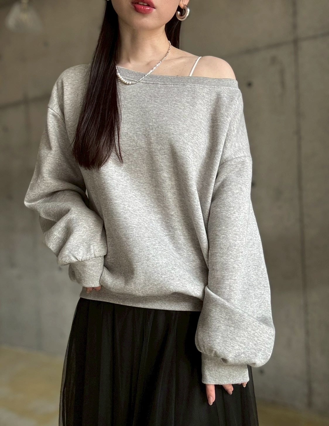 【即納】 裏微起毛ゆったりオフショルスウェットプルオーバー【グレー】