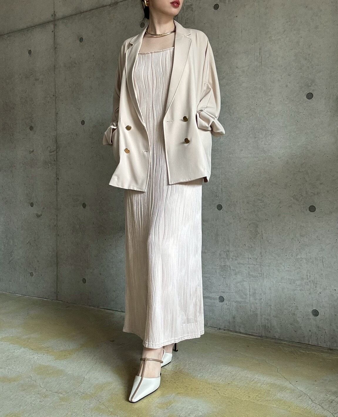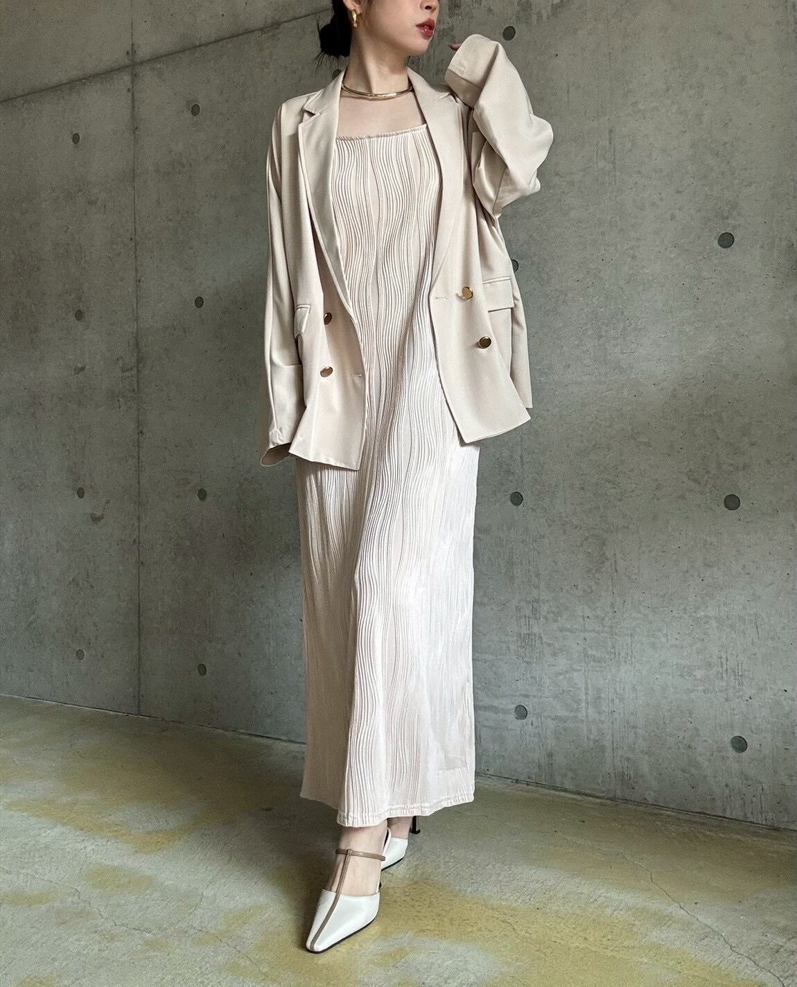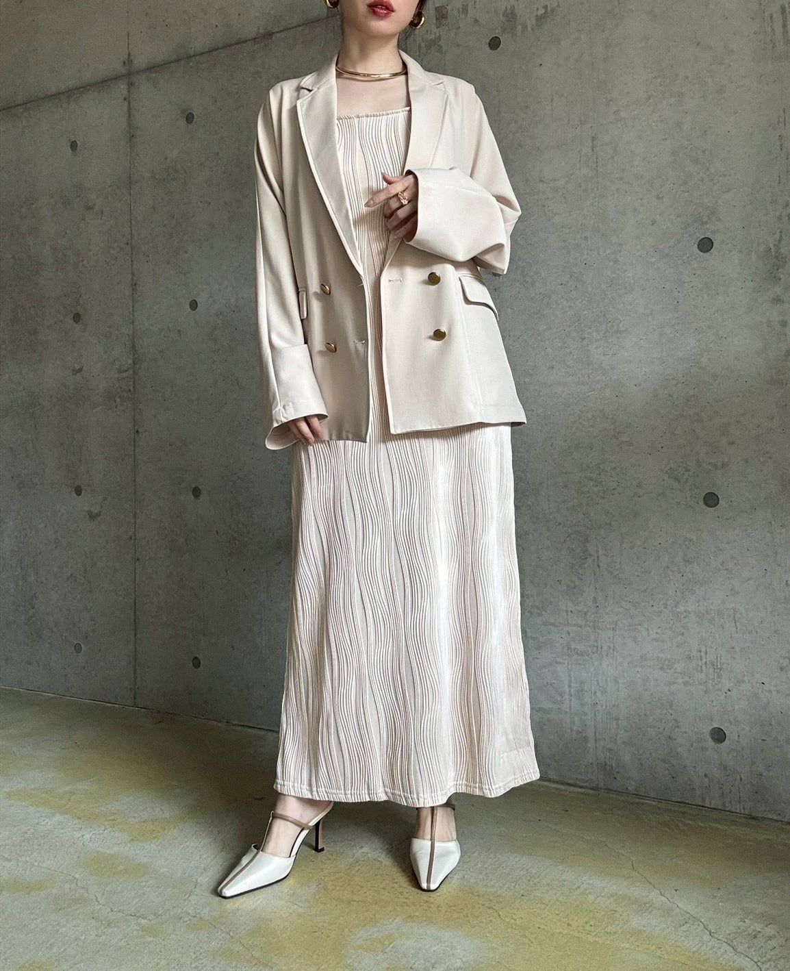 上品な落ち感とマットなゴールドボタンがポイントのジャケット&ジャガードウェーブ柄が高級感たっぷりなキャミワンピースをセットに♪