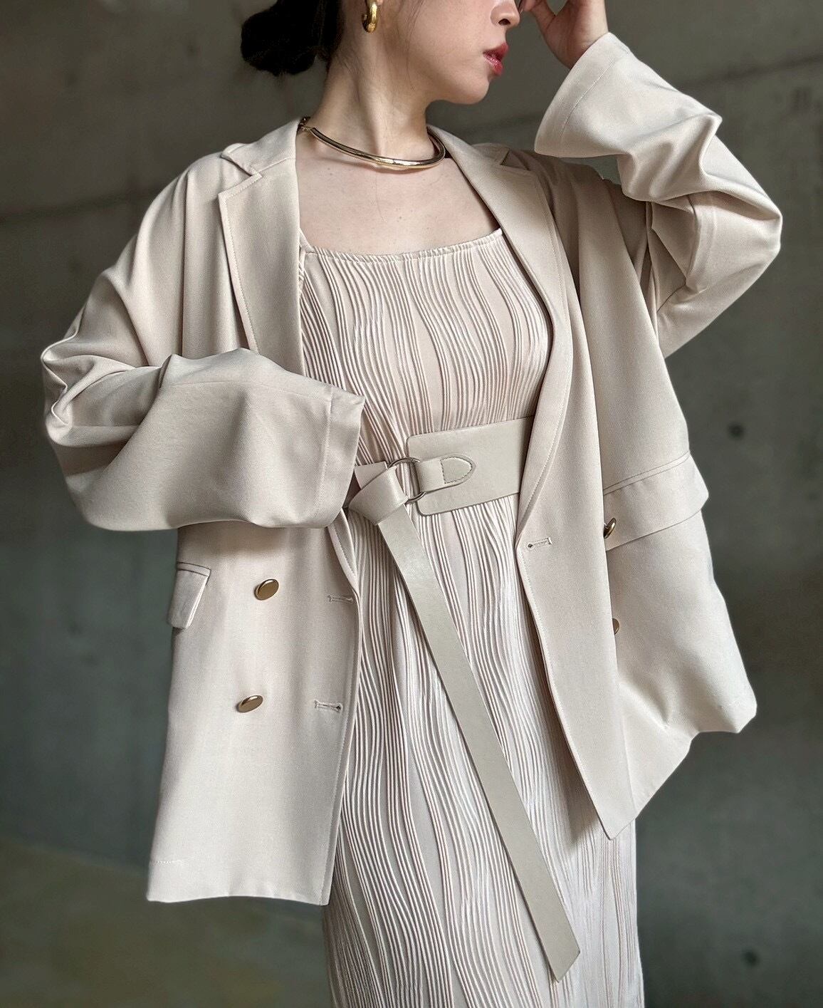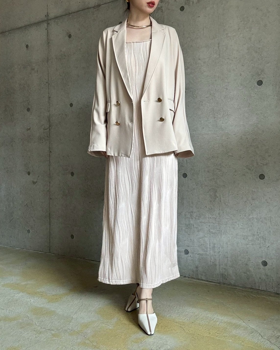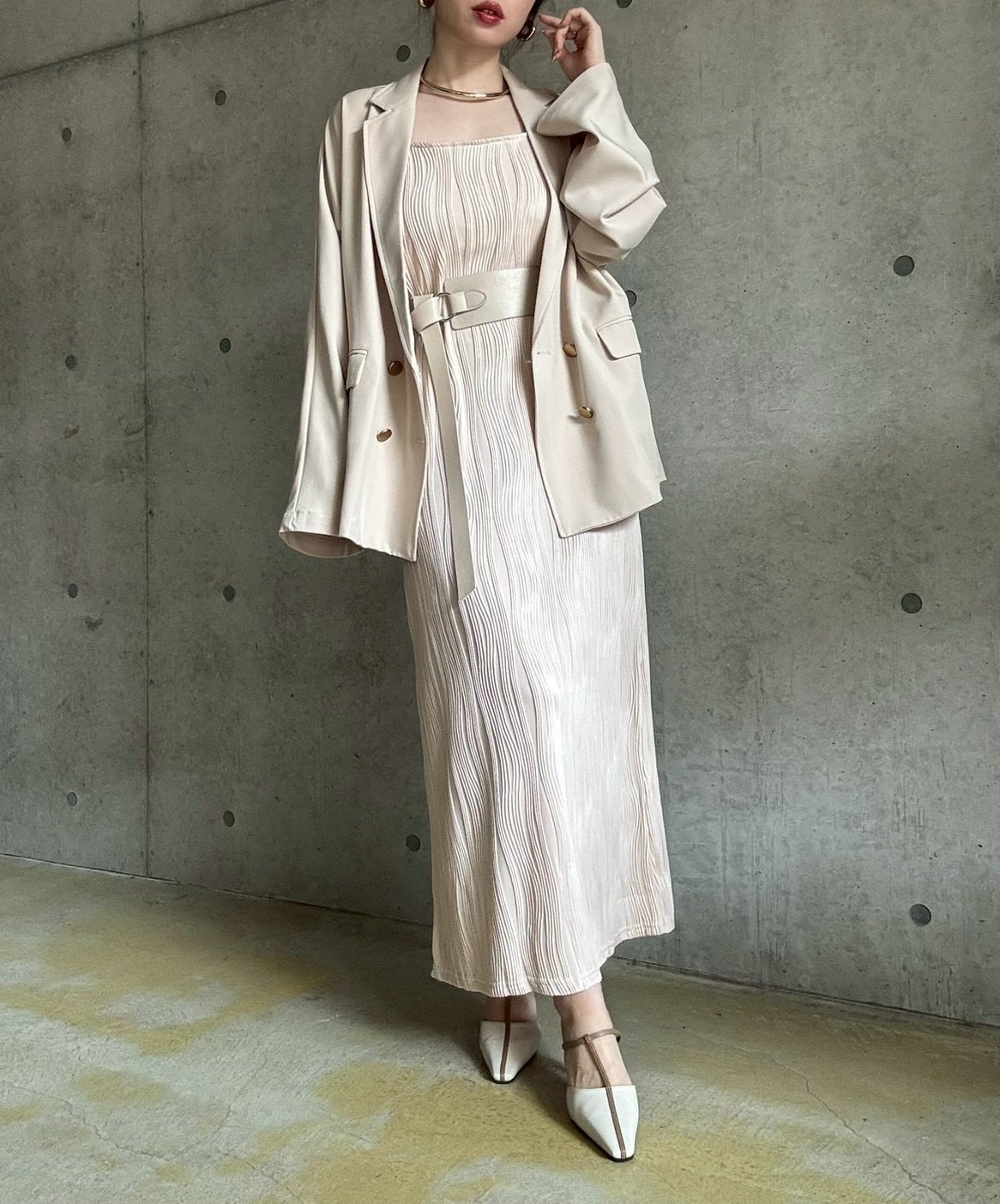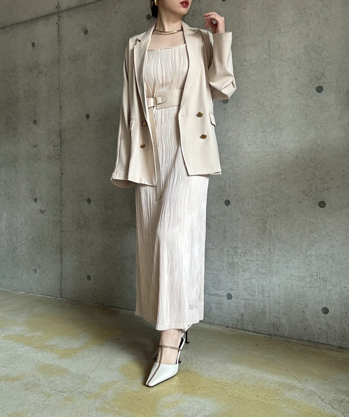 上品な落ち感とマットなゴールドボタンがポイントのジャケット&ジャガードウェーブ柄が高級感たっぷりなキャミワンピースをセットに♪
