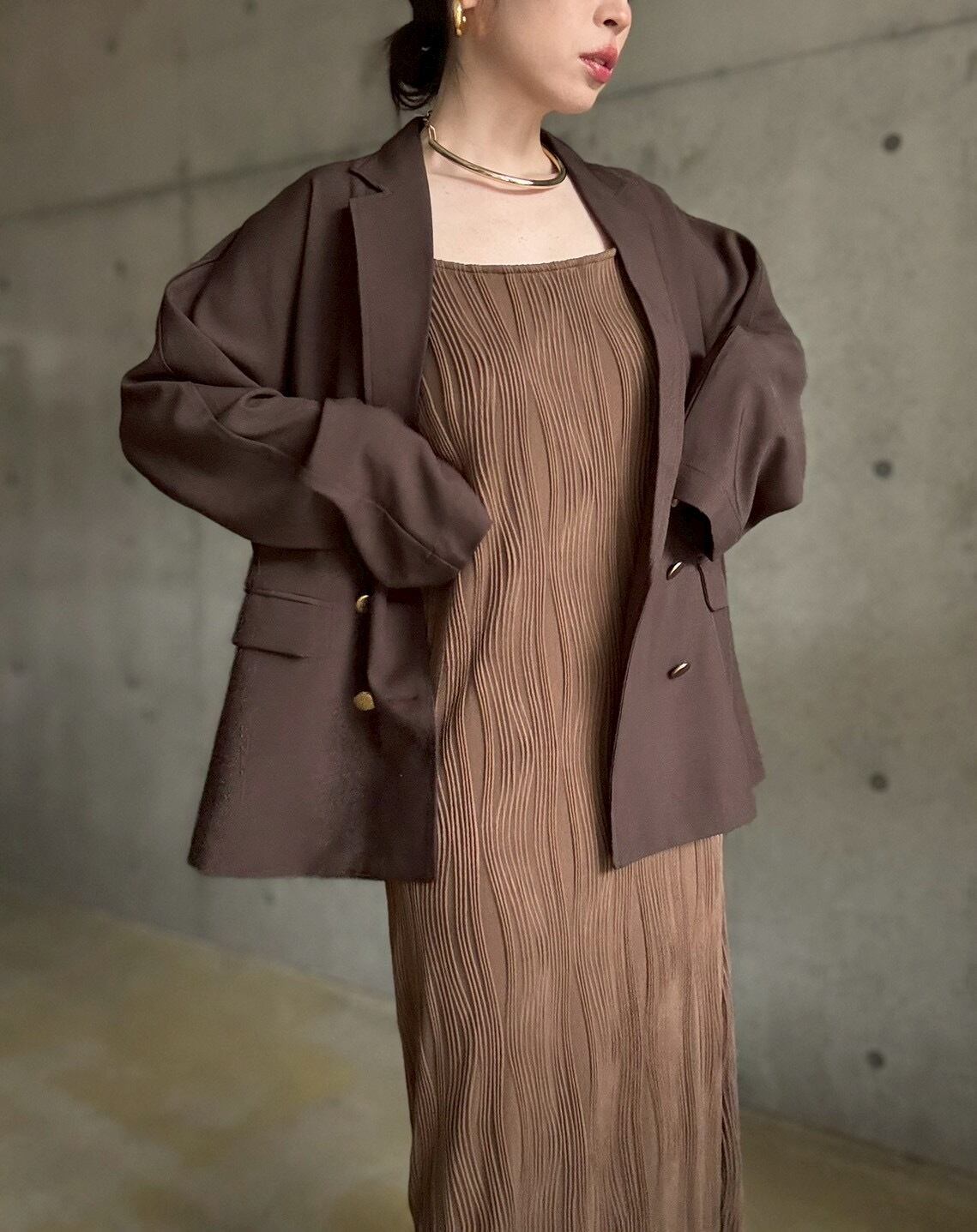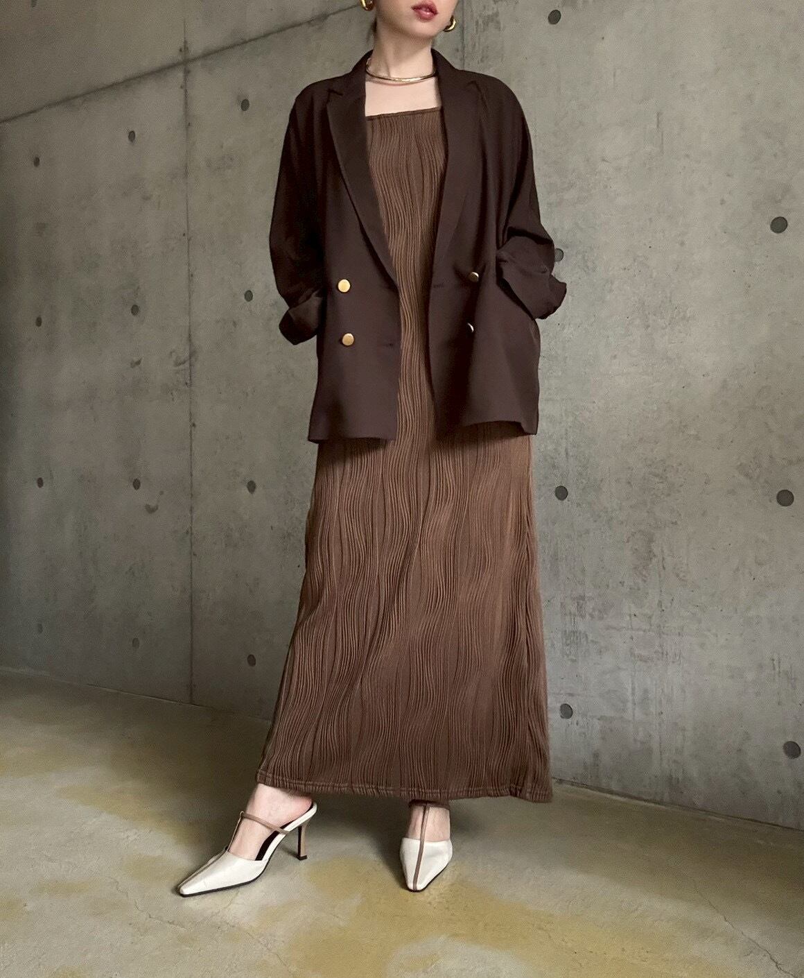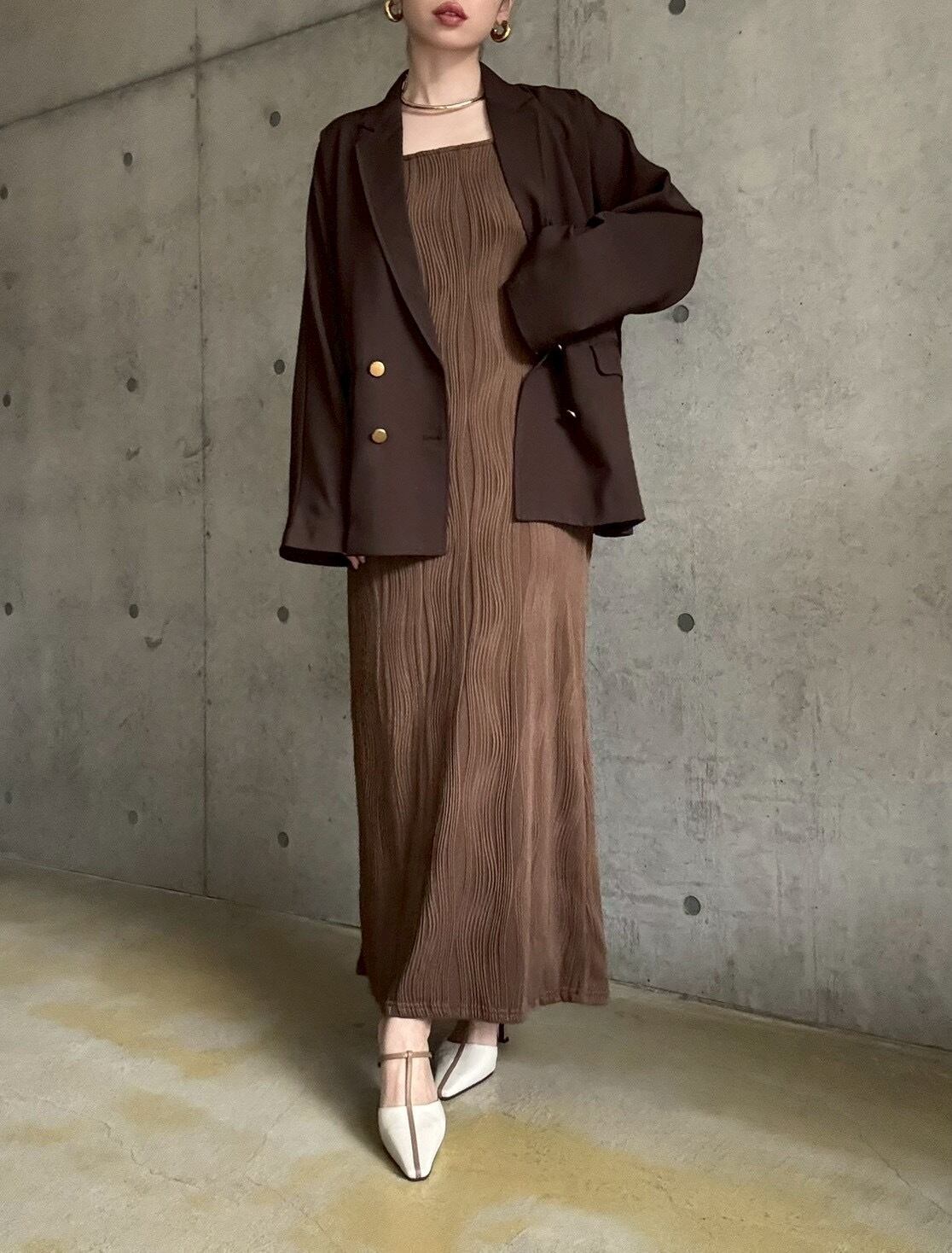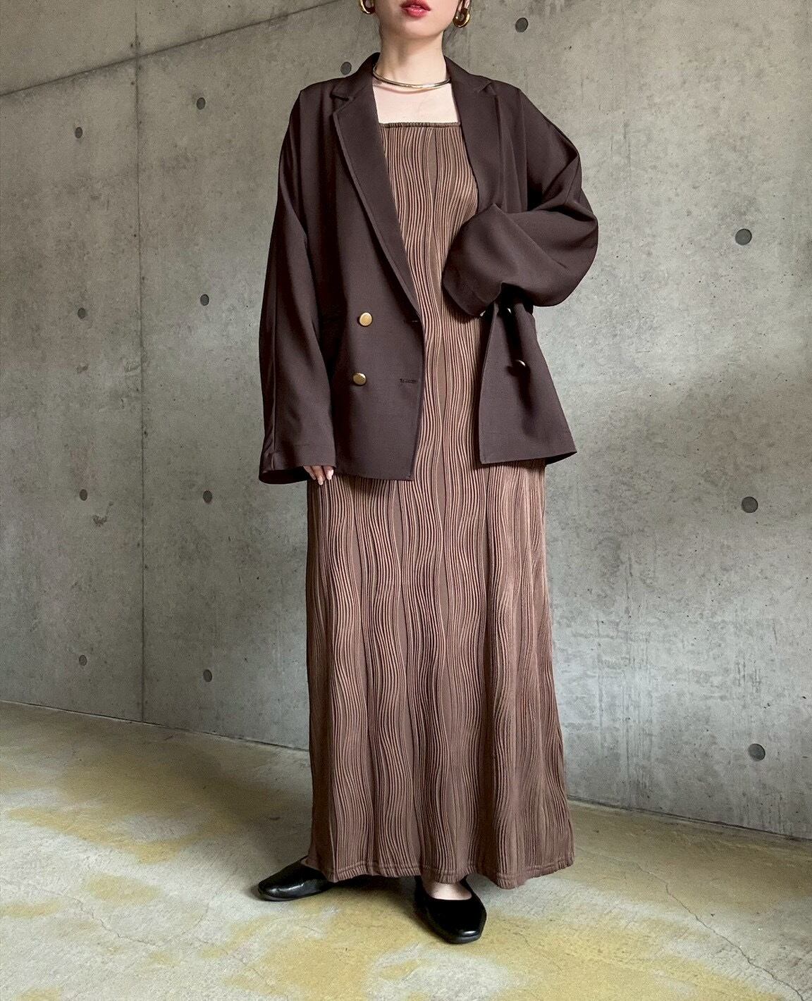 上品な落ち感とマットなゴールドボタンがポイントのジャケット&ジャガードウェーブ柄が高級感たっぷりなキャミワンピースをセットに♪