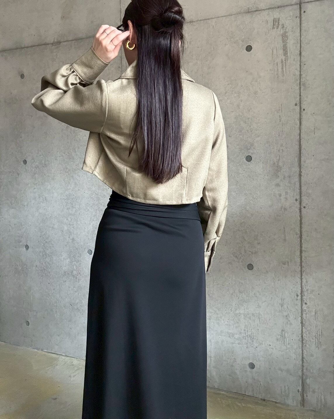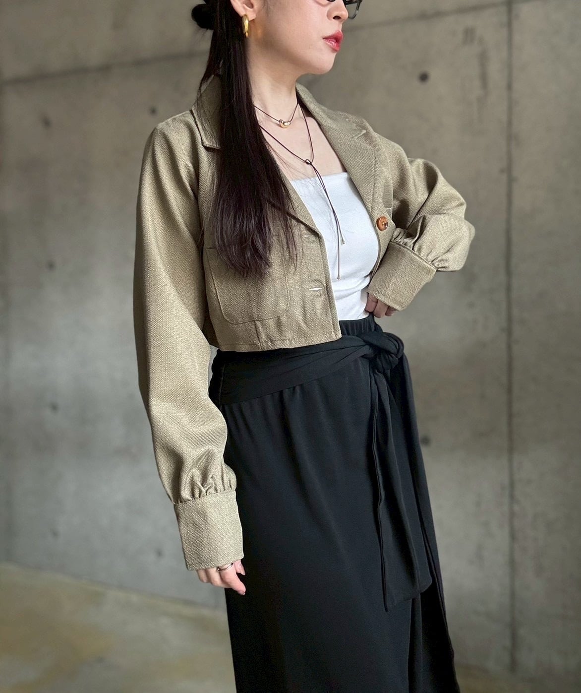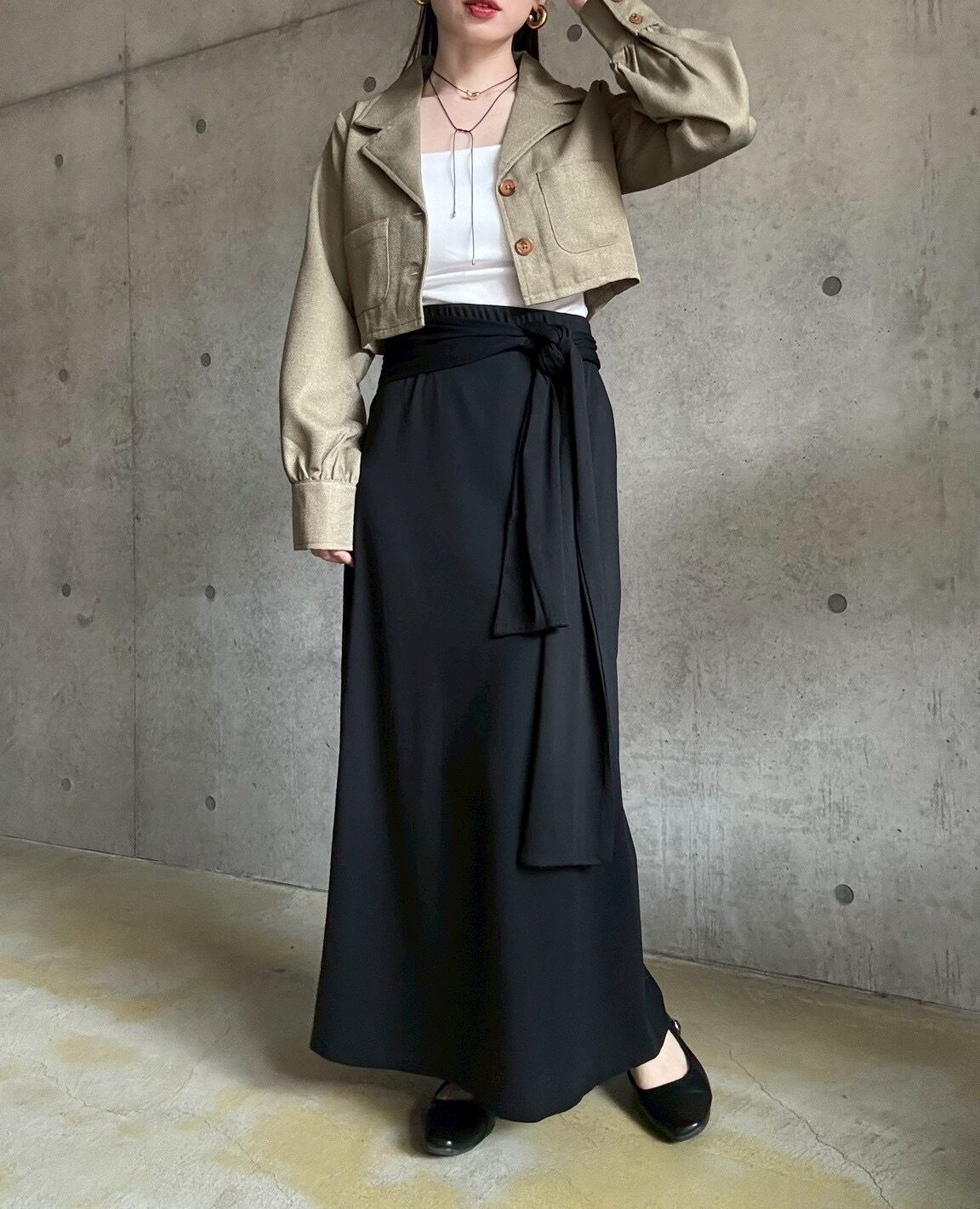 ショート丈なのでボリューム感のあるボトムともバランスが良く、ハイウエストボトムスを合わせれば脚長効果バツグン!✨
