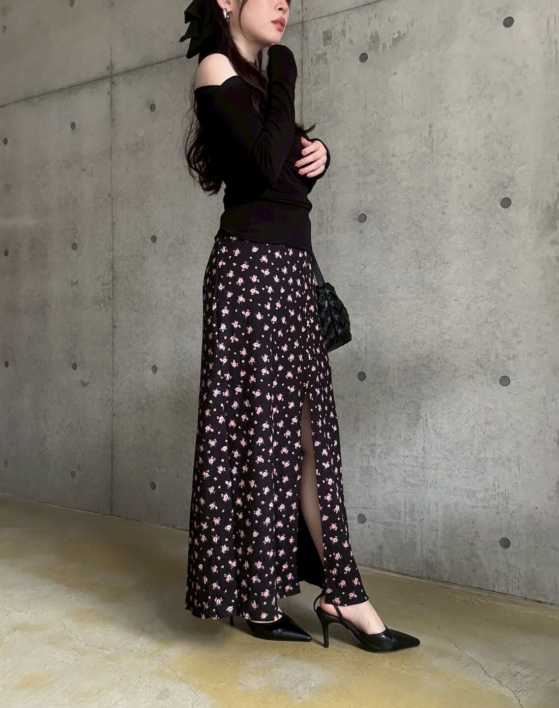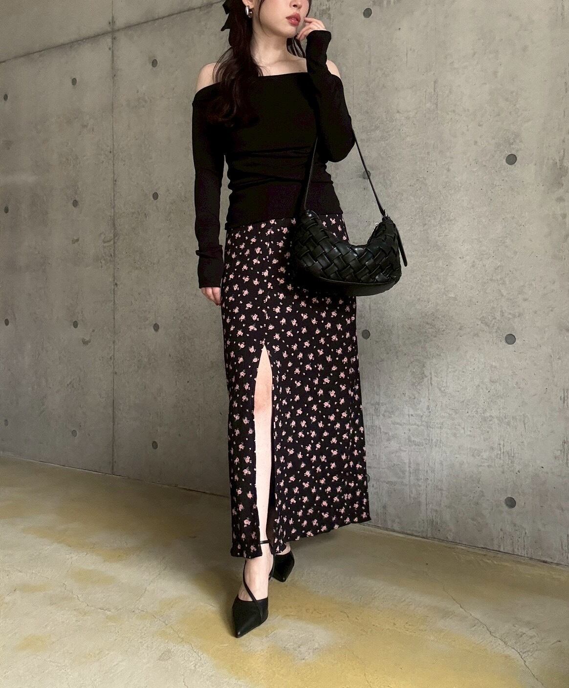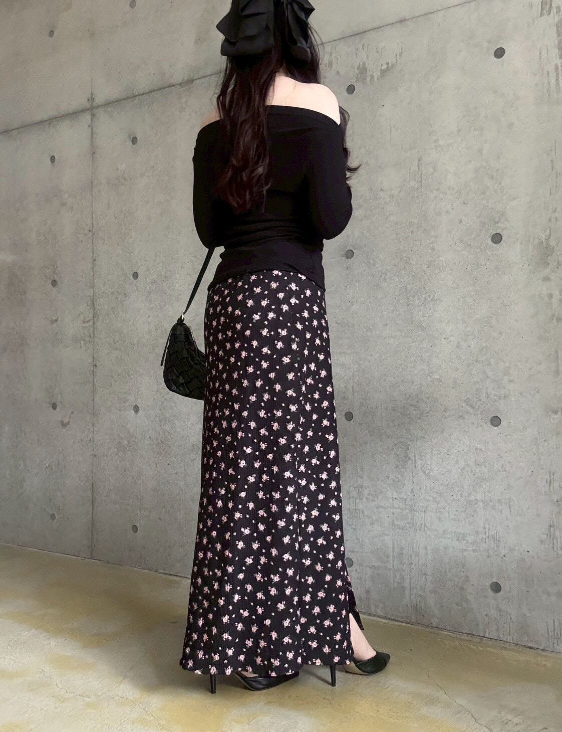 【4/4 21:00〜】小花柄ストレッチロングスカート【ブラック】