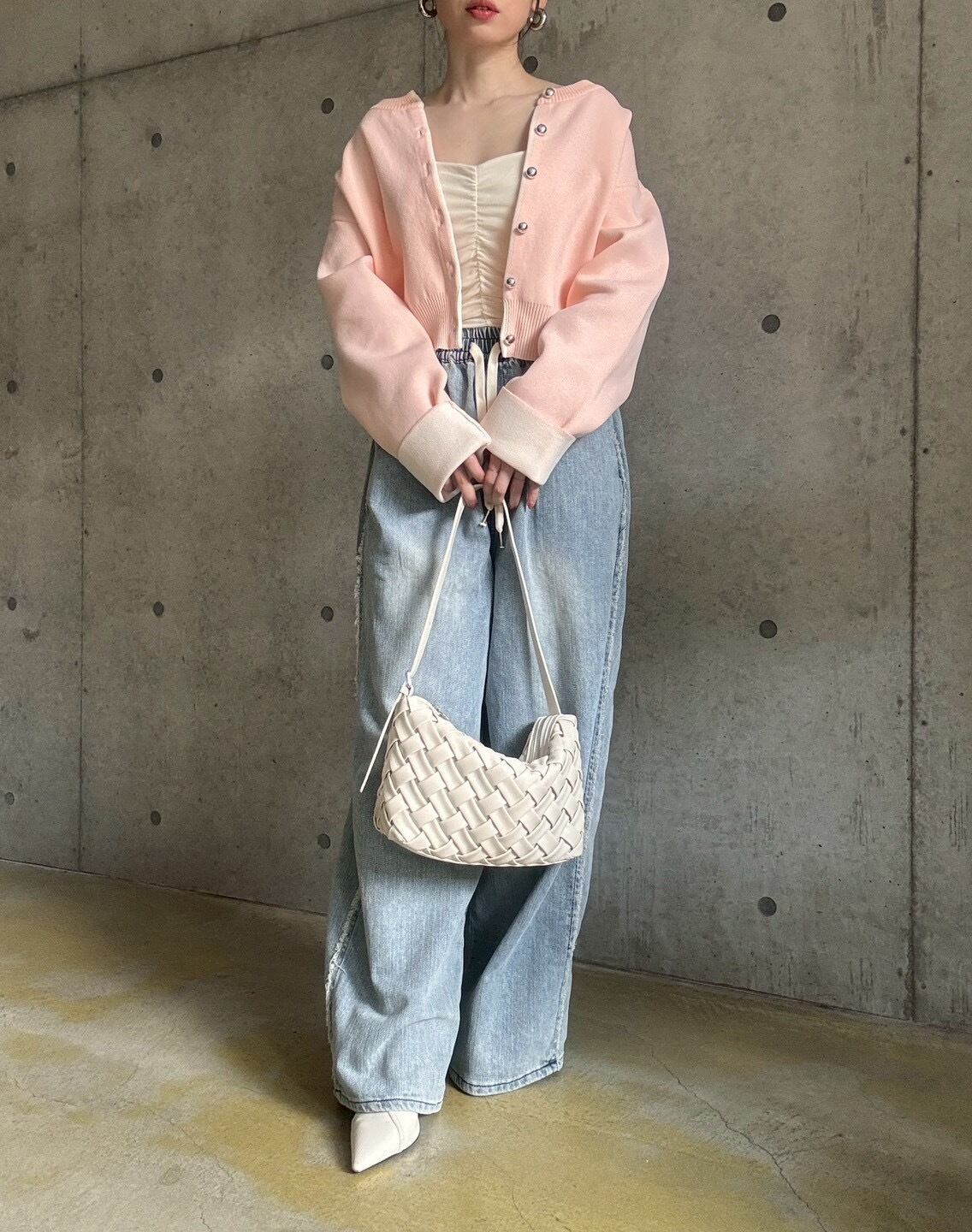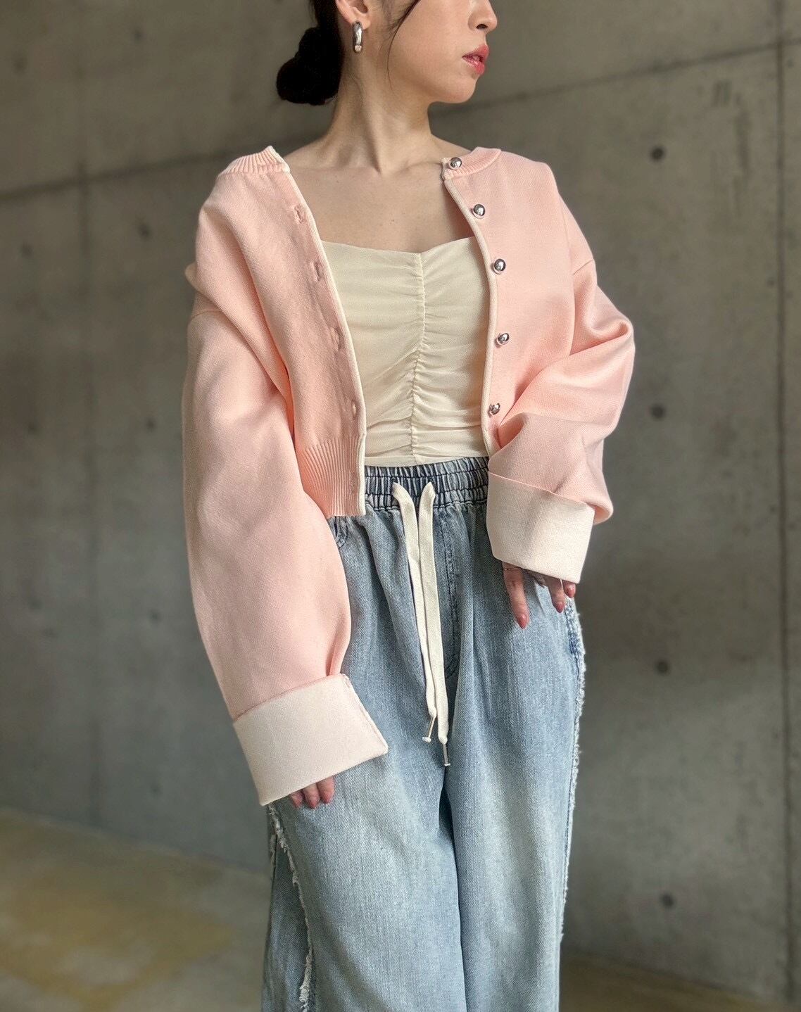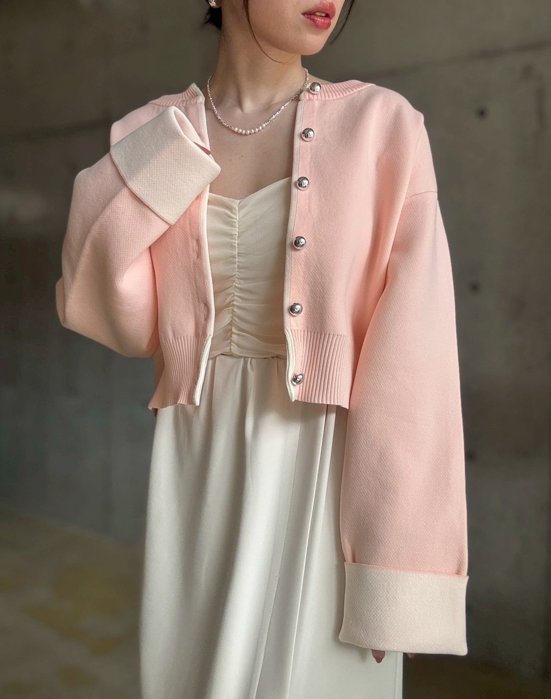 【4/11 21:00〜】シルバーボタン配色スポンジニットカーディガン【ピンク】