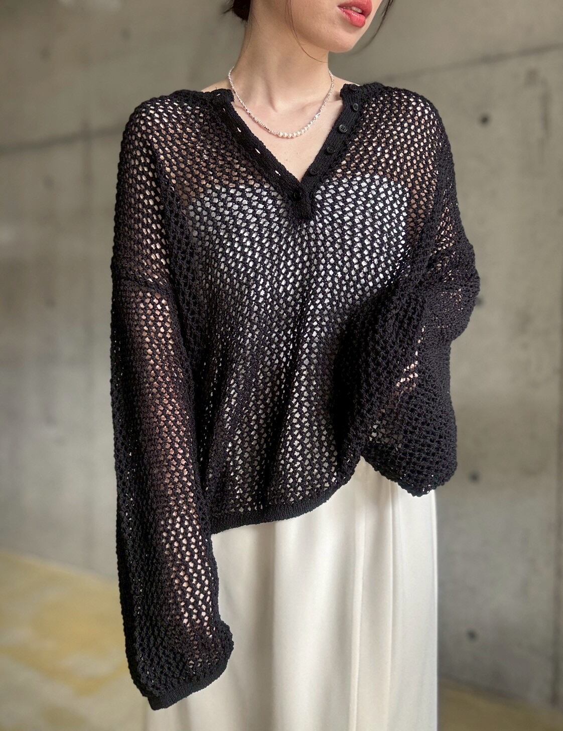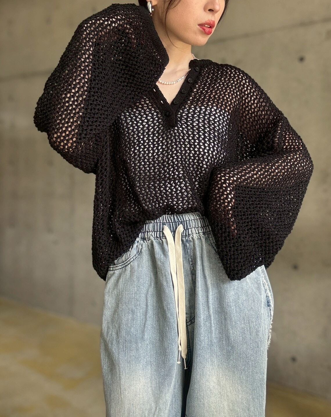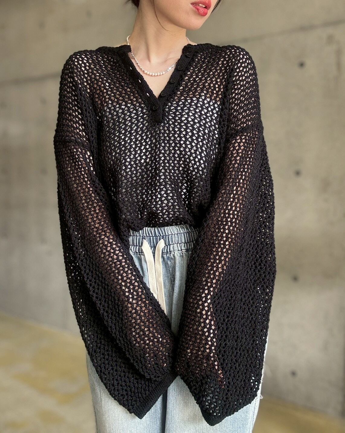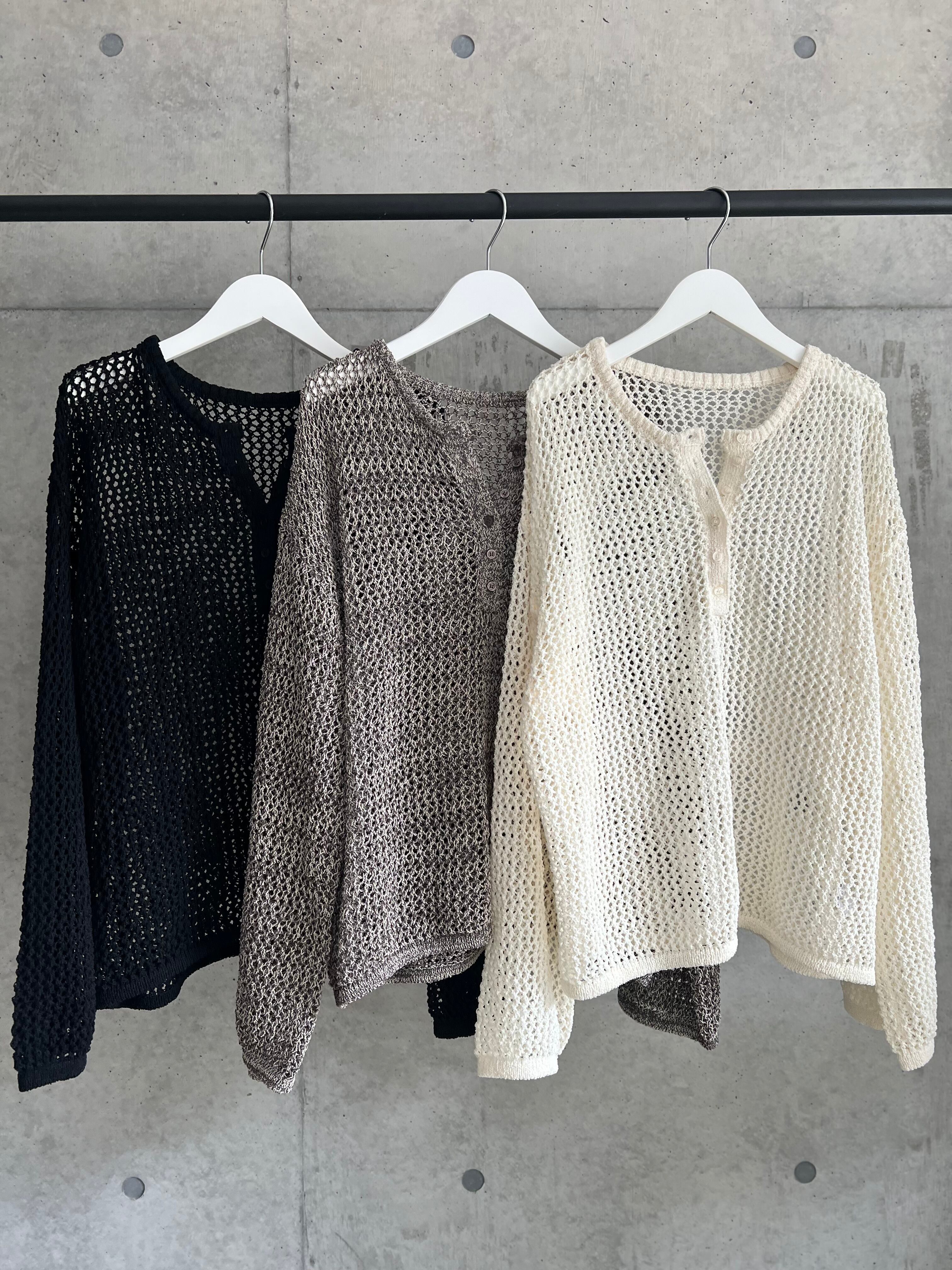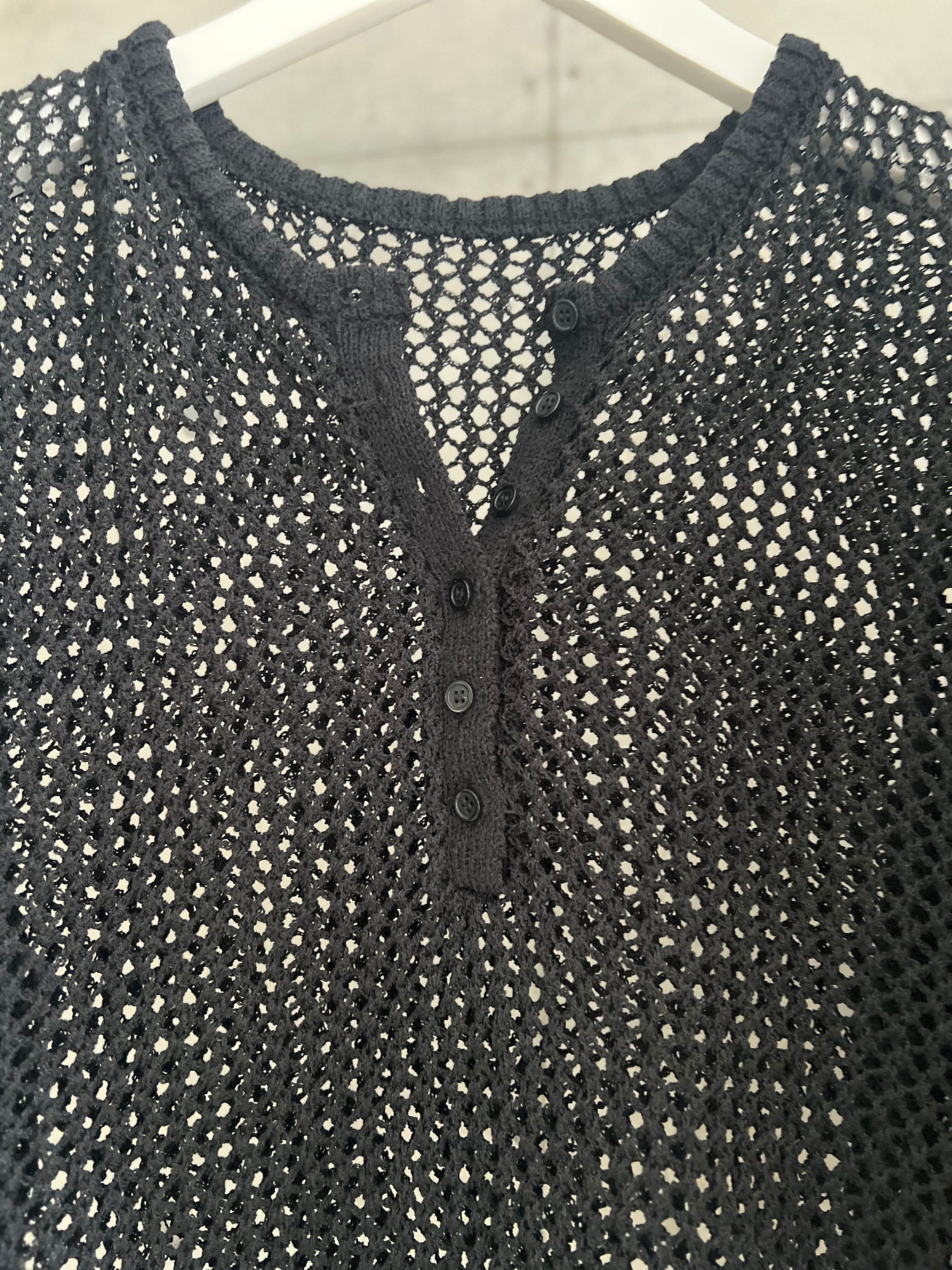 【4/11 21:00〜】メッシュ編みヘンリーネックプルオーバー【ブラック】