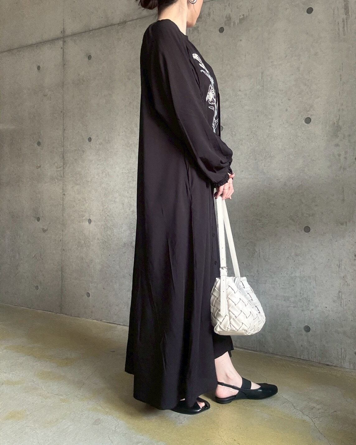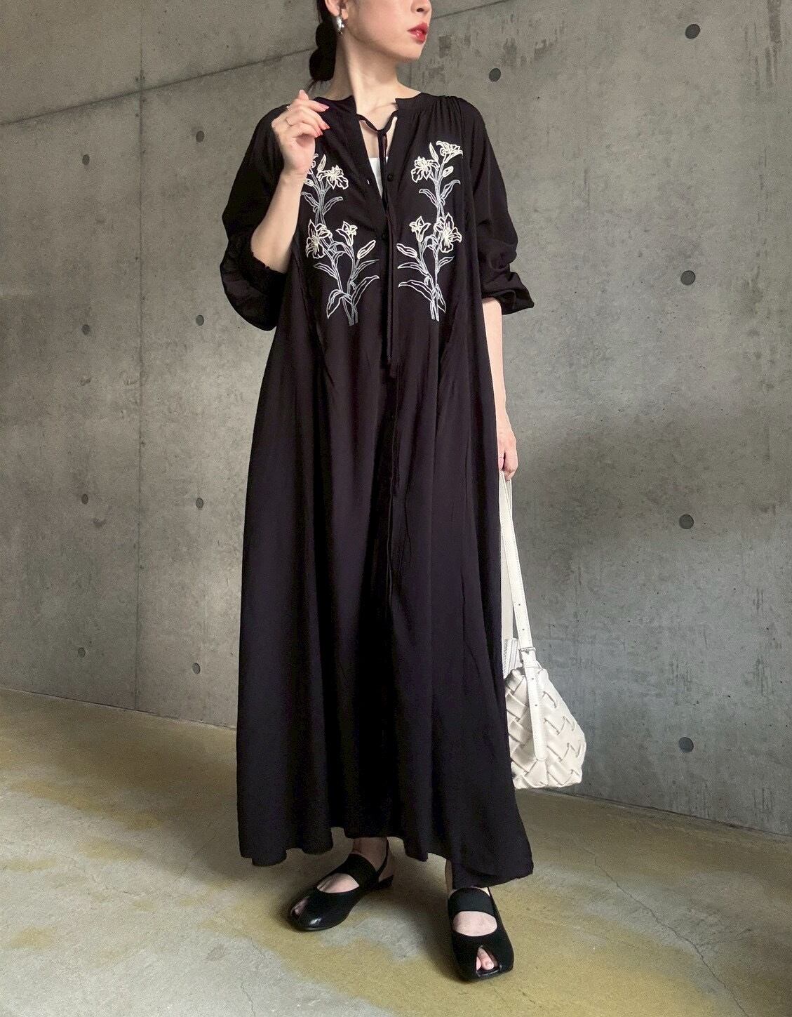 フラワー刺繍がポイント♪テロっとした落ち感のある生地を使用したロングワンピース✨